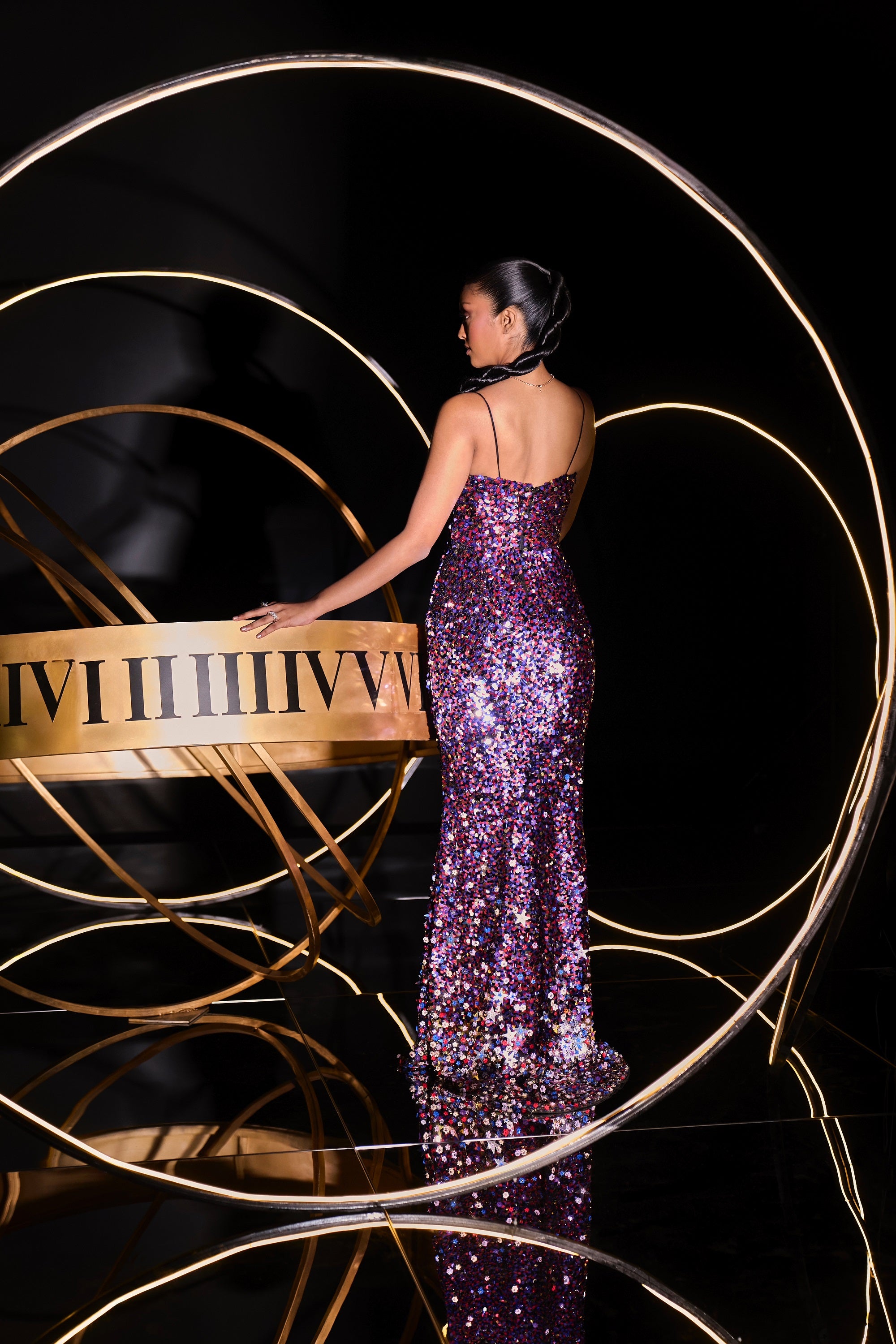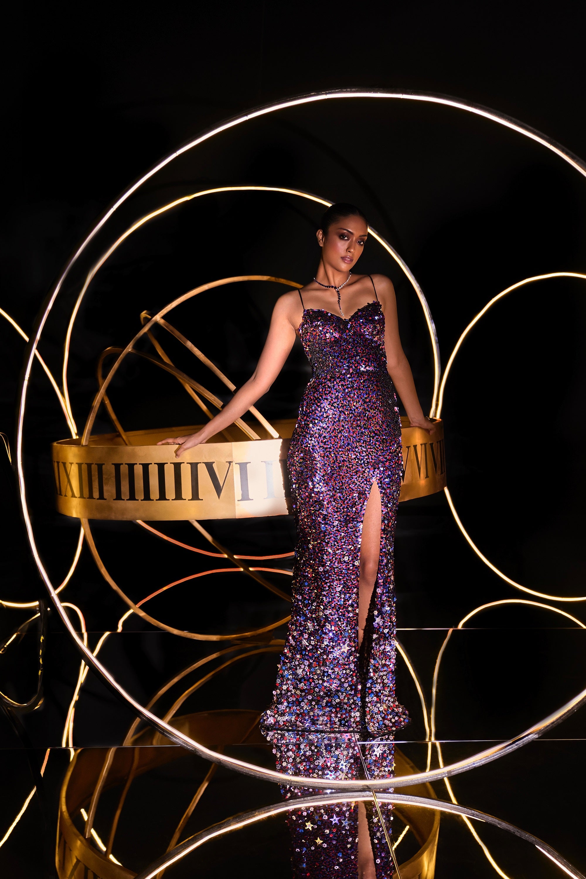 A SPARLING CORSET GOWN COMPLETELY EMBROIDERED BY HAND WITH SEQUINS CUT IN THE SHAPE OF STARS AND MODRN FLAKES AND CRYSTALS, IN MANY HUES OF THE SOLAR SYSTEM
