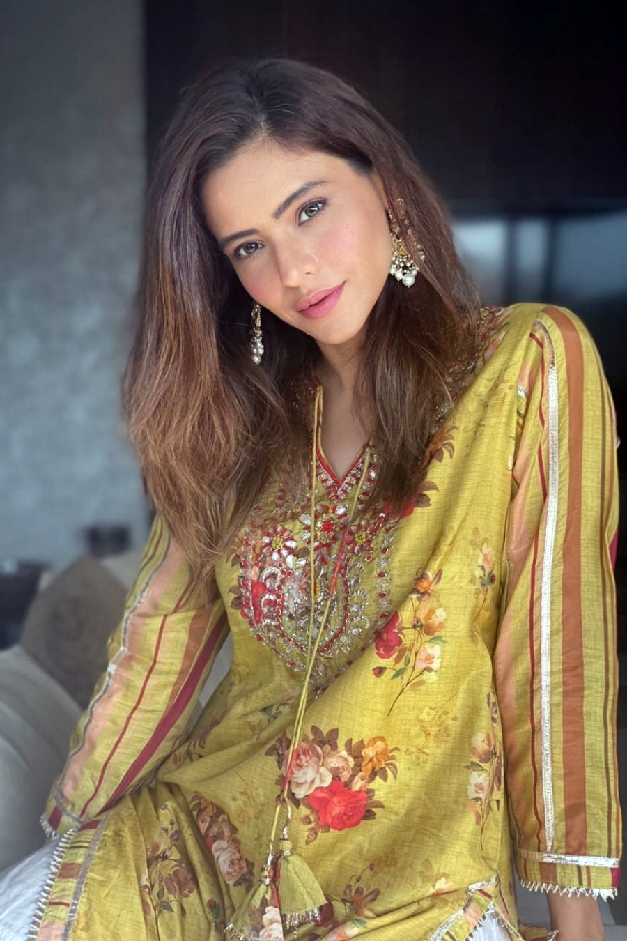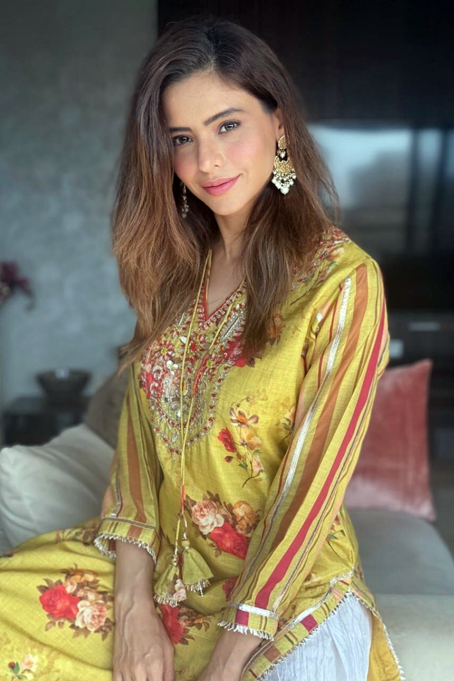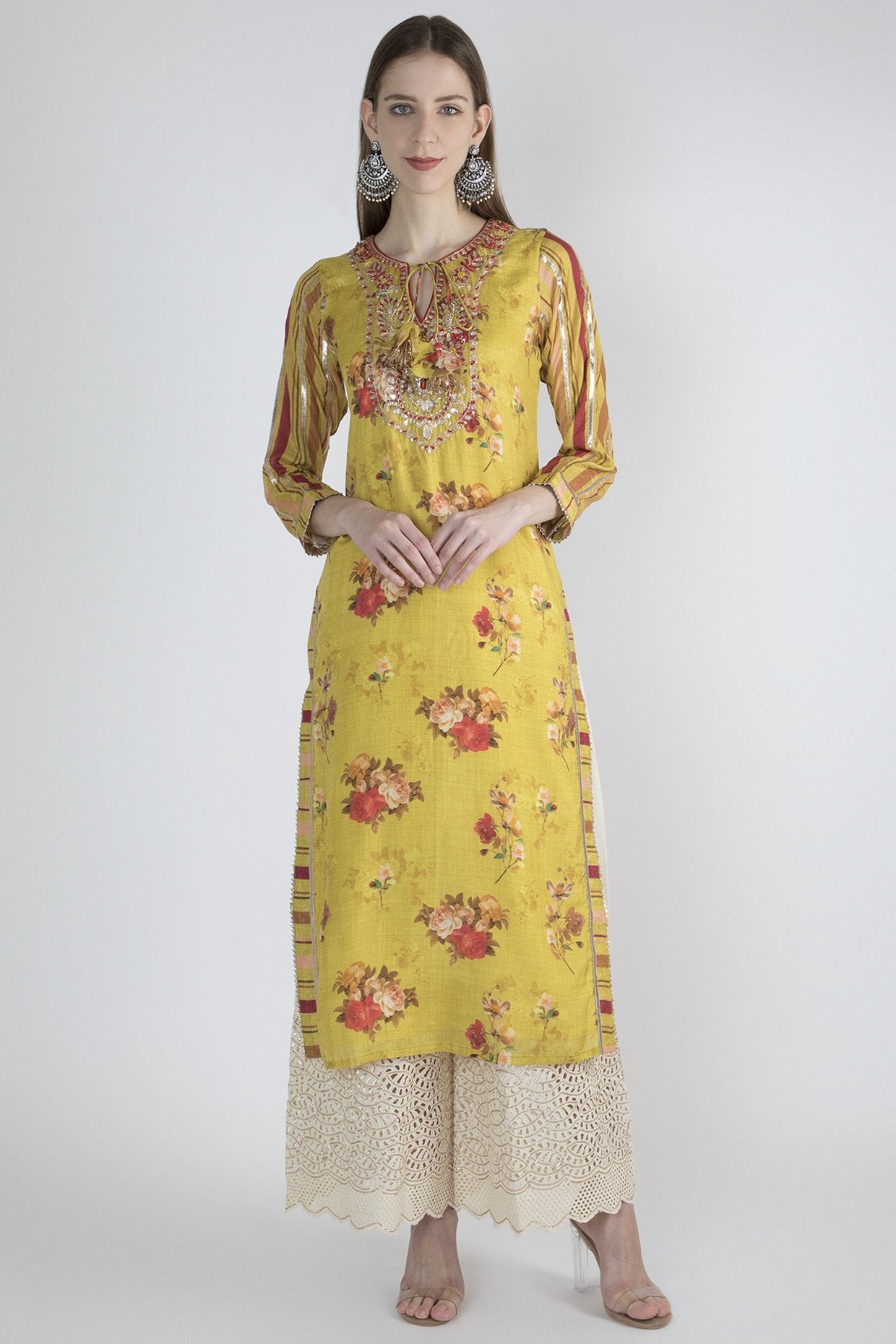 Featuring a yellow long tunic in chanderi base with floral motifs, yolk and gota embroidery.
