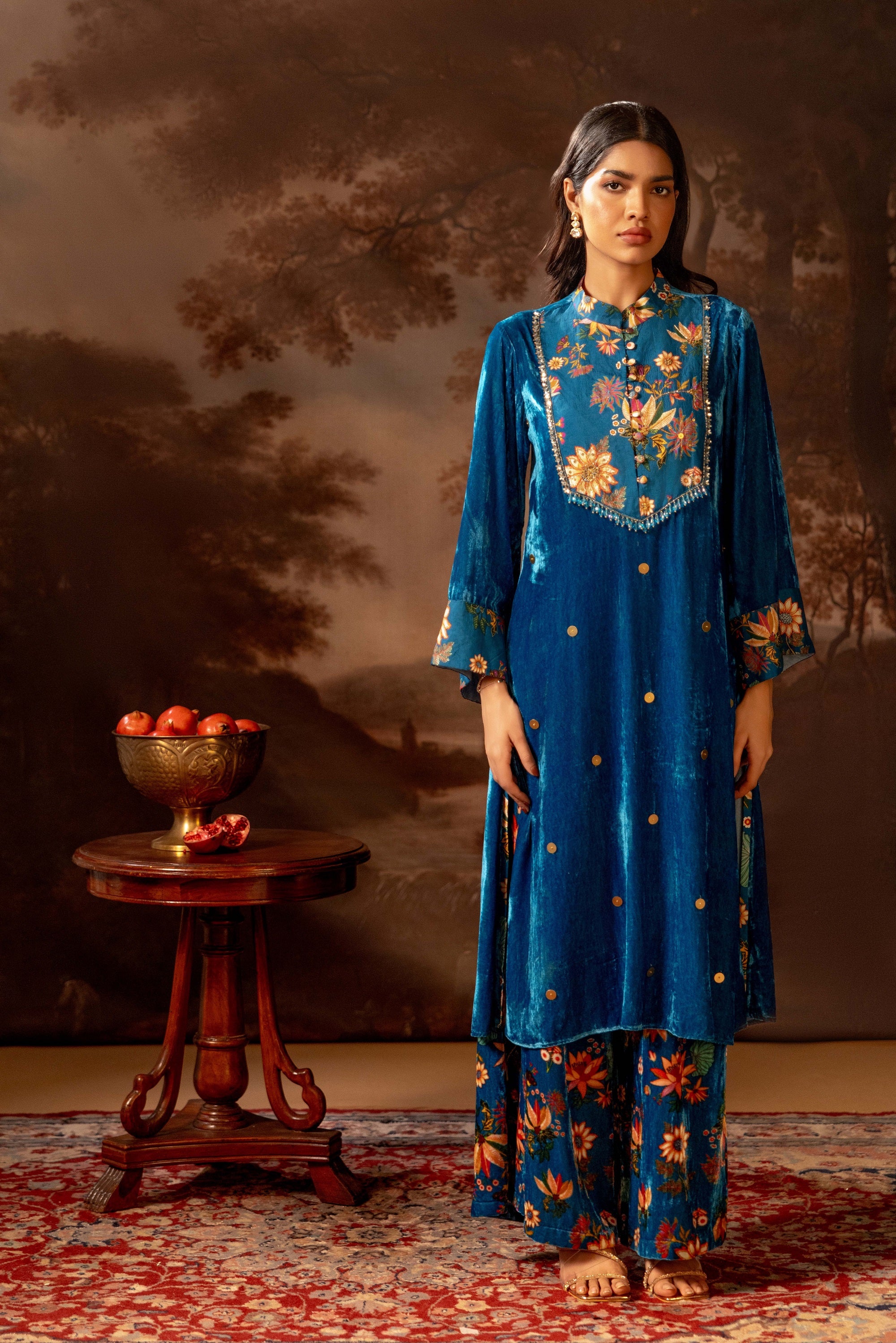 "Blue Aarani Embroidered Long Kurta Paired With Printed Velvet Pants.