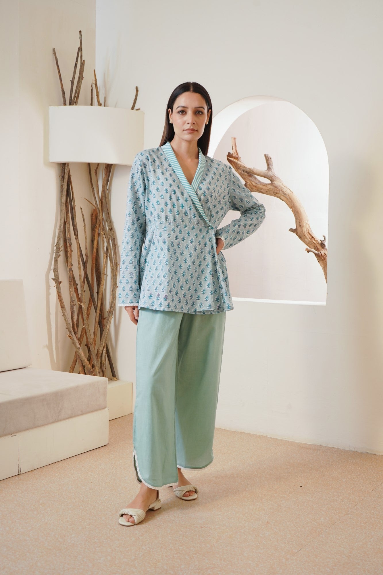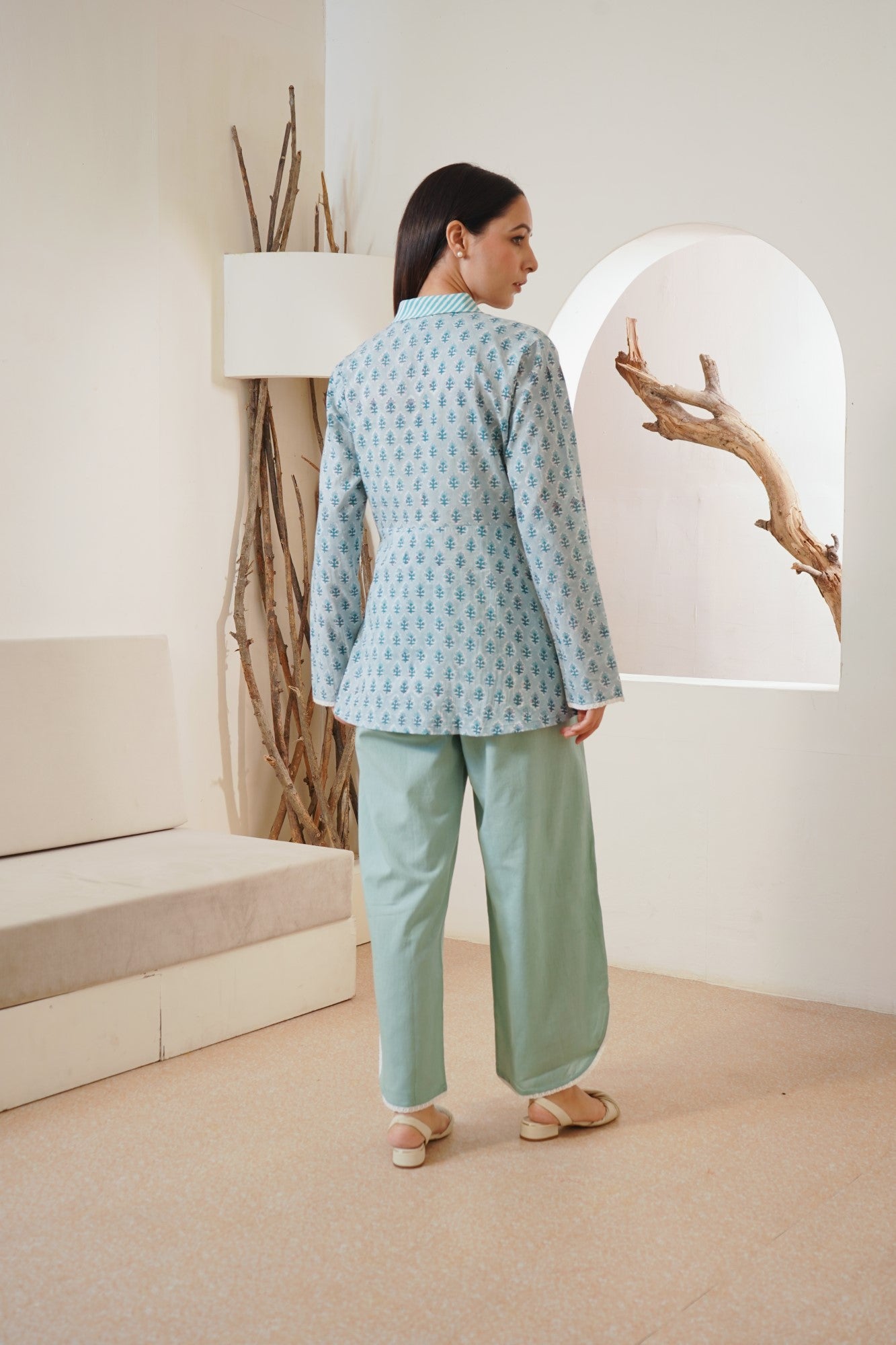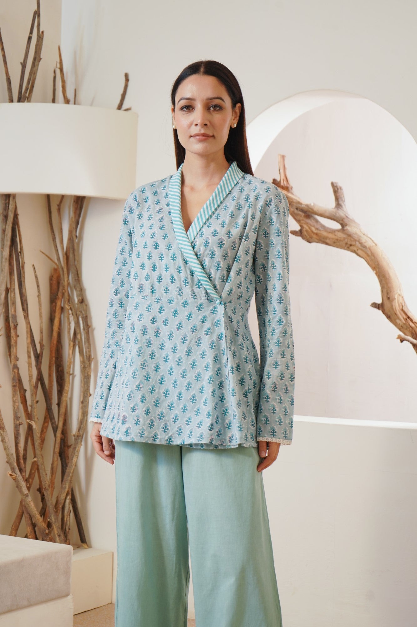 -Top in Aqua Blue Hand Block Printed Cotton Fabric with a Stripe print shawl collar beautifying the look.