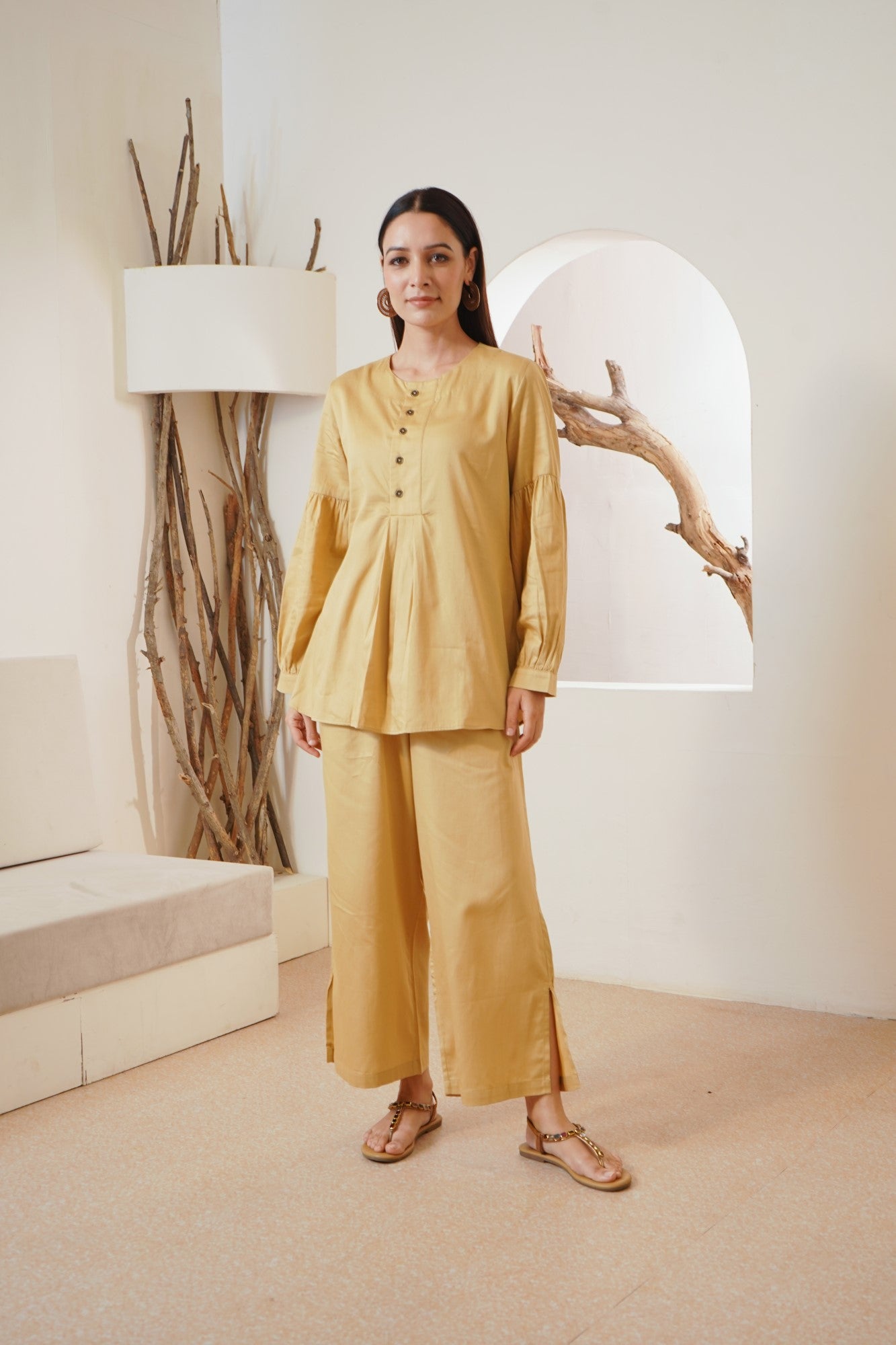 -Paired with pants in Fawn Cotton Satin fabric with elasticated waistband and long slit.