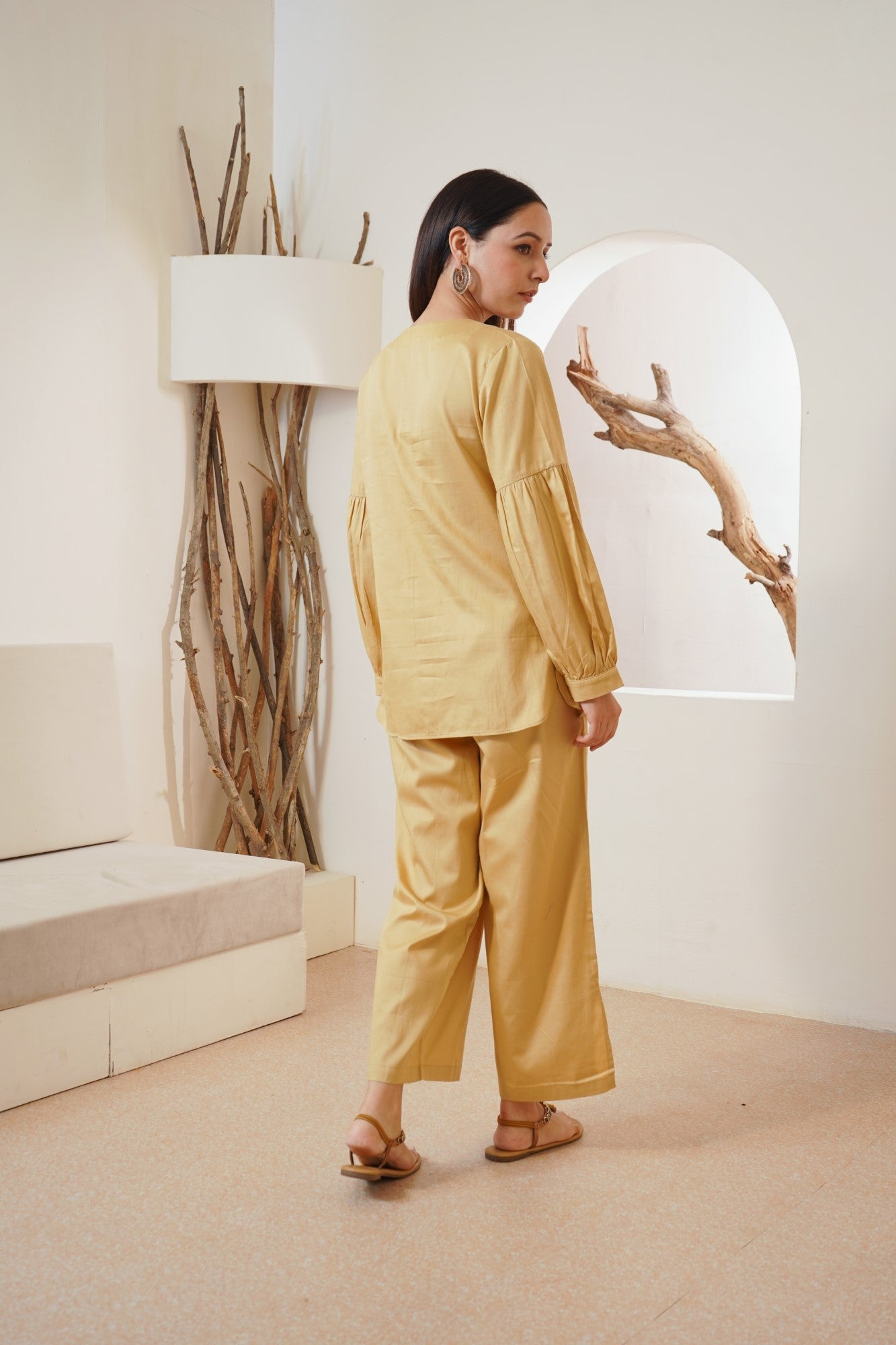 -Top in Fawn Cotton Satin Fabric with a placket and gathered sleeves beautifying the look.