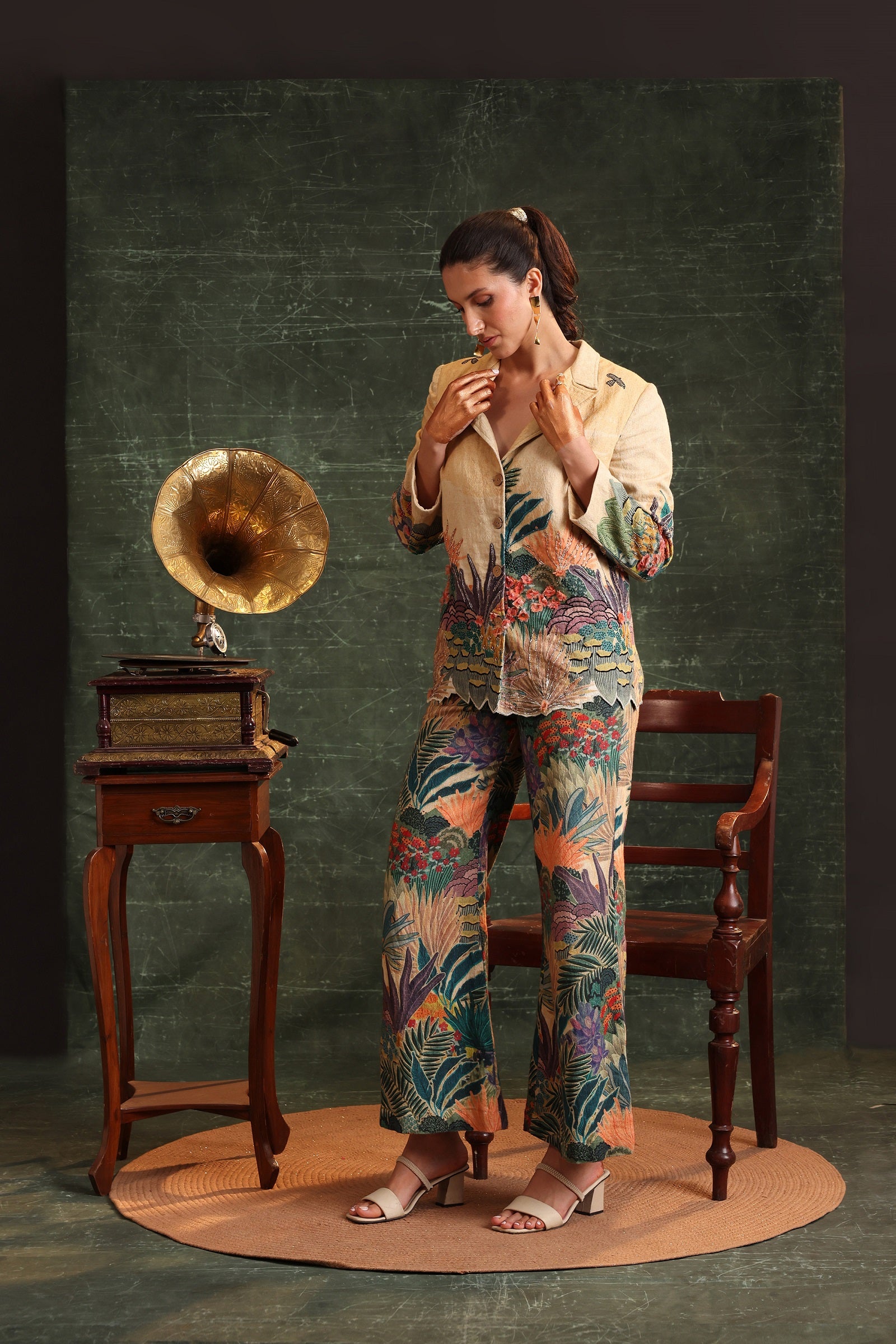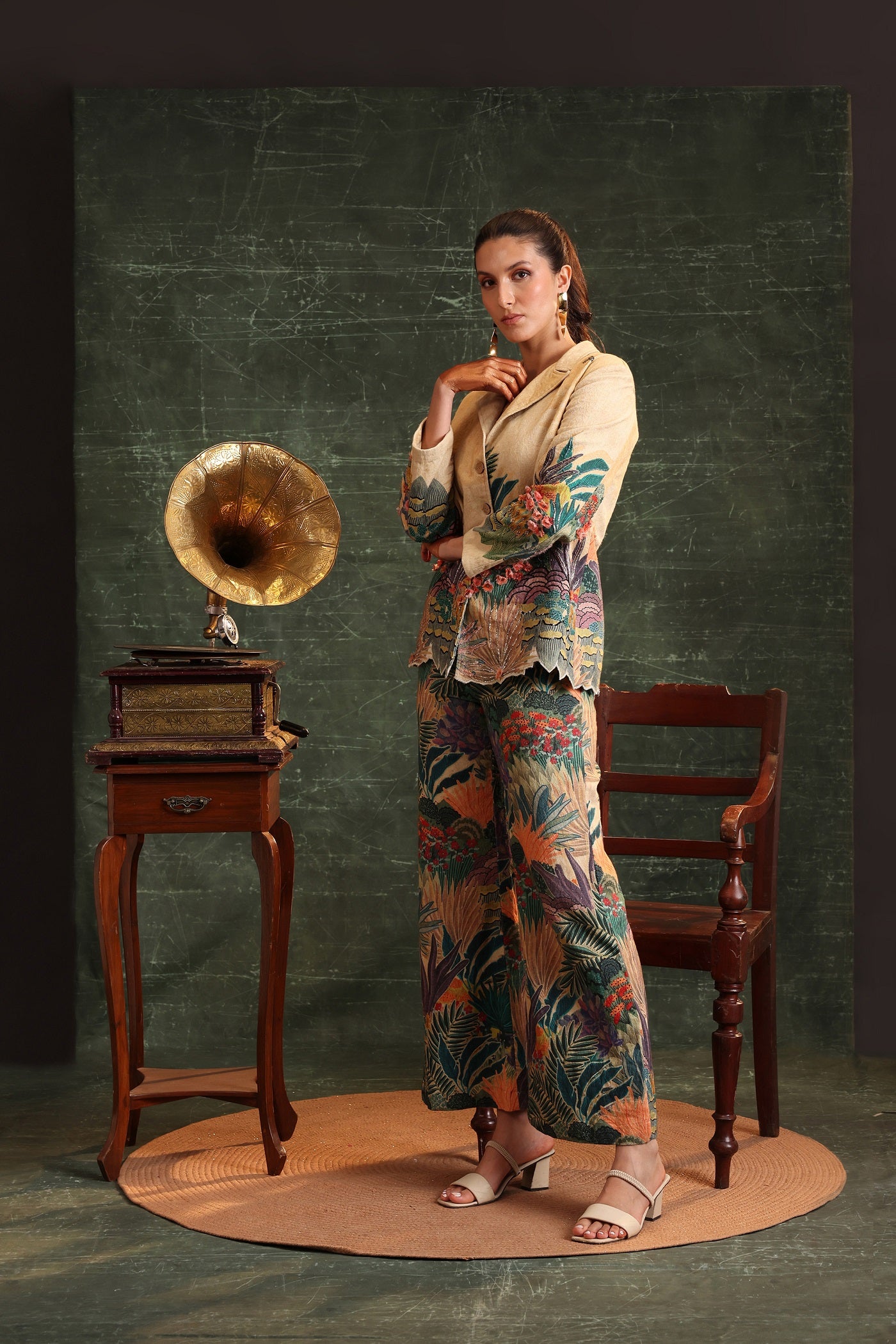 "Beige Kaira Embroidered Blazer with Cutwork Hem Paired with Printed Straight Pants in Cotton