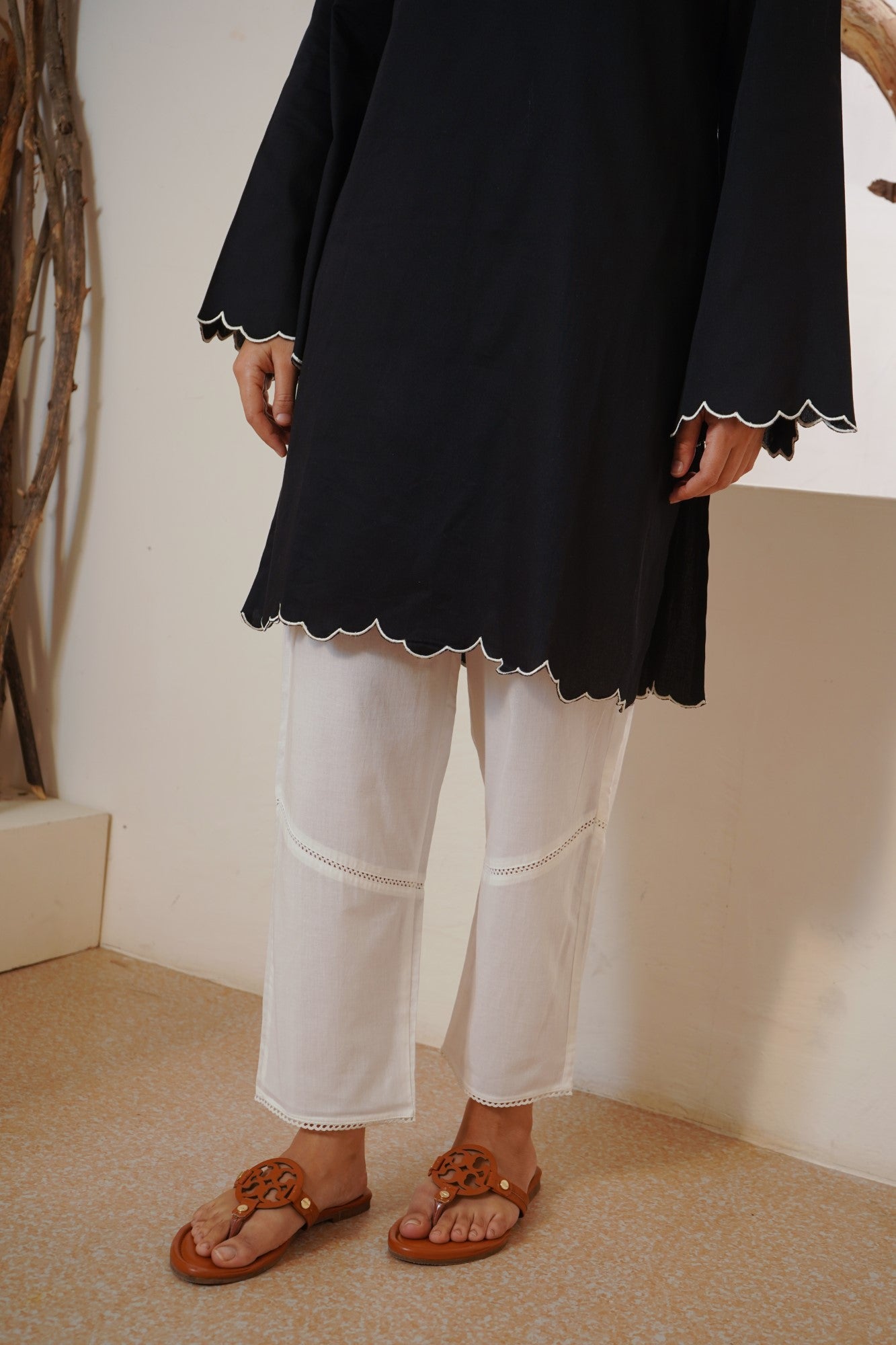 -Paired with pants in White Pure Cotton fabric embellished with laces and elasticated waistband.