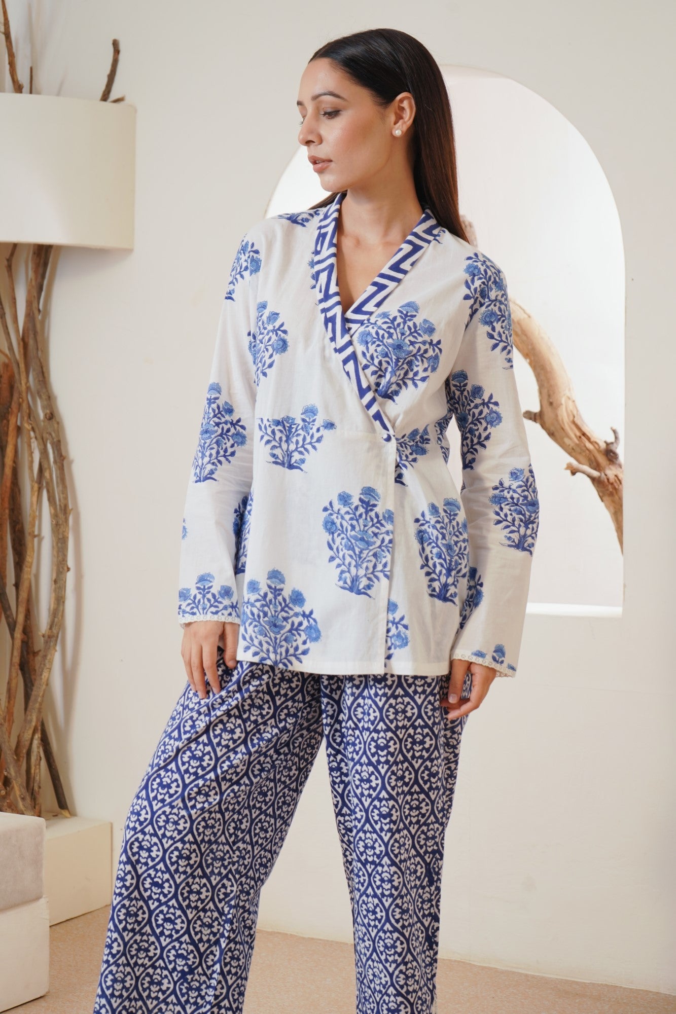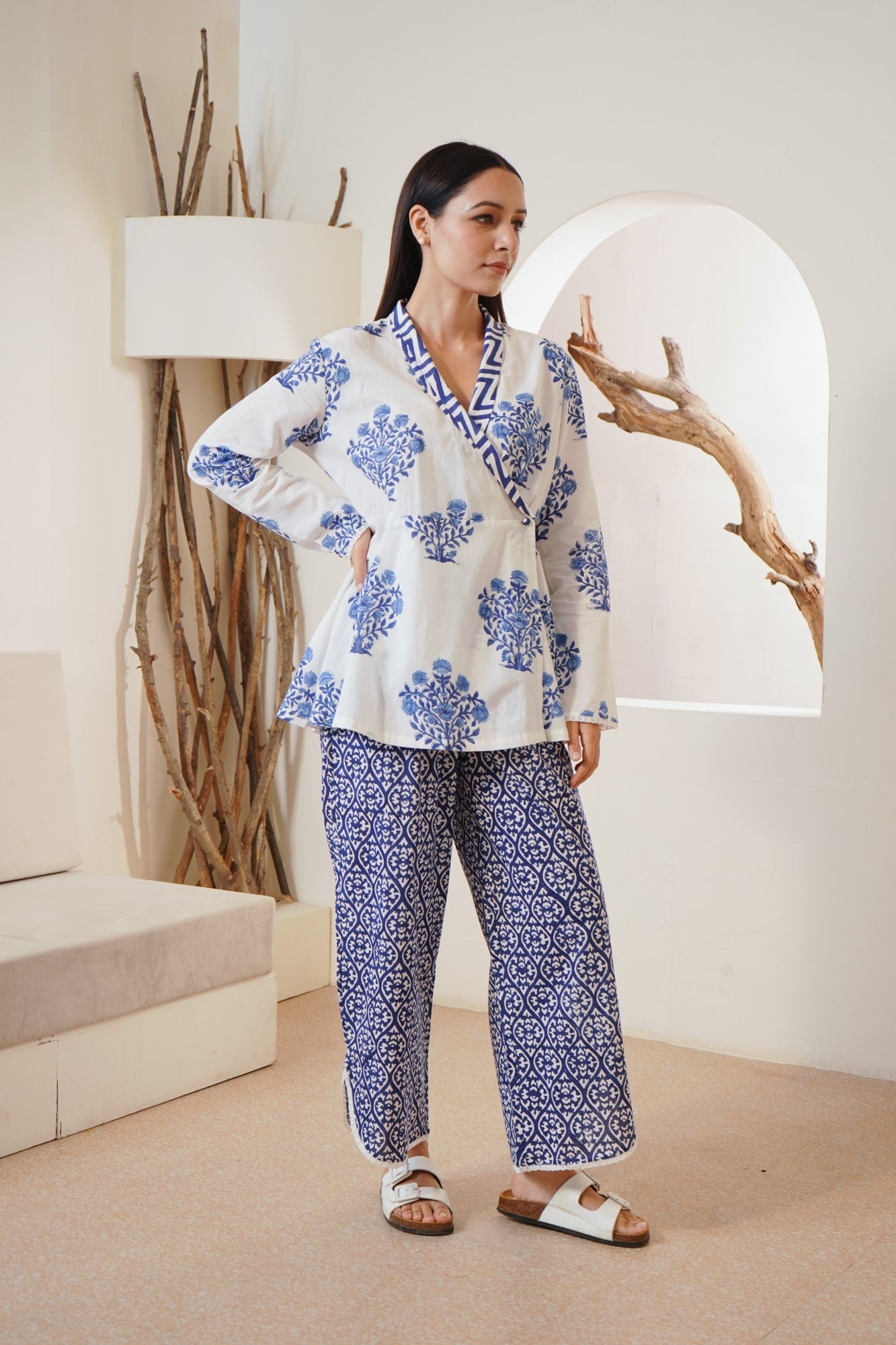 -Top in Indigo Buta Hand Block Printed Cotton Fabric with a Chevron shawl collar beautifying the look.