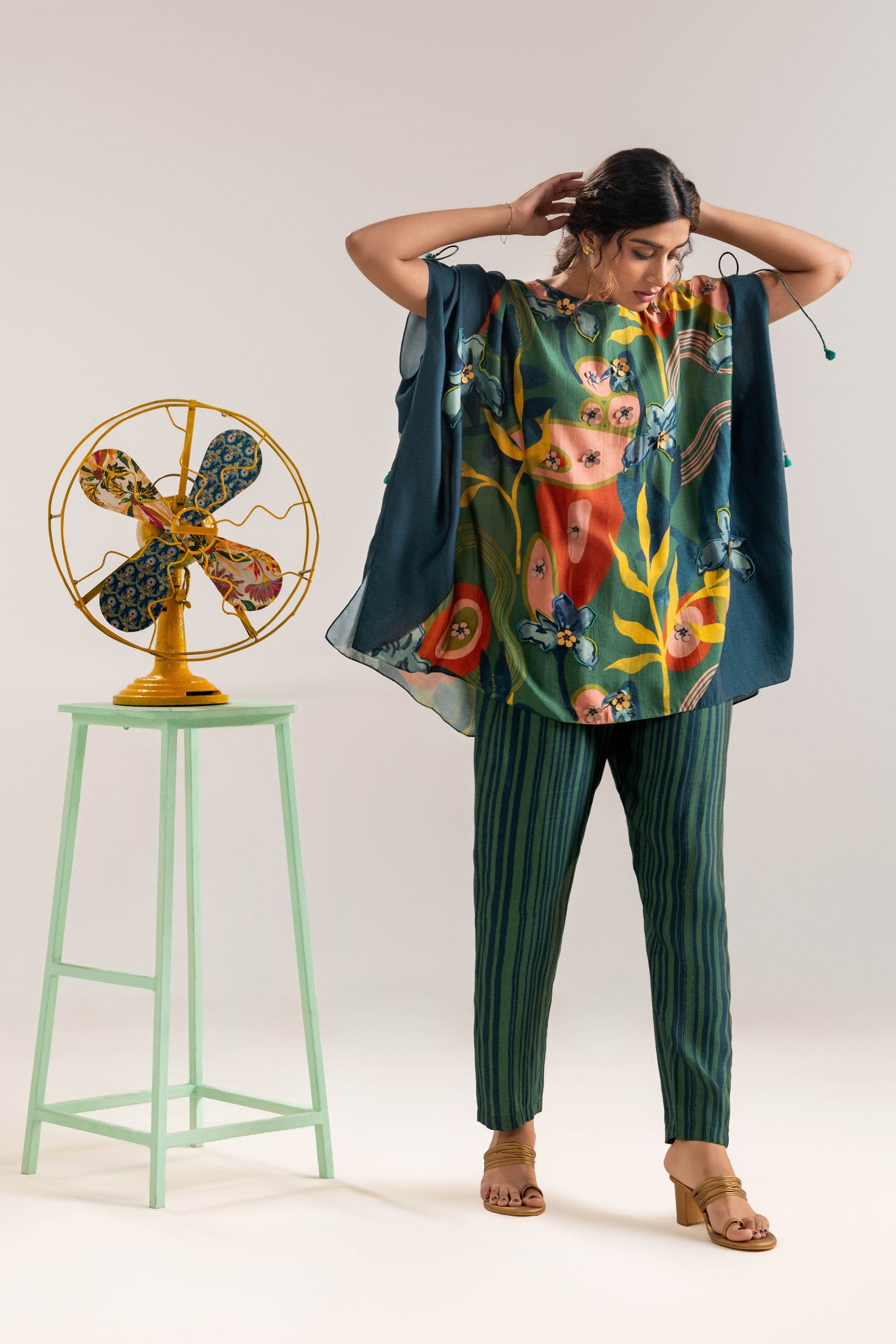 Green Flora Embellished Shirt, Paired With Printed Chanderi Pants