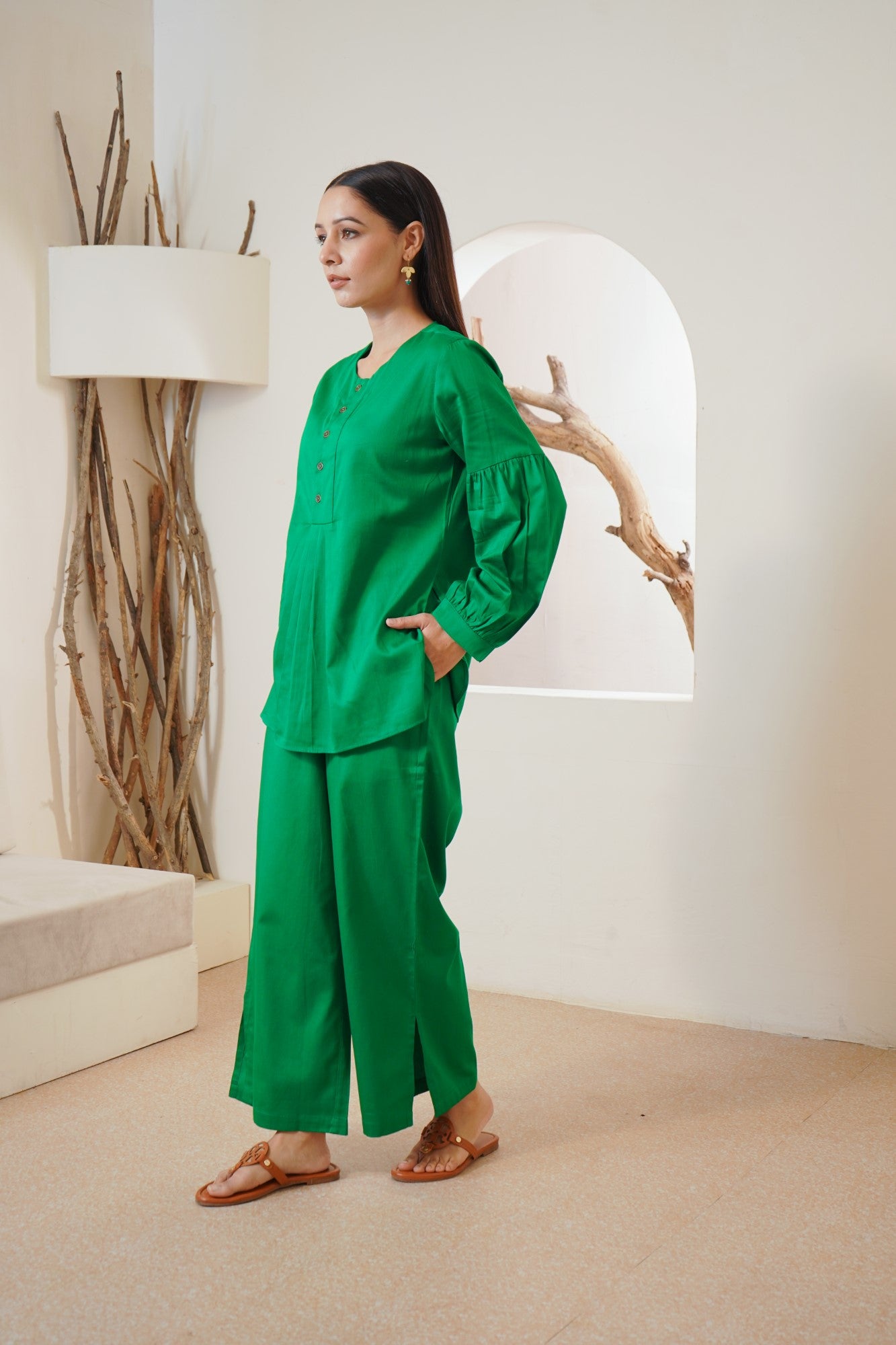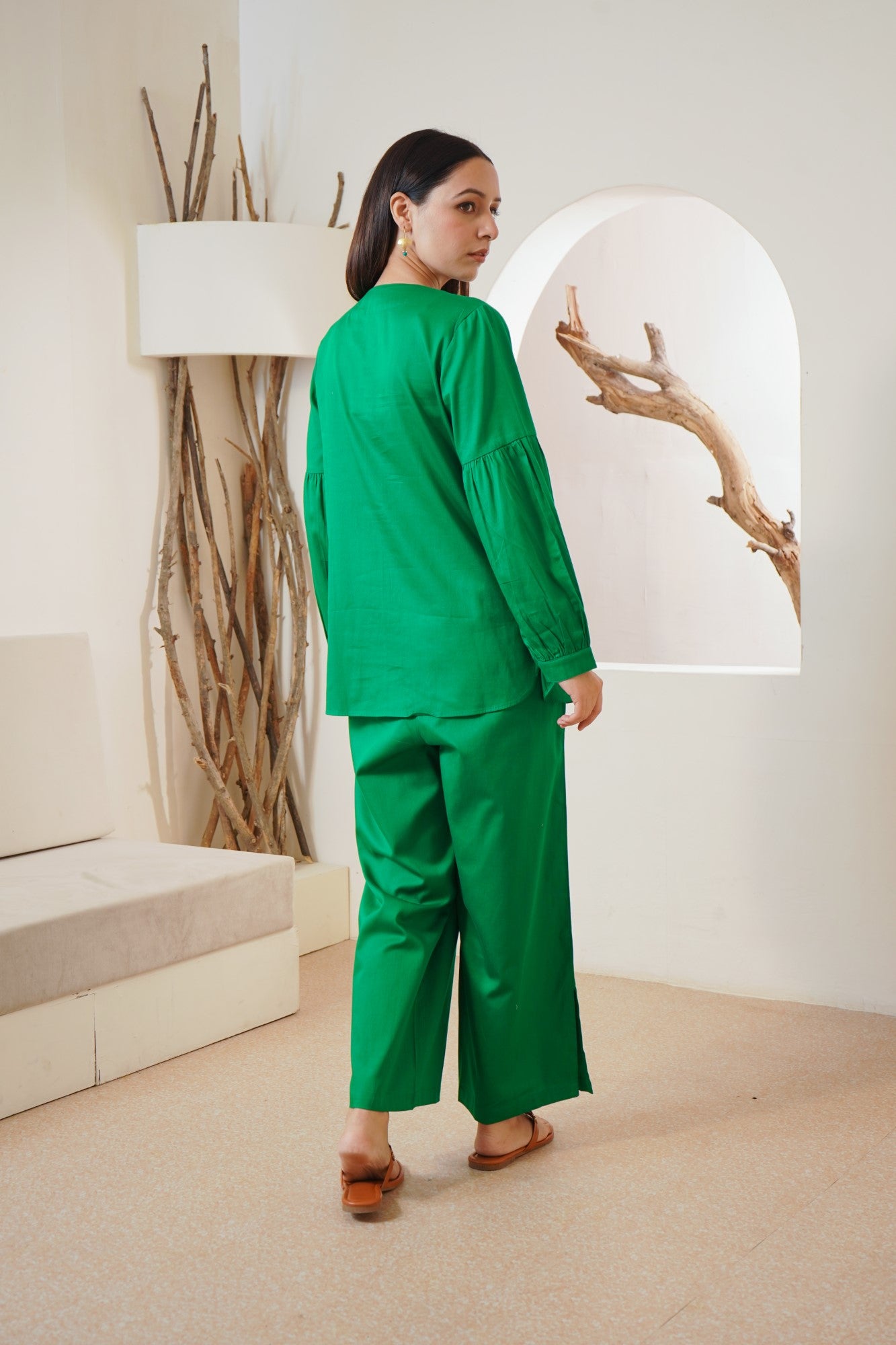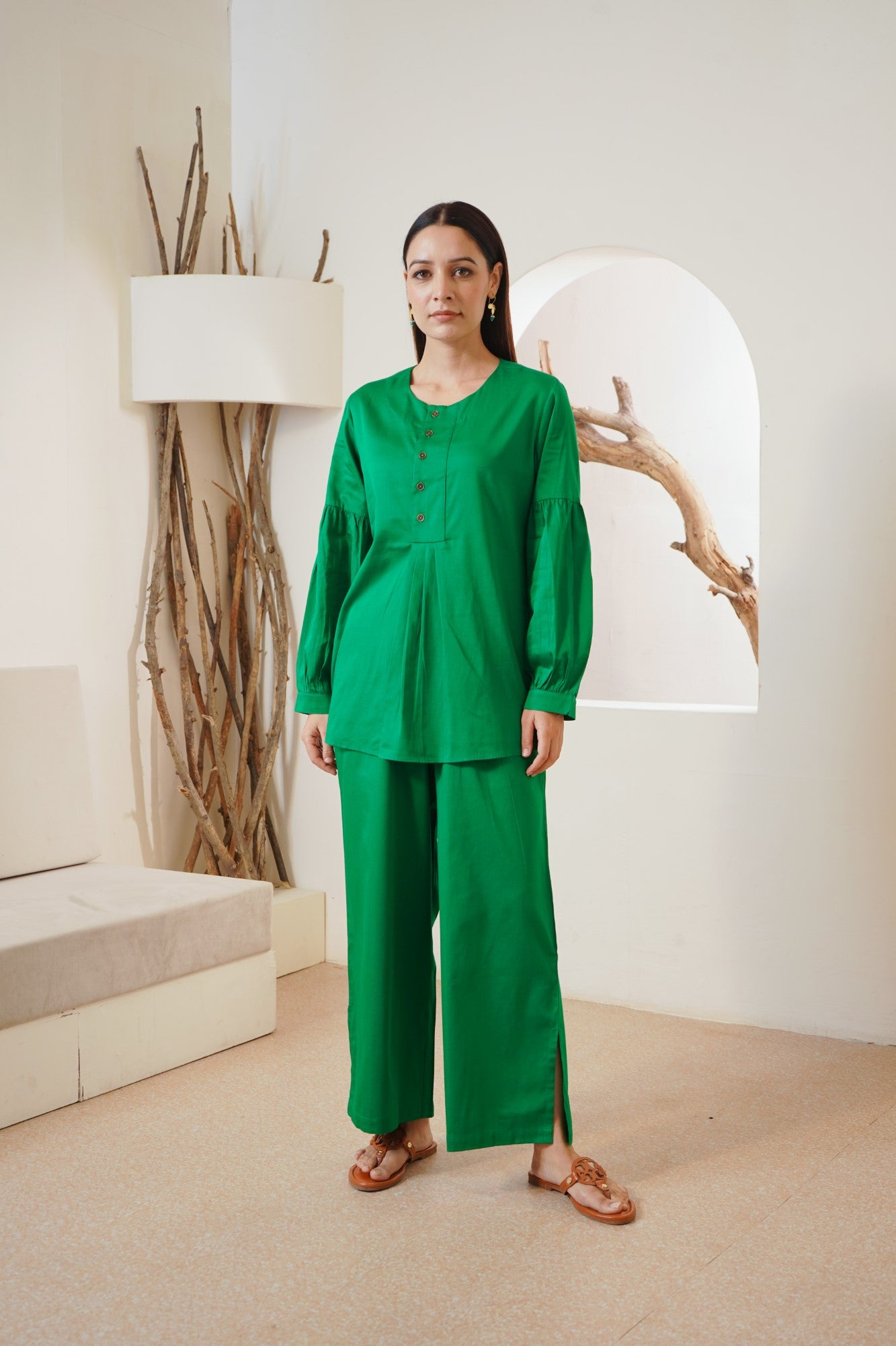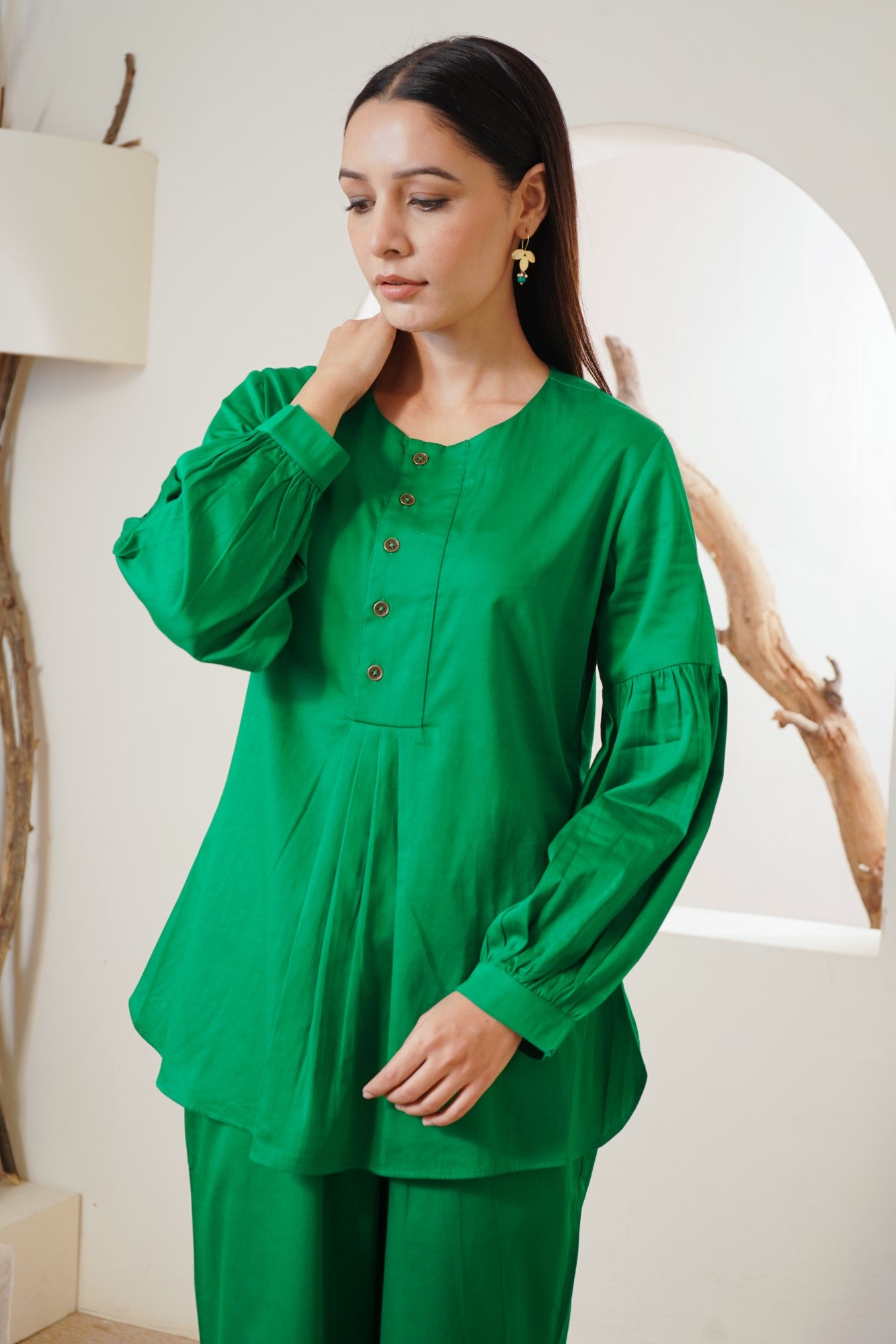 -Top in Forest Green Cotton Satin Fabric with a placket and gathered sleeves beautifying the look.