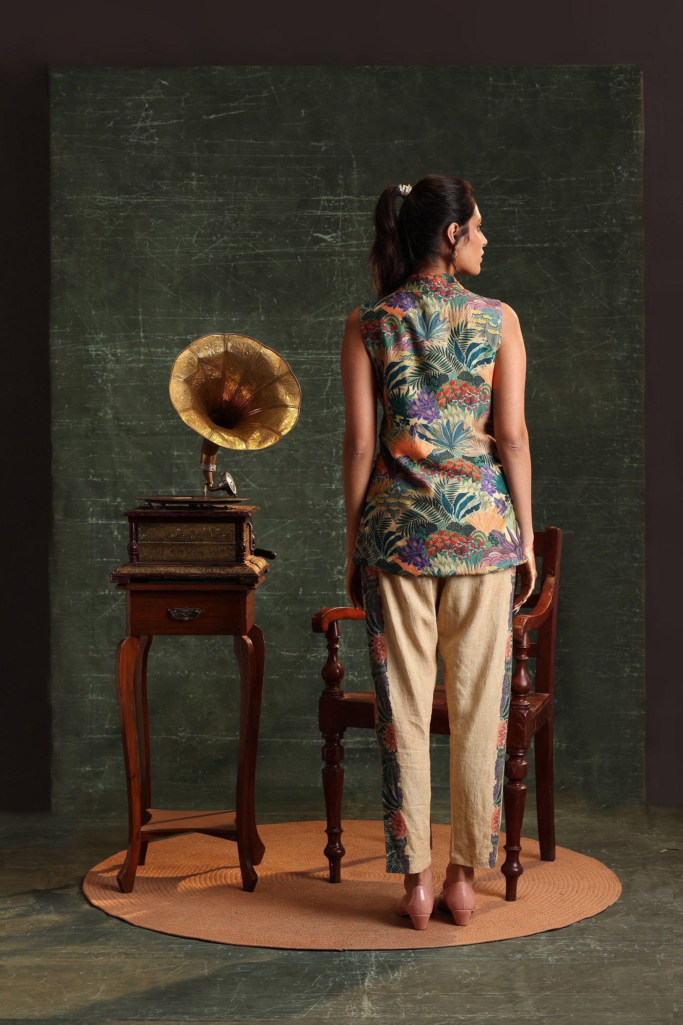 "Multicolor Kaira Printed Sleeveless Blazer Top paired with Cotton Pants.