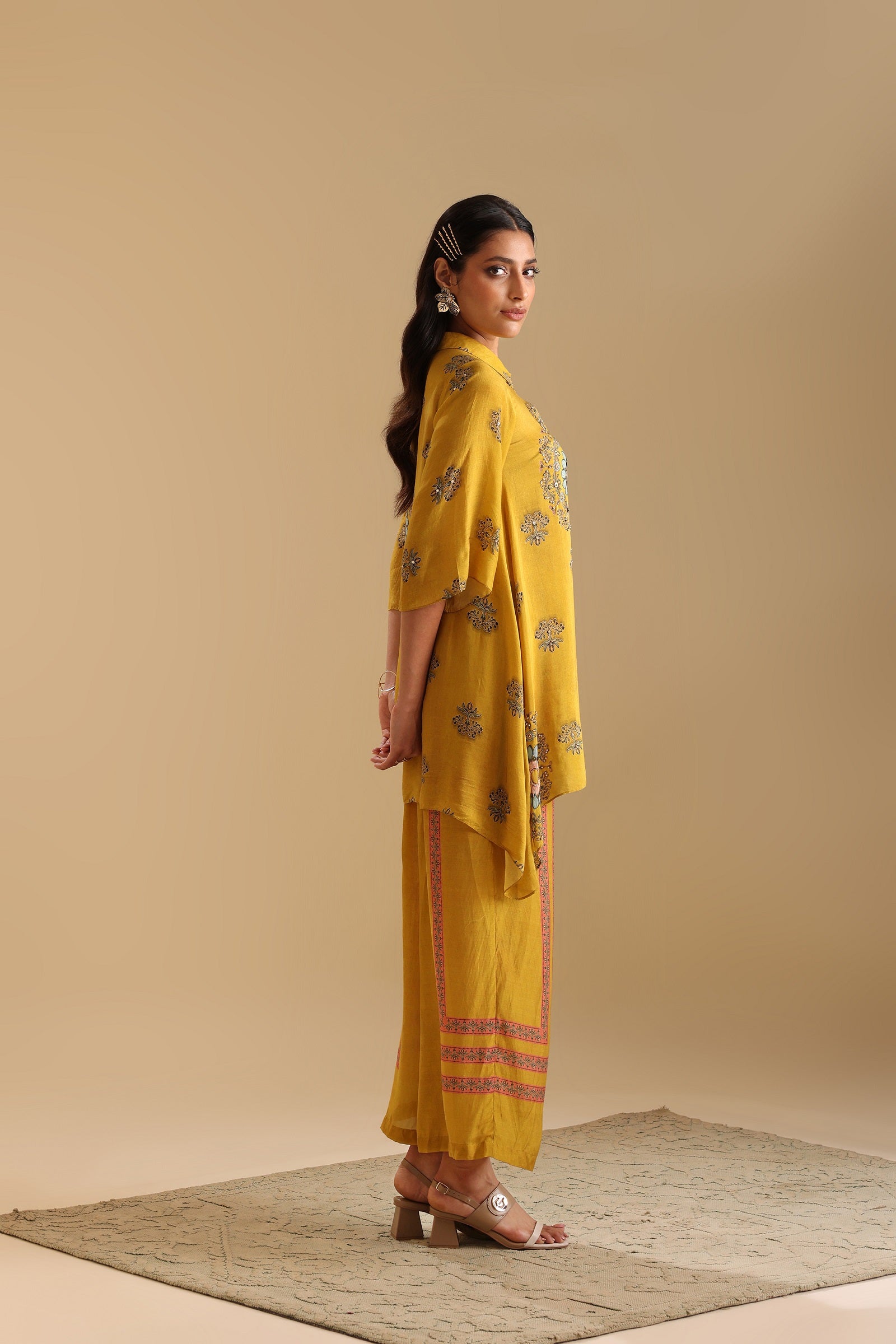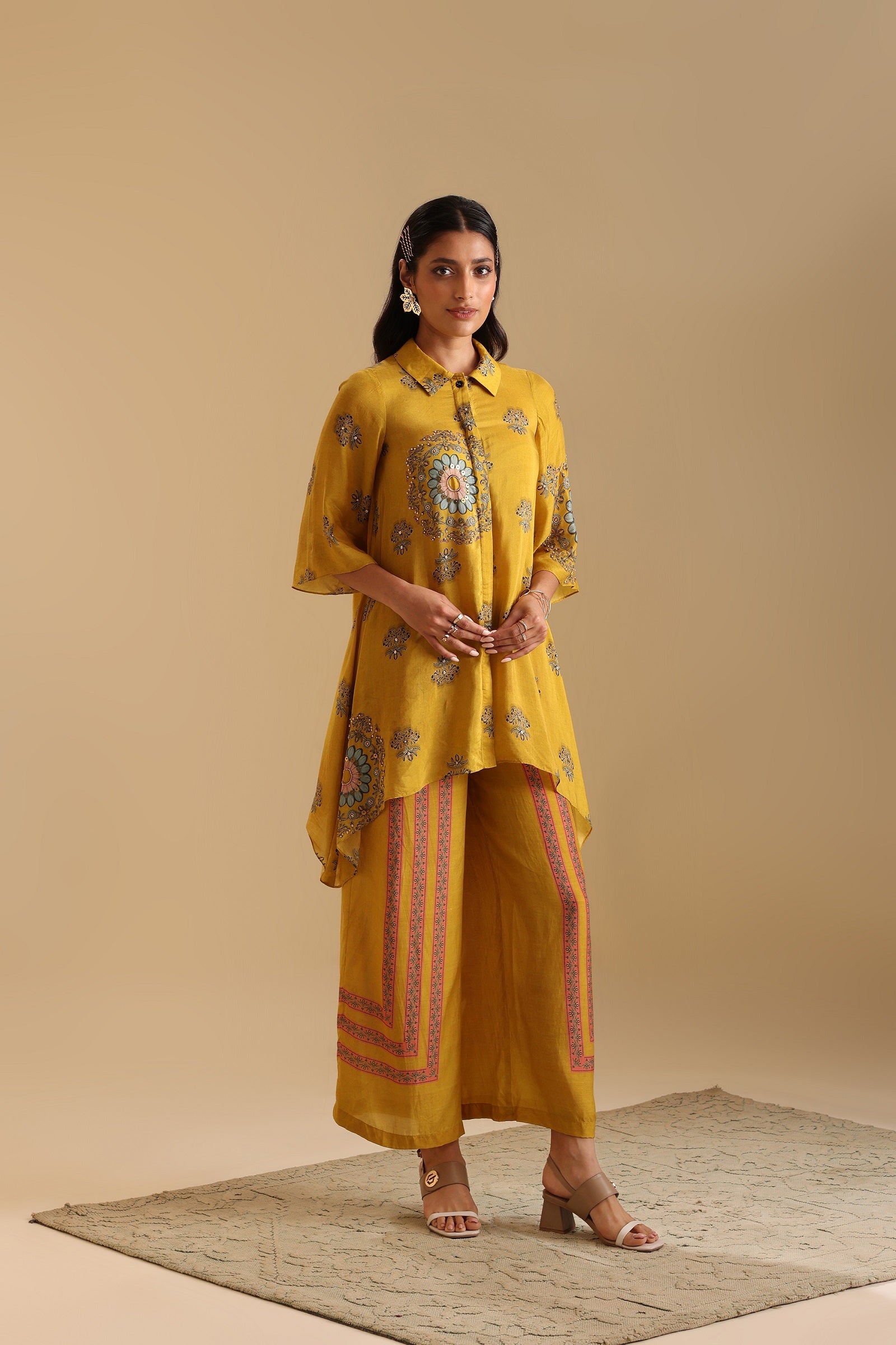 "Yellow Eraya embellished cotton silk shirt-style co-ord set