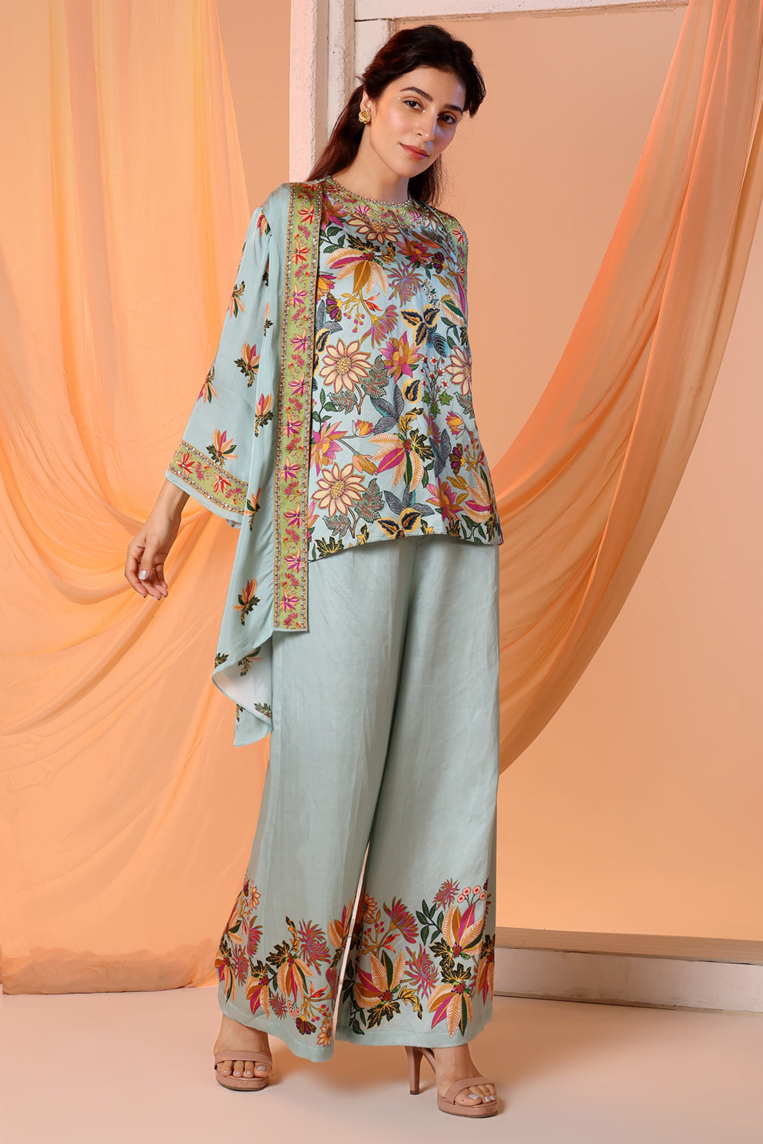 Blue Aarani Printed Top and Flared Pants in Satin, Paired with an Embroidered Organza Jacket.