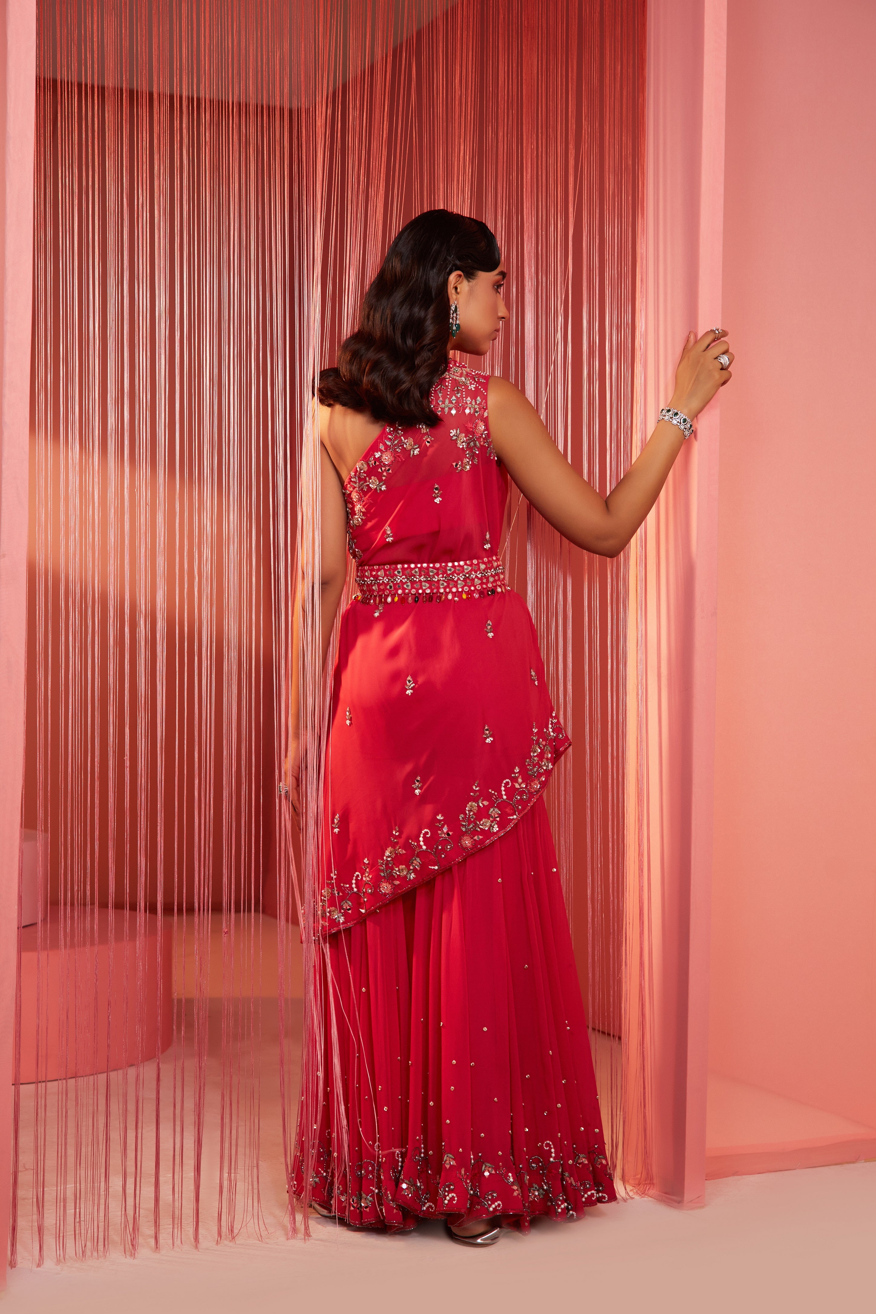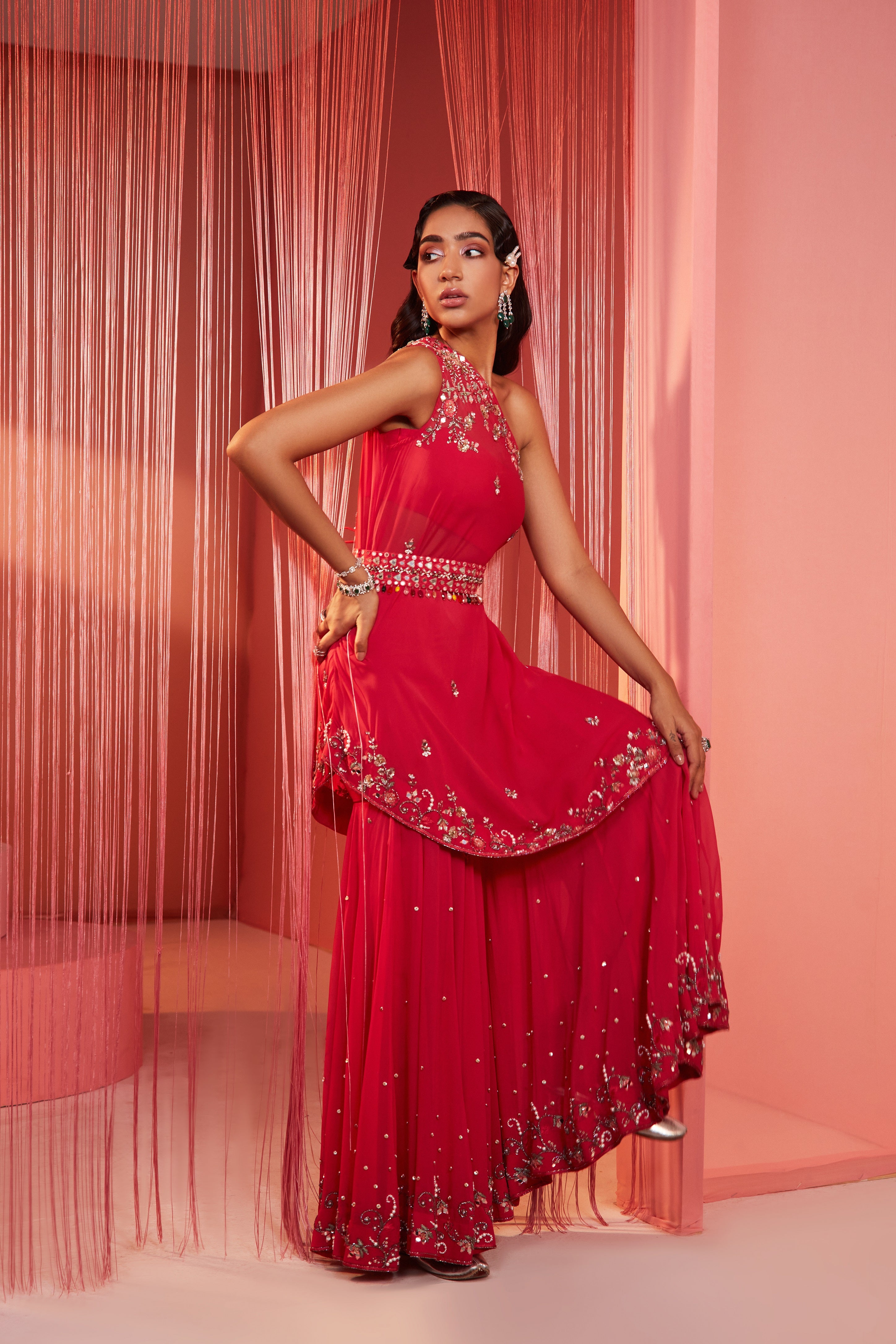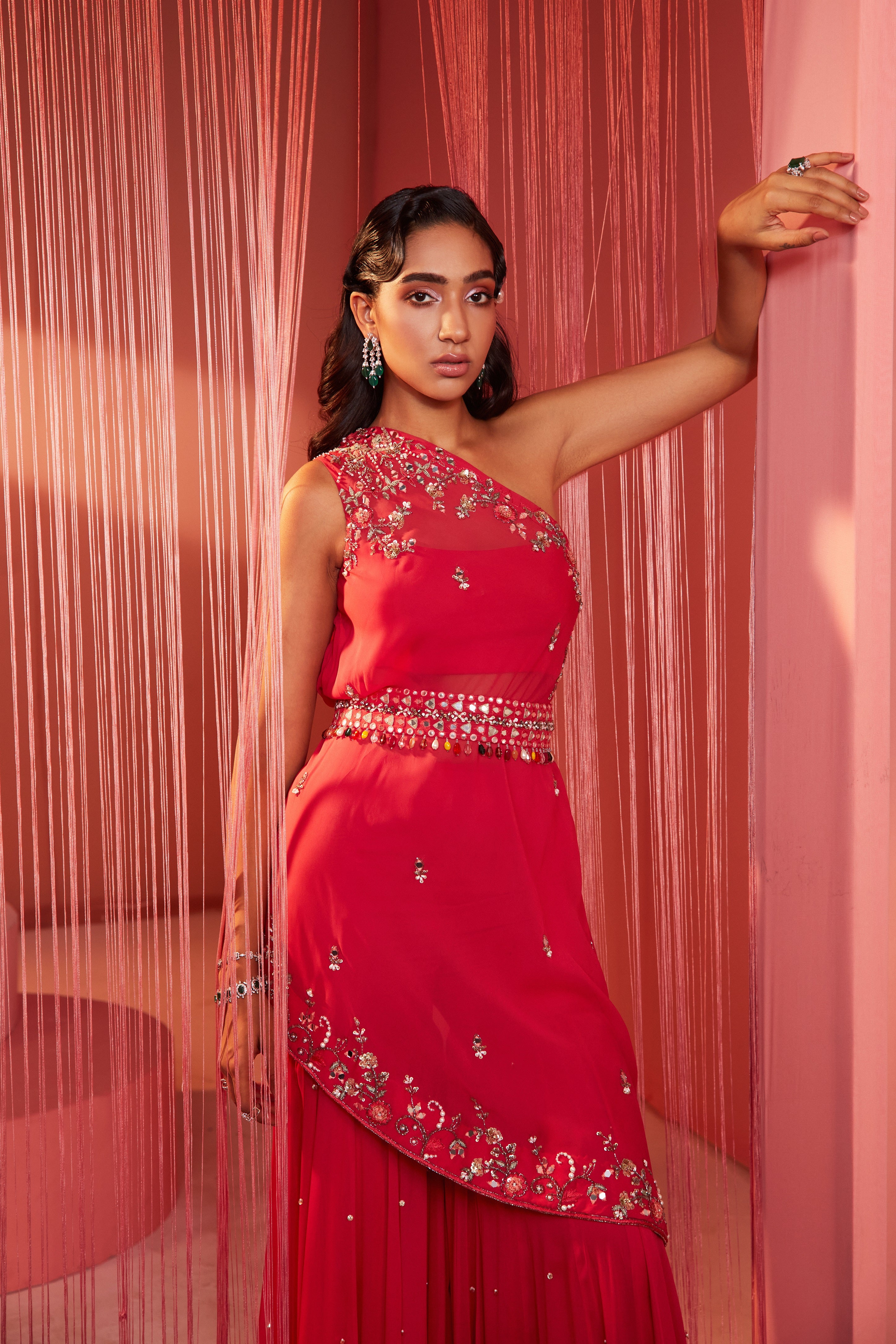 A coral red one shoulder kurta and sharara set. It has hand embroidered borders on the kurta as well as the sharara. It is paired with a belt that has stunning hanging details.