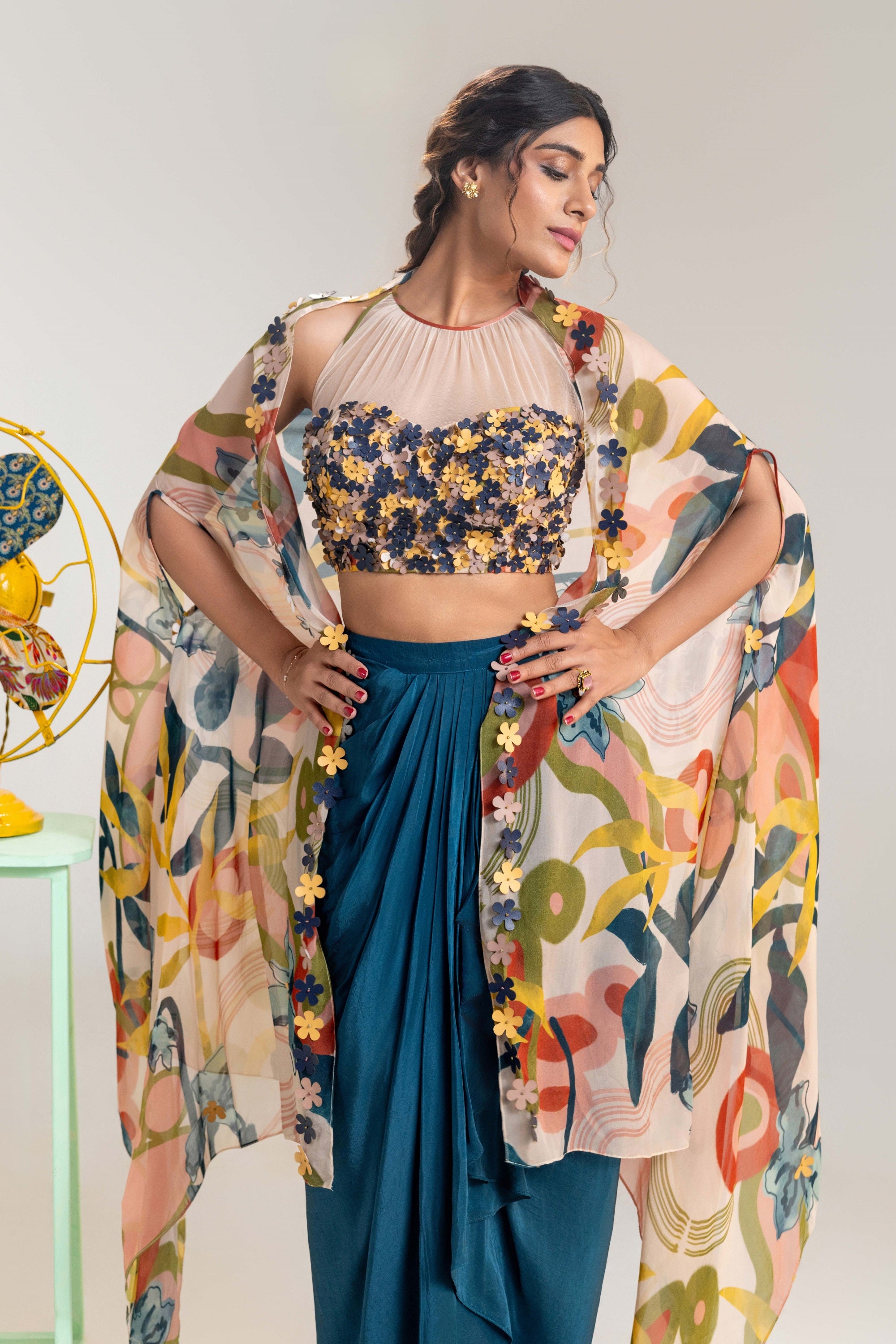 Multicolor Flora Embroidered Bustier And Drape Dress In Crepe, Paired With A Cape In Organza.