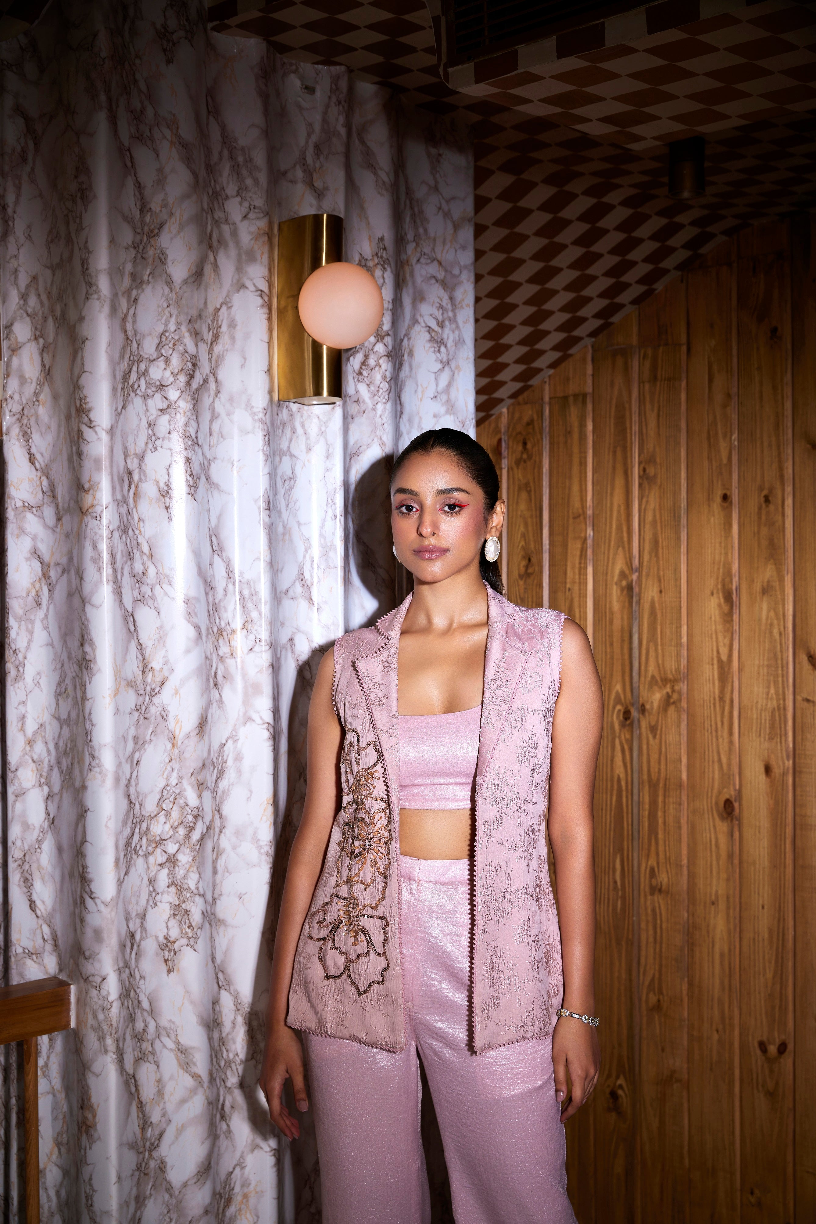 Since the jacket is the focal point in pink, choose a blouse and pants that complement rather than compete with it. Neutral tones like white, cream, gray, or black can work well to balance the look.