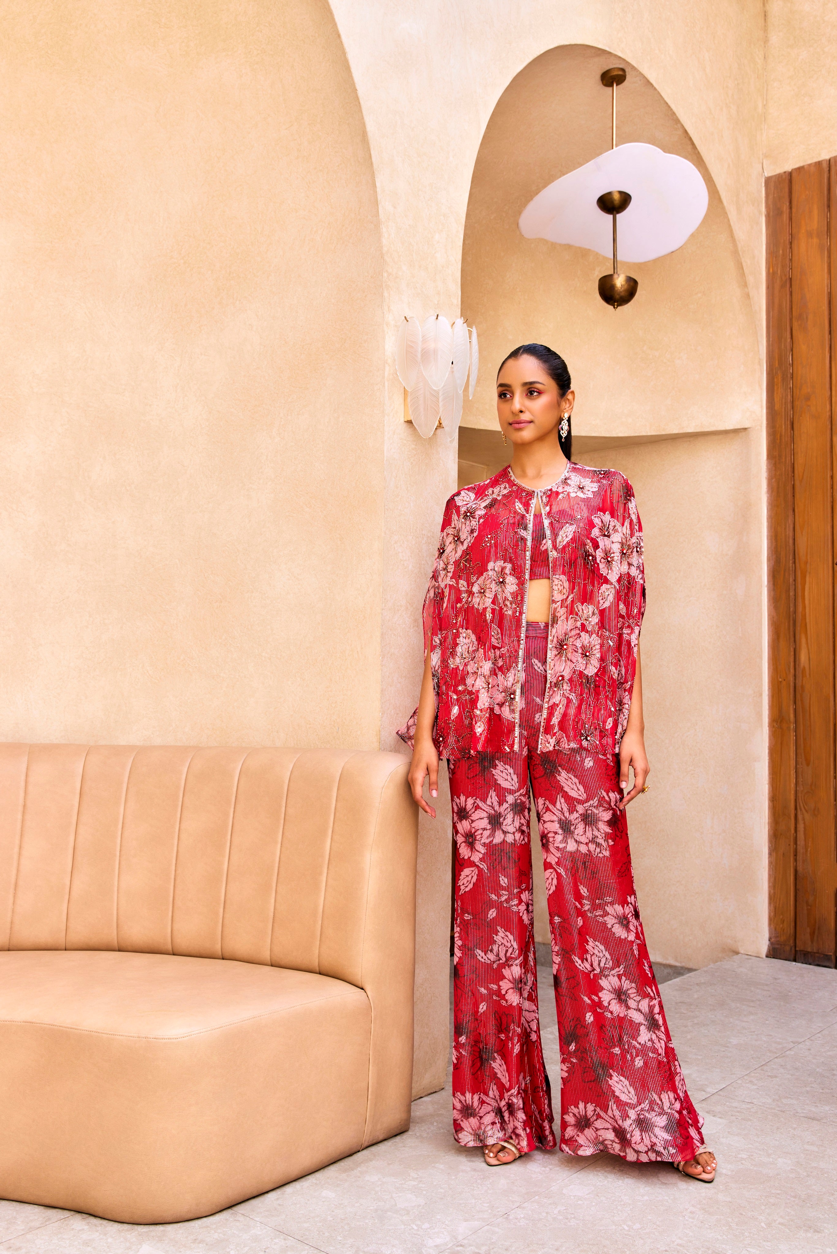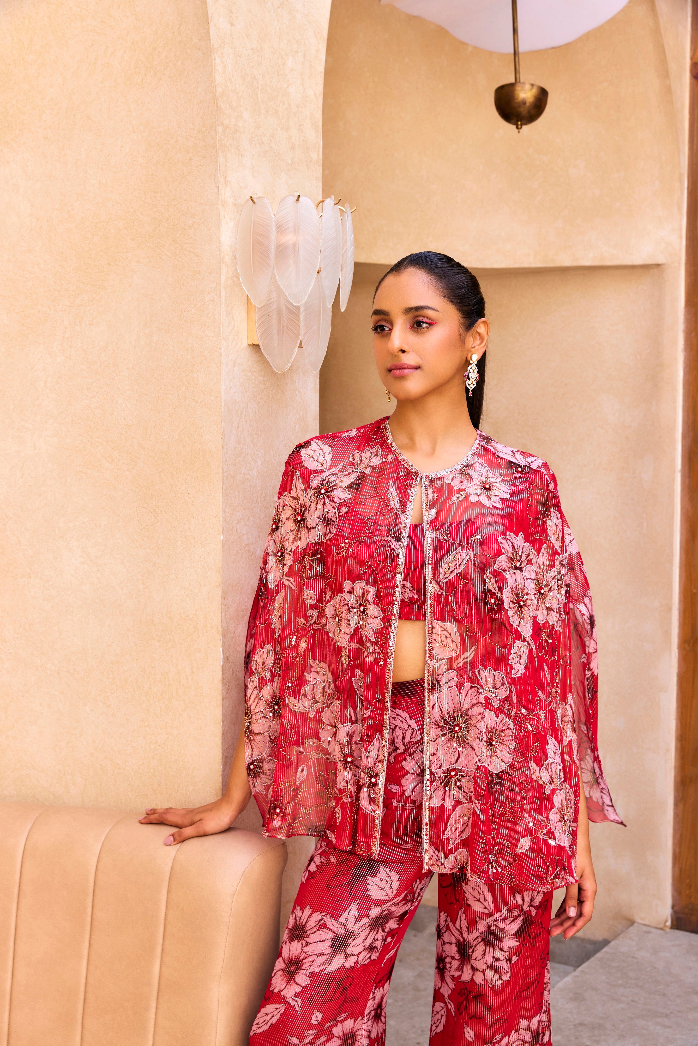 Red and pink floral printed cape with matching blouse and pants set. The cape has hand embroidery highlighting the flowers and a hook enclosure at the neck.