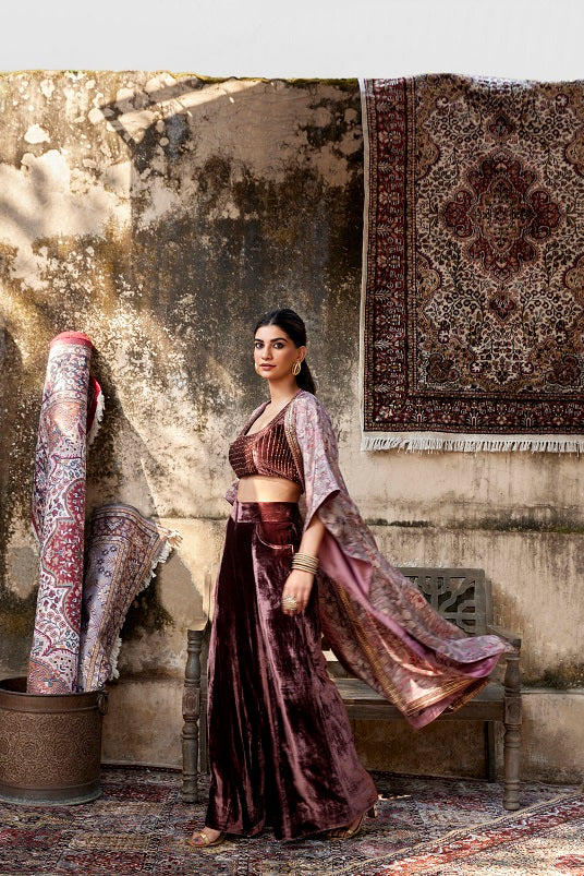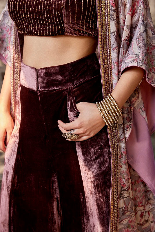 Featuring with Wine Maroon cape set in velvet fabric which is paired with 3 in set.