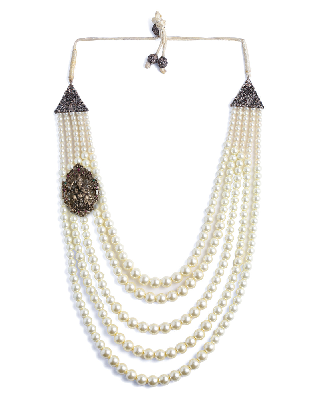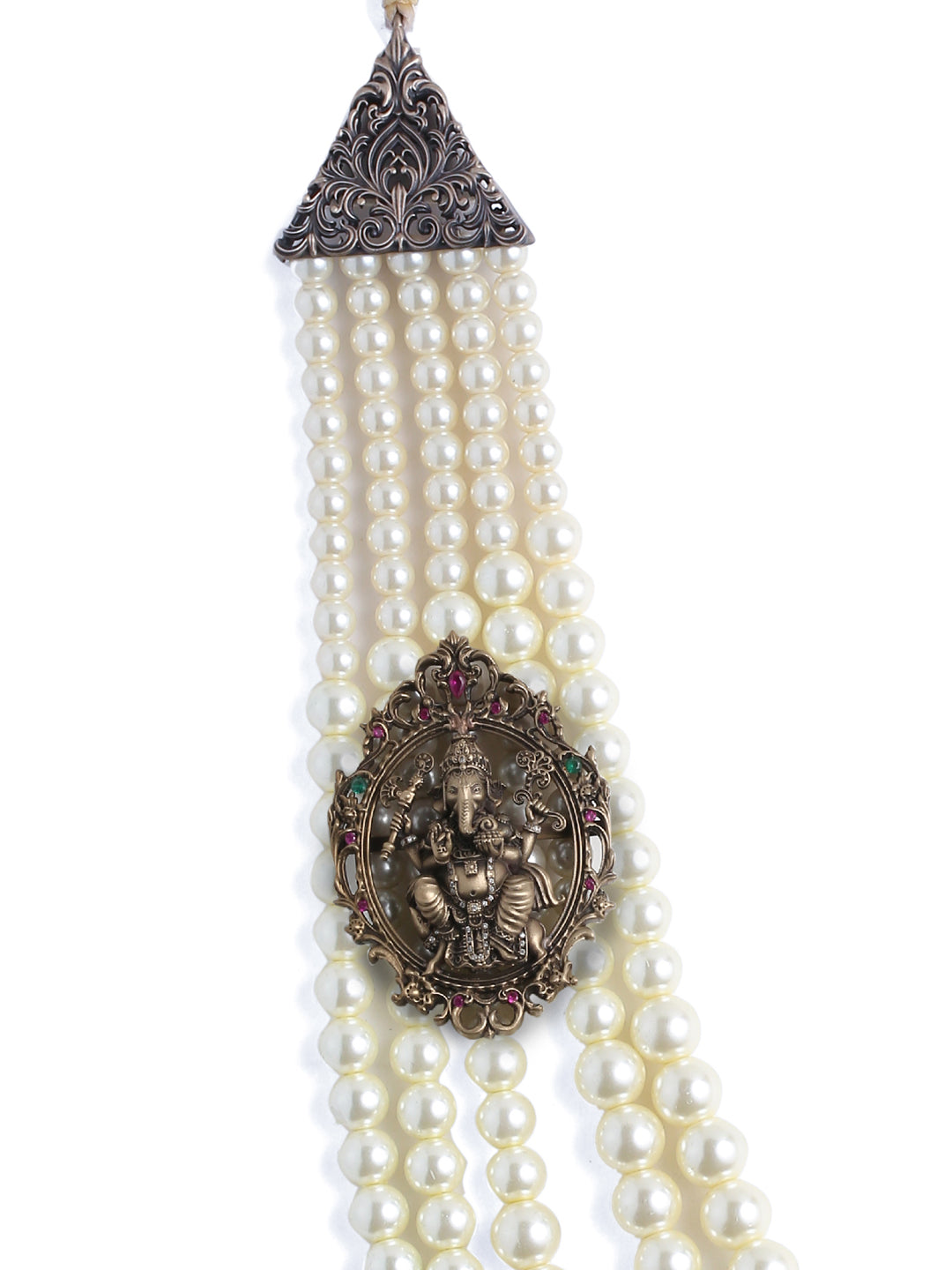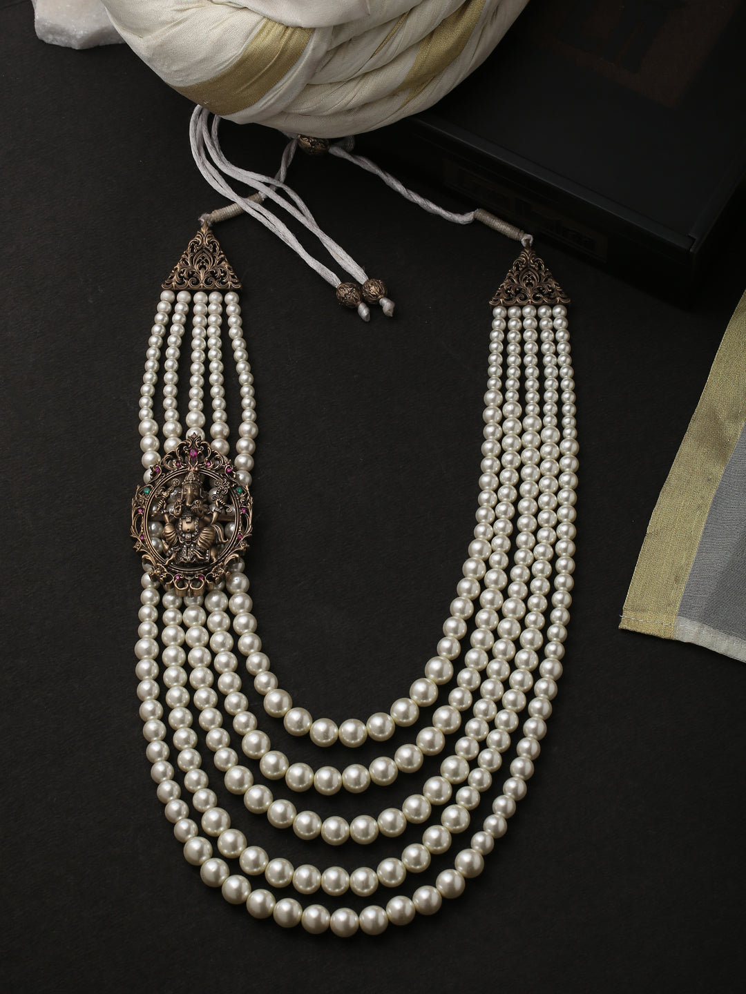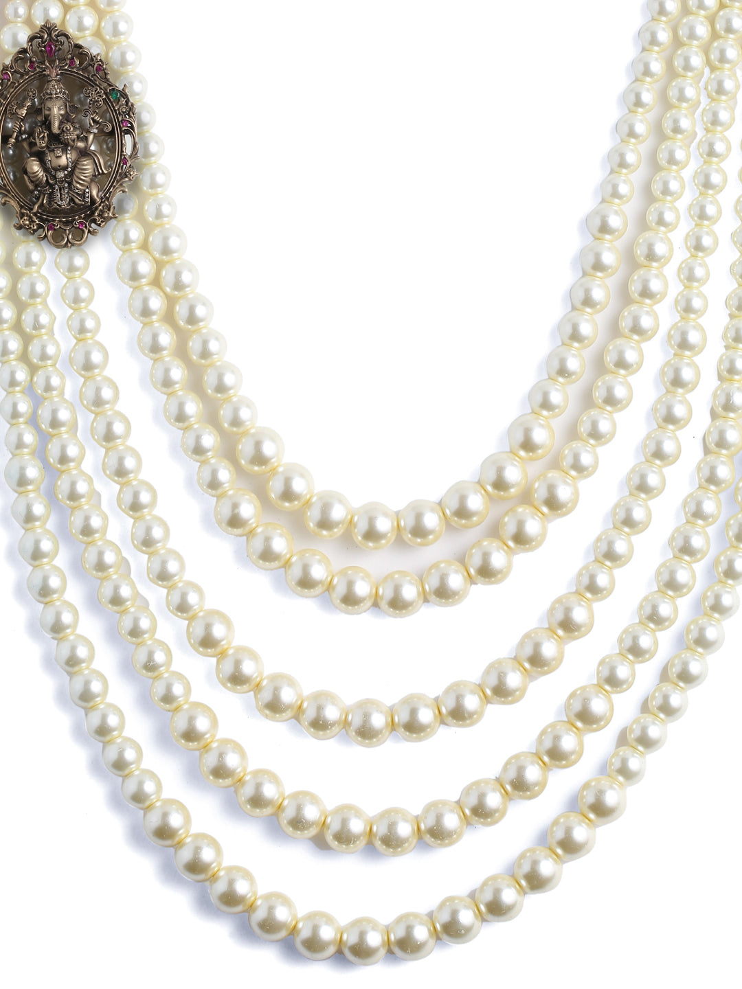Studded with beautiful copper toned white petals, this Antique Layered Mala is a soulful handcrafted jewellery. It is a perfect accessory to bring out your best look when paired with a traditional jacket, bandhgalas or stone embellished kurta. The brass metal further gives it an antique look.