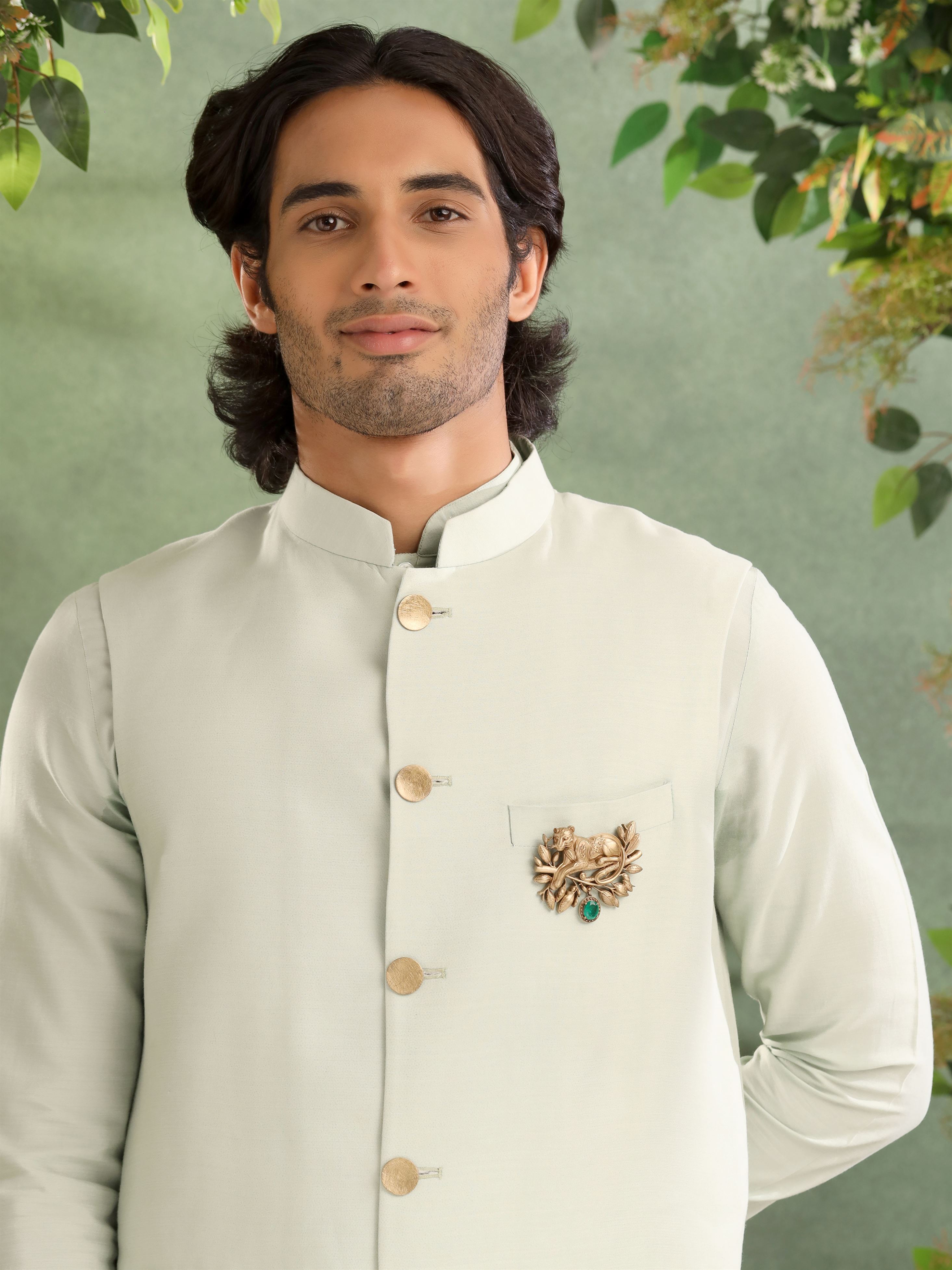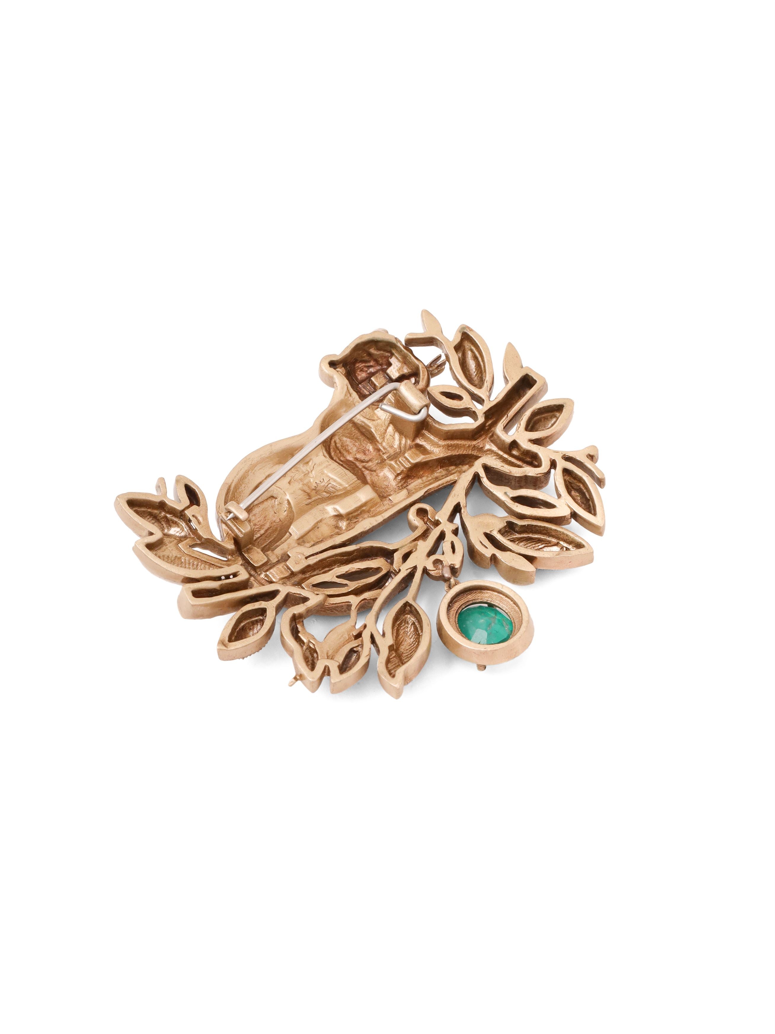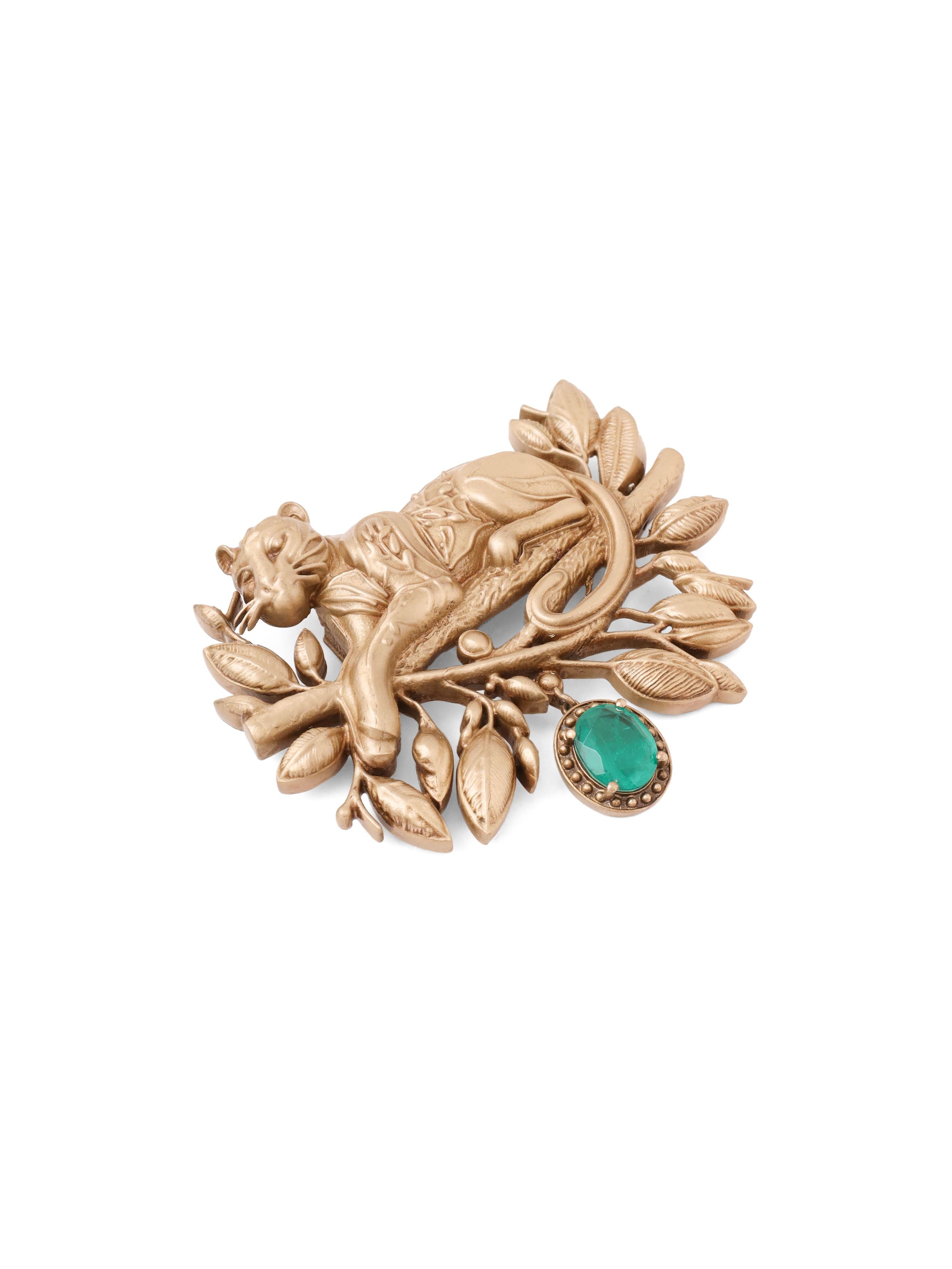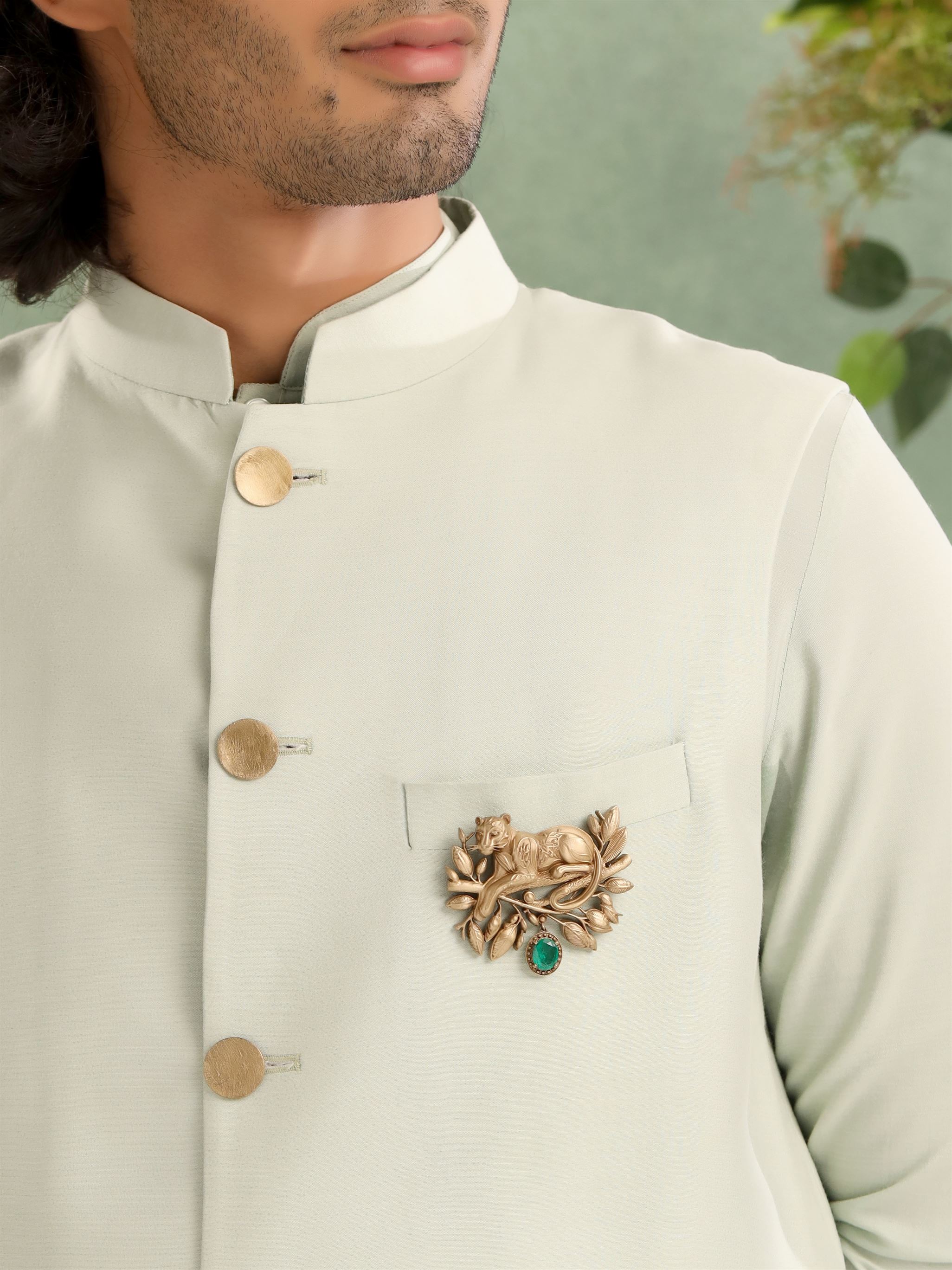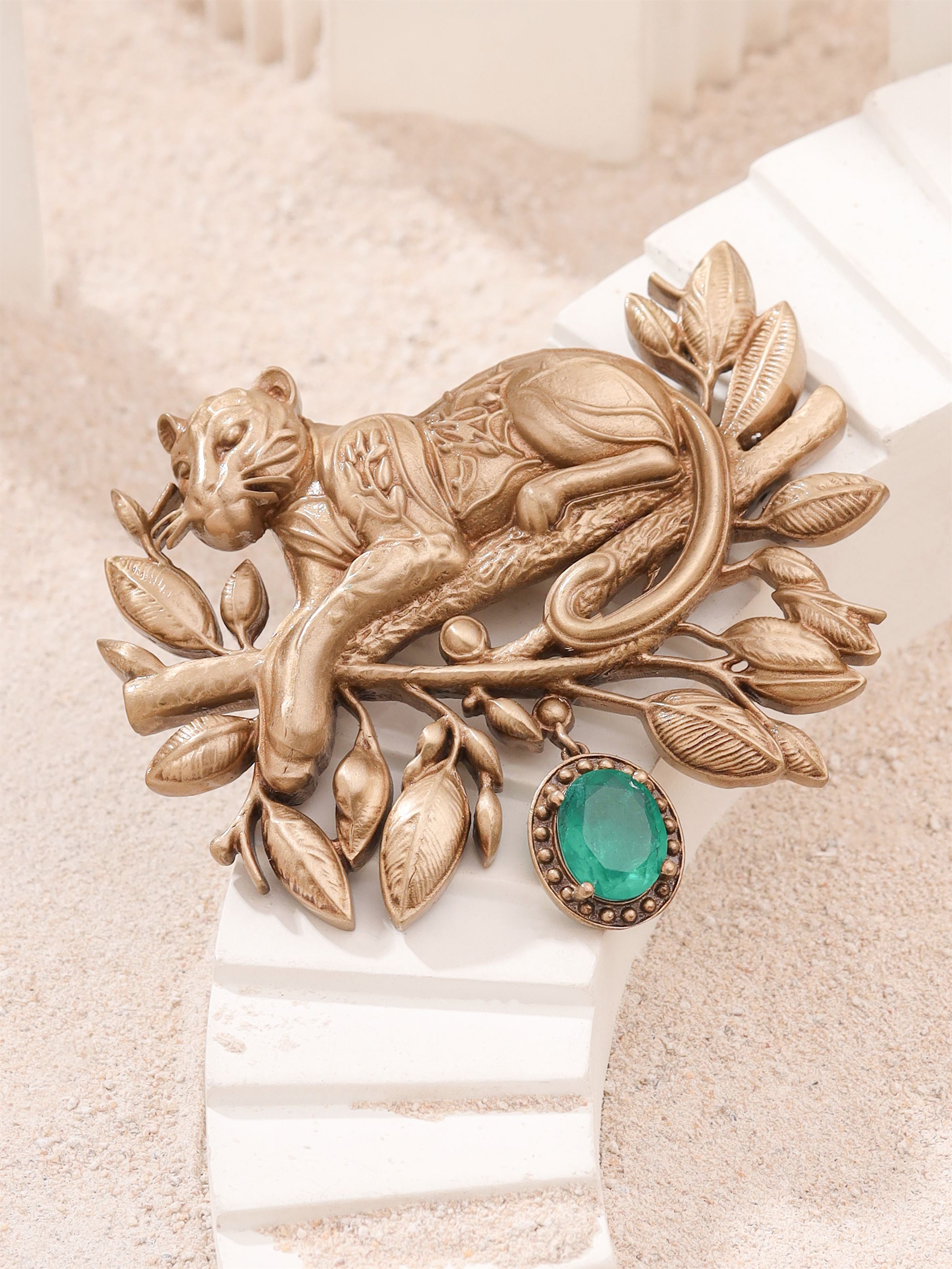 | Elevate your style with the Emerald Panther Brooch, a stunning accessory designed to add a touch of elegance to any outfit. This intricately crafted brooch features a majestic panther gracefully lounging on a leafy branch, embodying strength and sophistication. The antique gold-tone finish highlights the detailed artistry, while the vibrant green gemstone adds a pop of color and charm. Lightweight and versatile, this brooch is perfect for adorning coats, jackets, and bandhagalas, making it an exquisite choice for both casual and formal attire. |