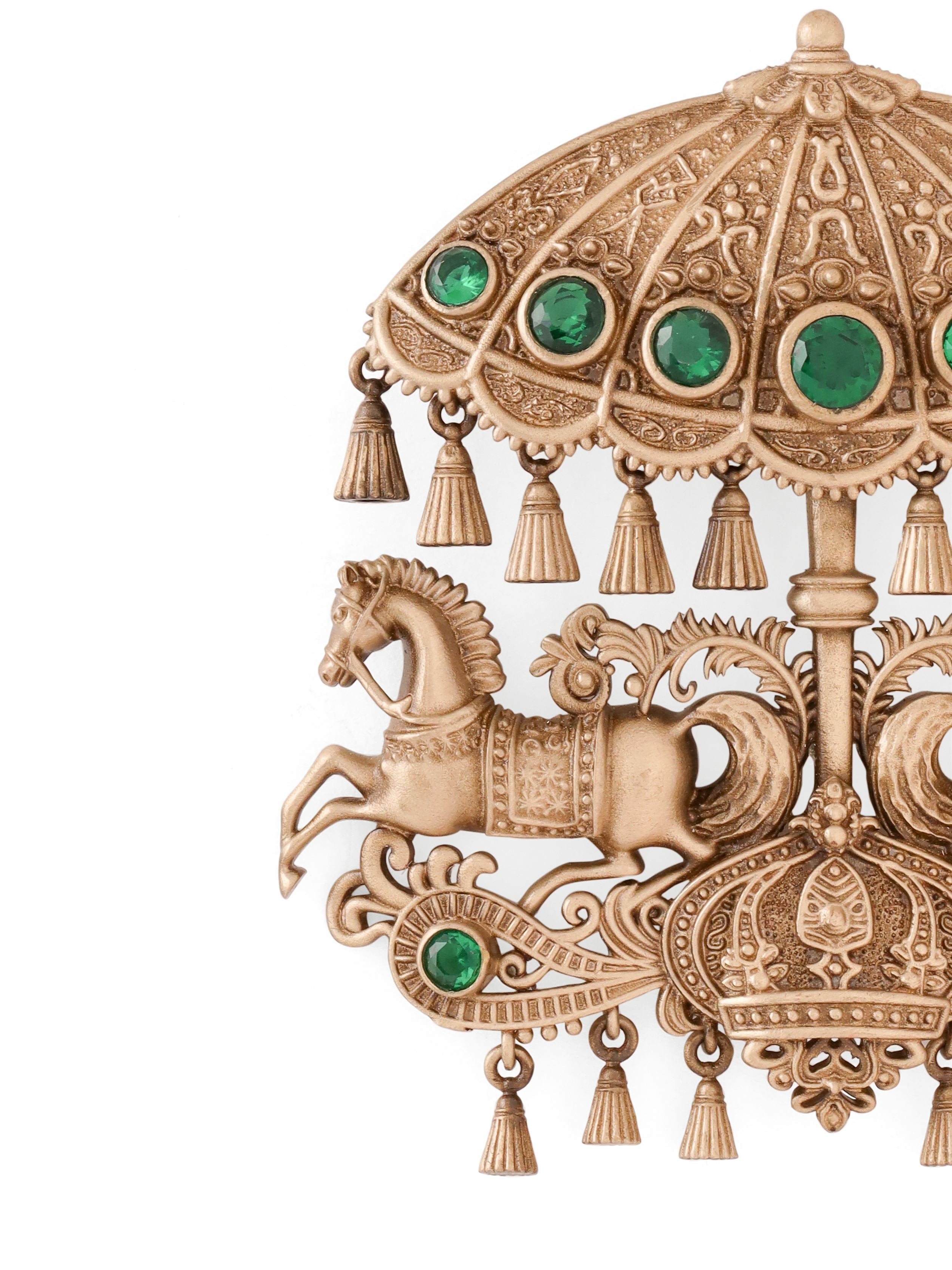 Step into a world of regal elegance with the Imperial Carousel Brooch. Featuring a grand umbrella adorned with vibrant green gemstones and a pair of intricately designed horses beneath, this brooch captures the essence of timeless luxury. The delicate tassels add a touch of movement, enhancing its visual appeal. Lightweight and versatile, the Imperial Carousel Brooch is the perfect accessory to elevate your coat, jacket, or bandhagala, making every appearance a celebration of royal splendor and grace.