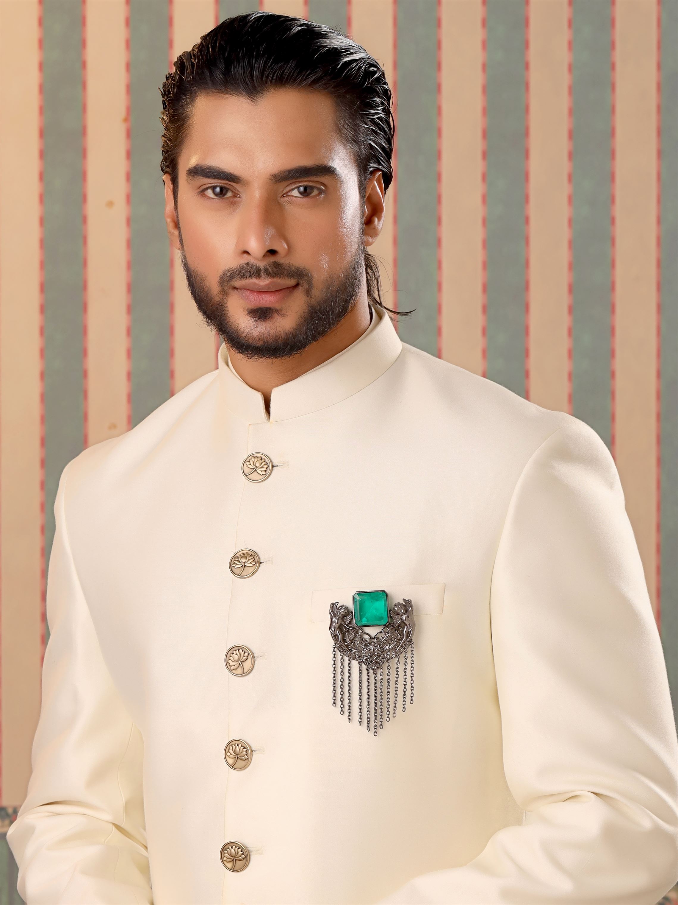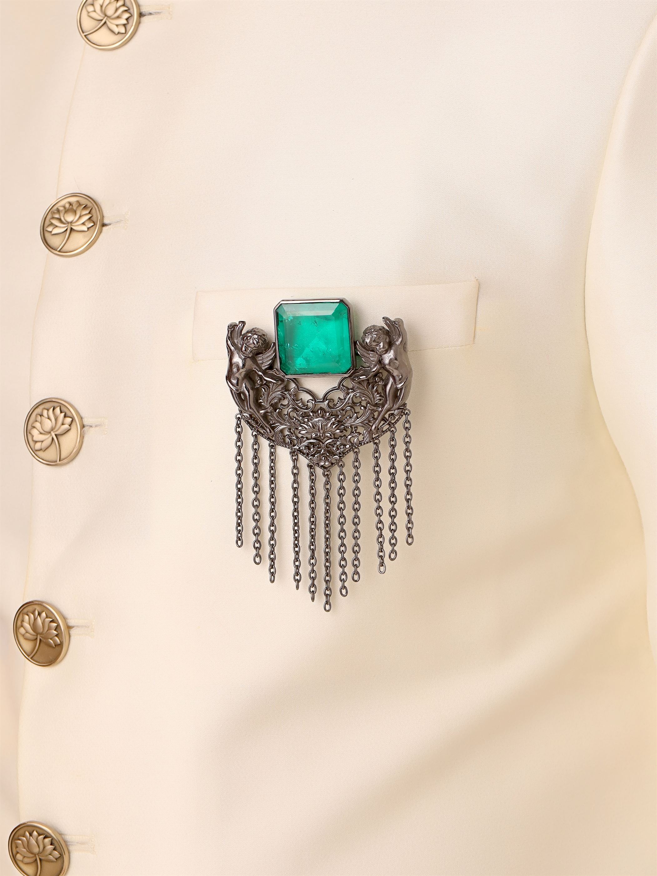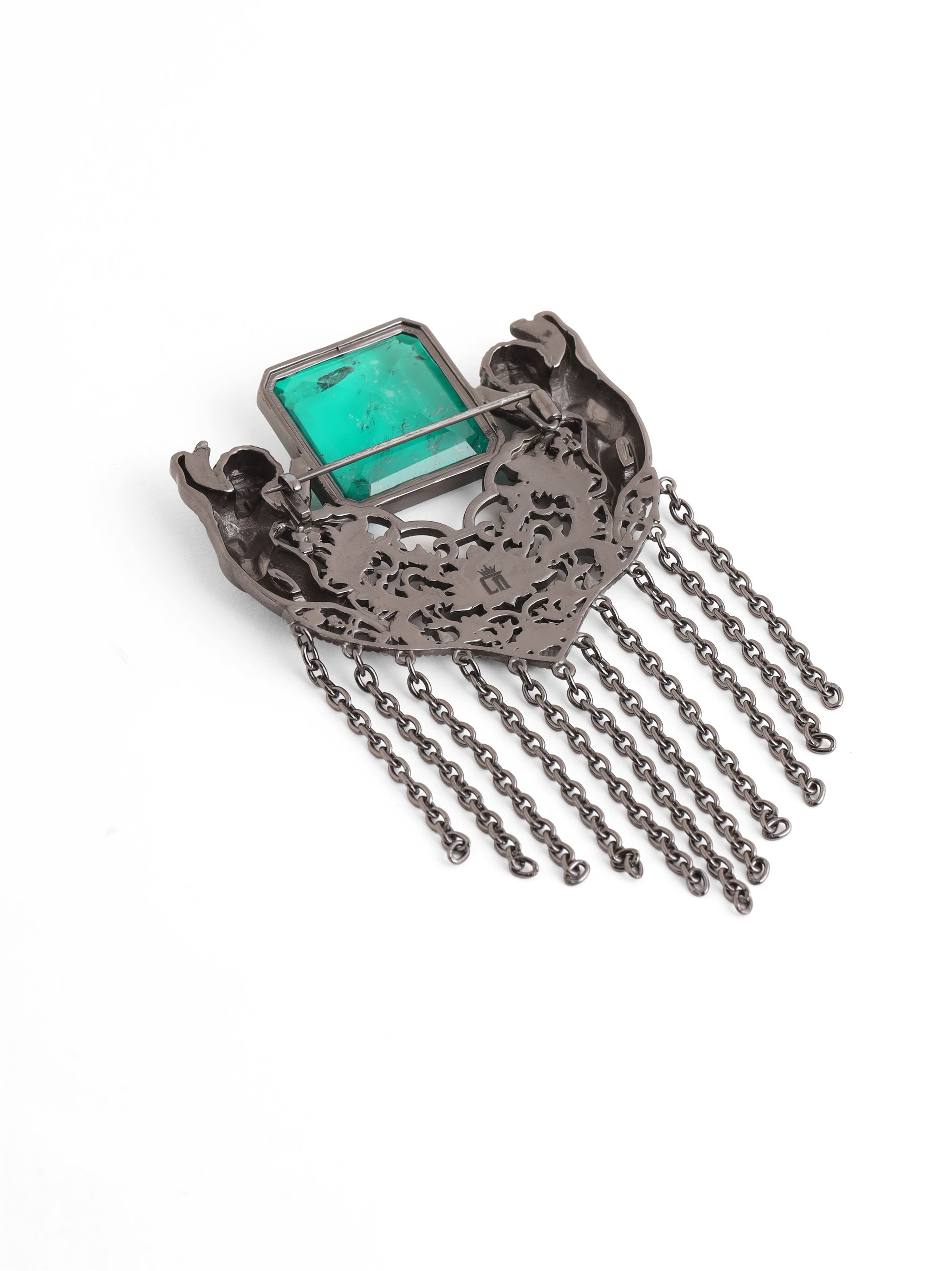 "Embark on a whimsical journey with the ""Jadui Naginey Brooch."" This enchanting accessory showcases an intricately designed scene of two playful elves gracefully dancing. Crafted with great attention to detail, the brooch captures the magic and charm of these mythical beings. Adorned with a sparkling green gemstone, it radiates a captivating aura, symbolizing the magic of the forest. Let the Brooch be a delightful expression of your inner wonder, adding a touch of enchantment to your style and inspiring you to embrace the joy of imagination and fairy tales.