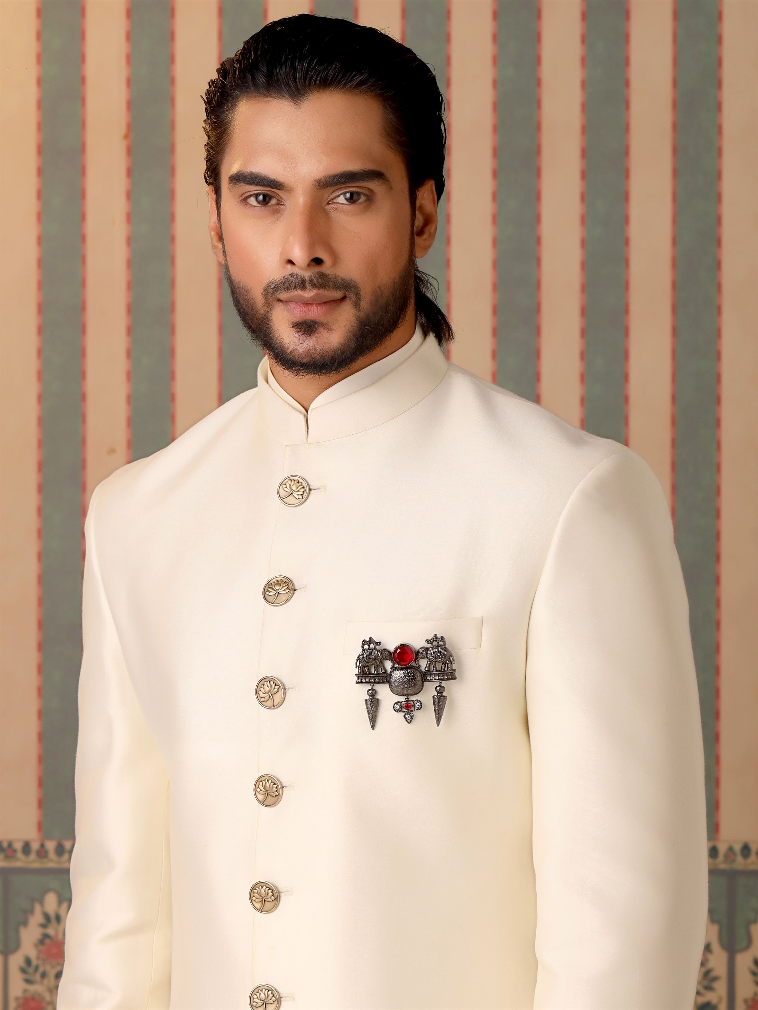 Introducing the "Jungi Haathi Brooch," a majestic tribute to the indomitable spirit of elephants. This captivating accessory features an intricately designed elephant, adorned with exquisite details that exude strength and nobility. With its fierce demeanor and unwavering presence, the Brooch symbolizes courage and resilience. The brooch is embellished with radiant gemstones, mirroring the wisdom and charisma that elephants embody.