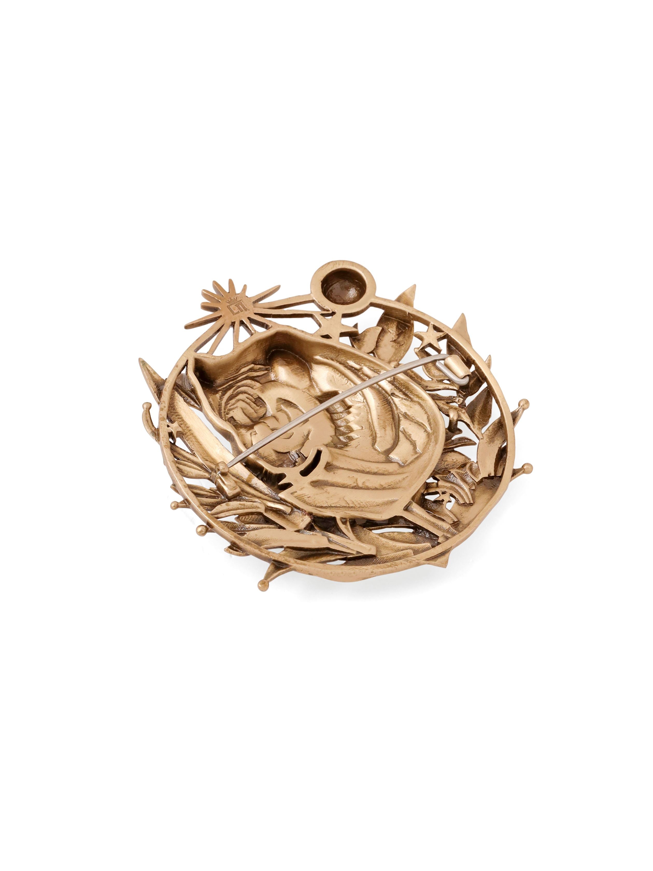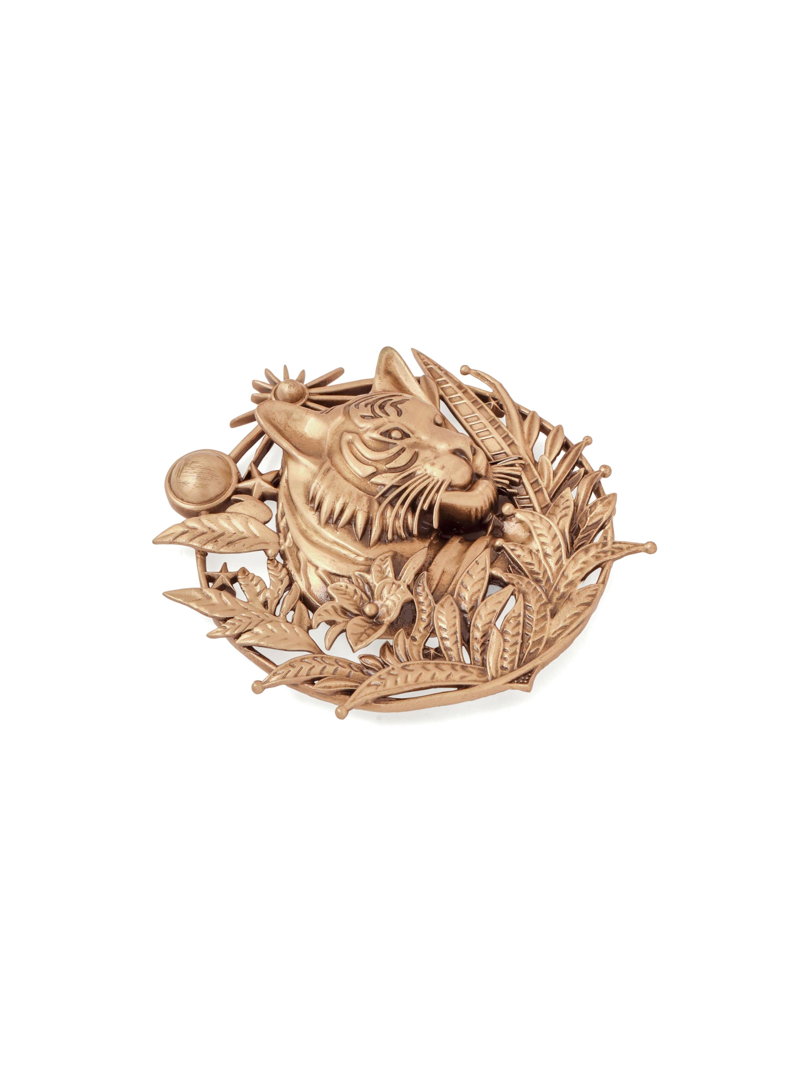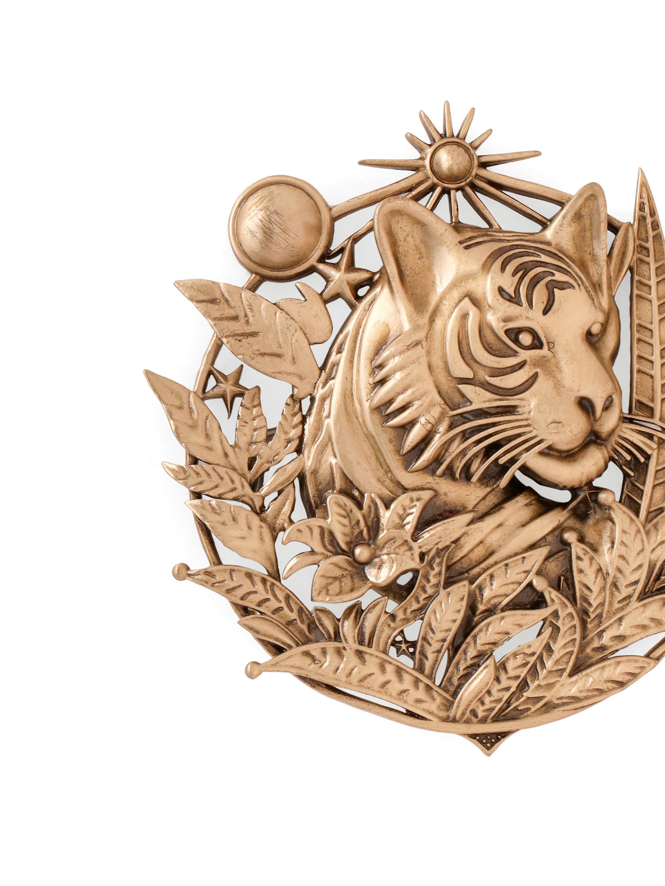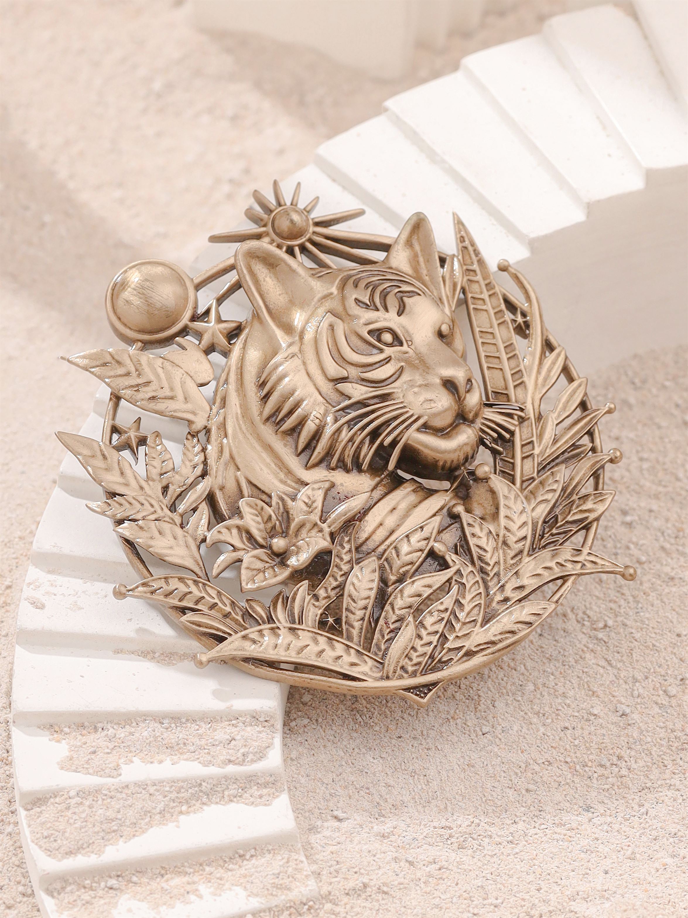 | Channel the power and grace of the wild with the Majestic Guardian Brooch, meticulously crafted from luxurious brass. Featuring the commanding visage of a tiger, this brooch is surrounded by an intricate array of leaves and flowers, symbolizing the fierce protector of nature. The celestial elements, including a radiant star and moon, add a touch of mystique, making this brooch a striking statement piece. Perfect for those who embrace strength and elegance, this brooch is a testament to the untamed beauty of the natural world. |