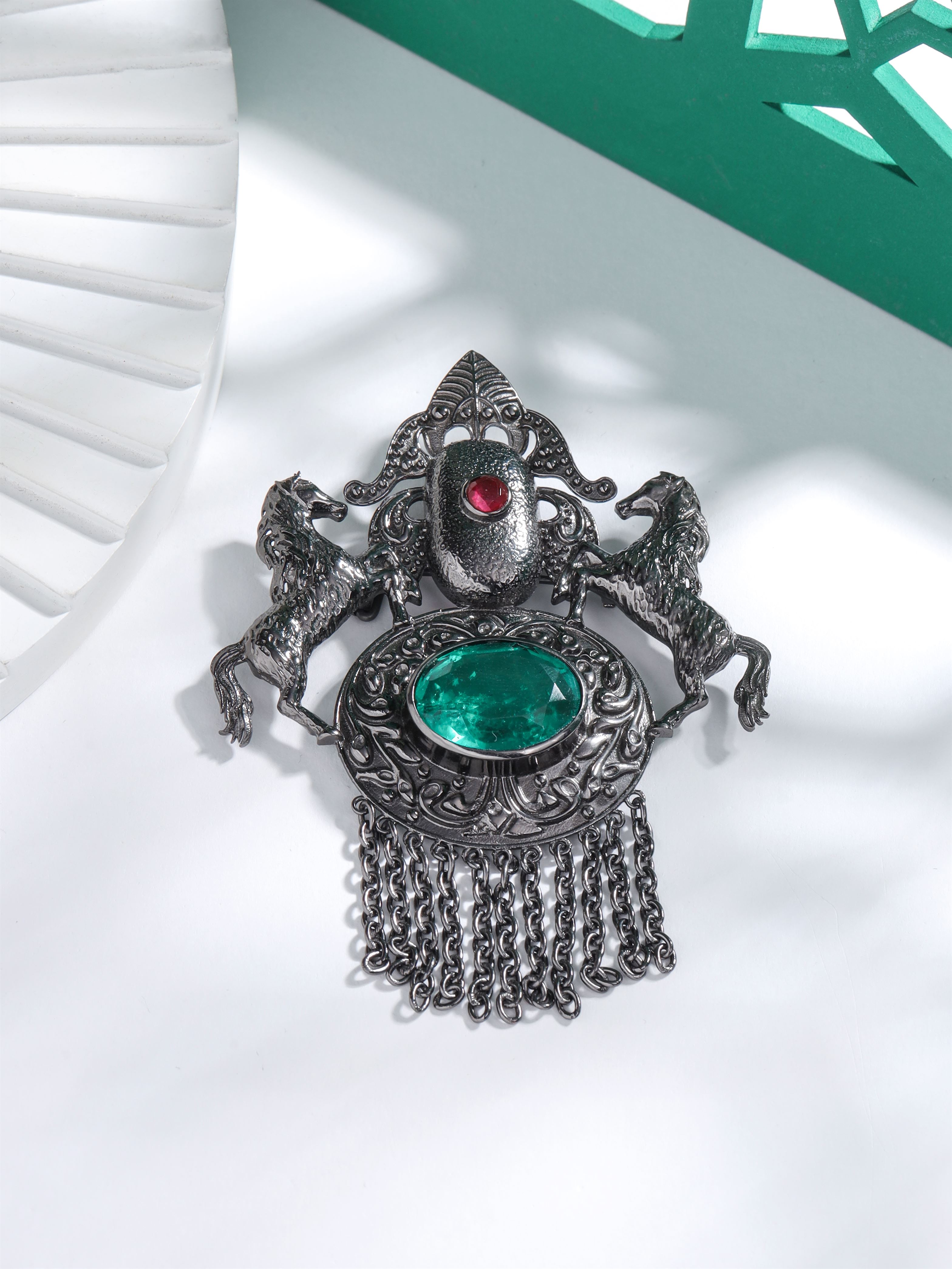 Sawaar-e-Noor is a majestic accessory that embodies the spirit of untamed masculinity and impeccable style. This exquisite brooch features two magnificent stallions designed with a lustrous shimmer that catches every eye in the room. Crafted with attention to detail and adorned with glistening crystals, it exudes a captivating charm that sets you apart from the herd. Whether you're dressed for a formal occasion or adding flair to everyday wear, this brooch is the epitome of bold elegance for the modern Stallion.