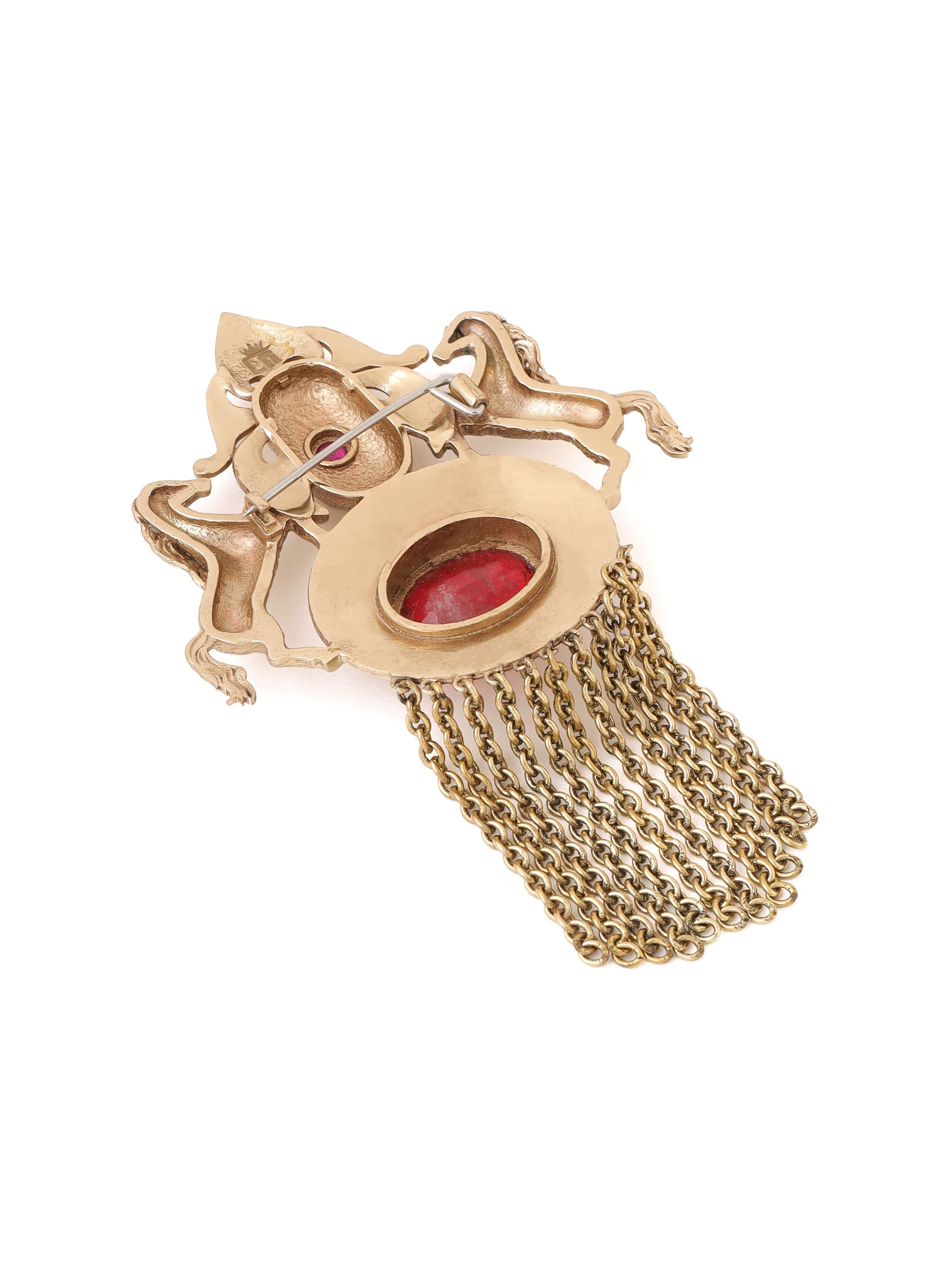 Sawaar-e-Noor is a majestic accessory that embodies the spirit of untamed masculinity and impeccable style. This exquisite brooch features two magnificent stallions designed with a lustrous shimmer that catches every eye in the room. Crafted with attention to detail and adorned with glistening crystals, it exudes a captivating charm that sets you apart from the herd. Whether you're dressed for a formal occasion or adding flair to everyday wear, this brooch is the epitome of bold elegance for the modern Stallion