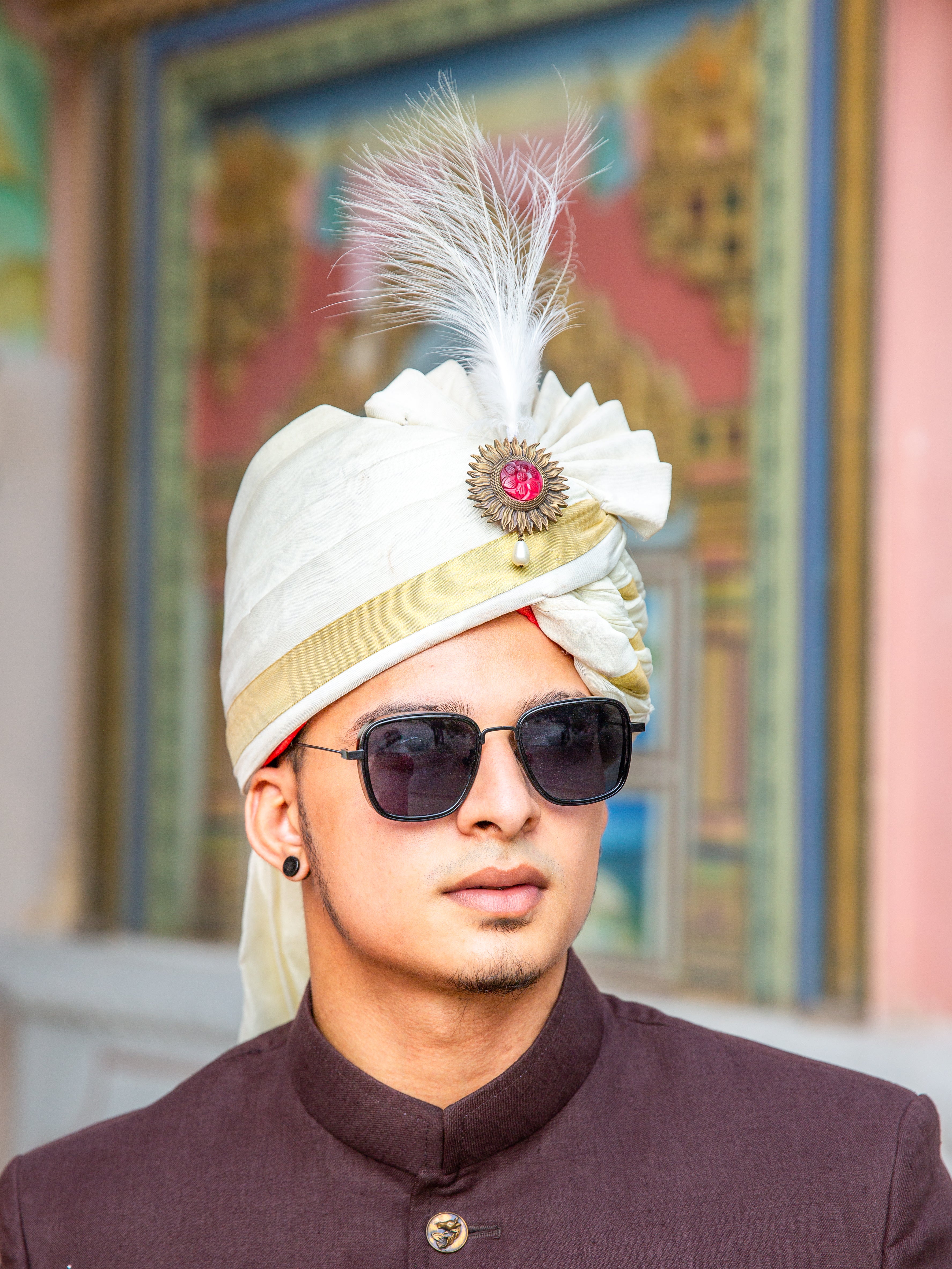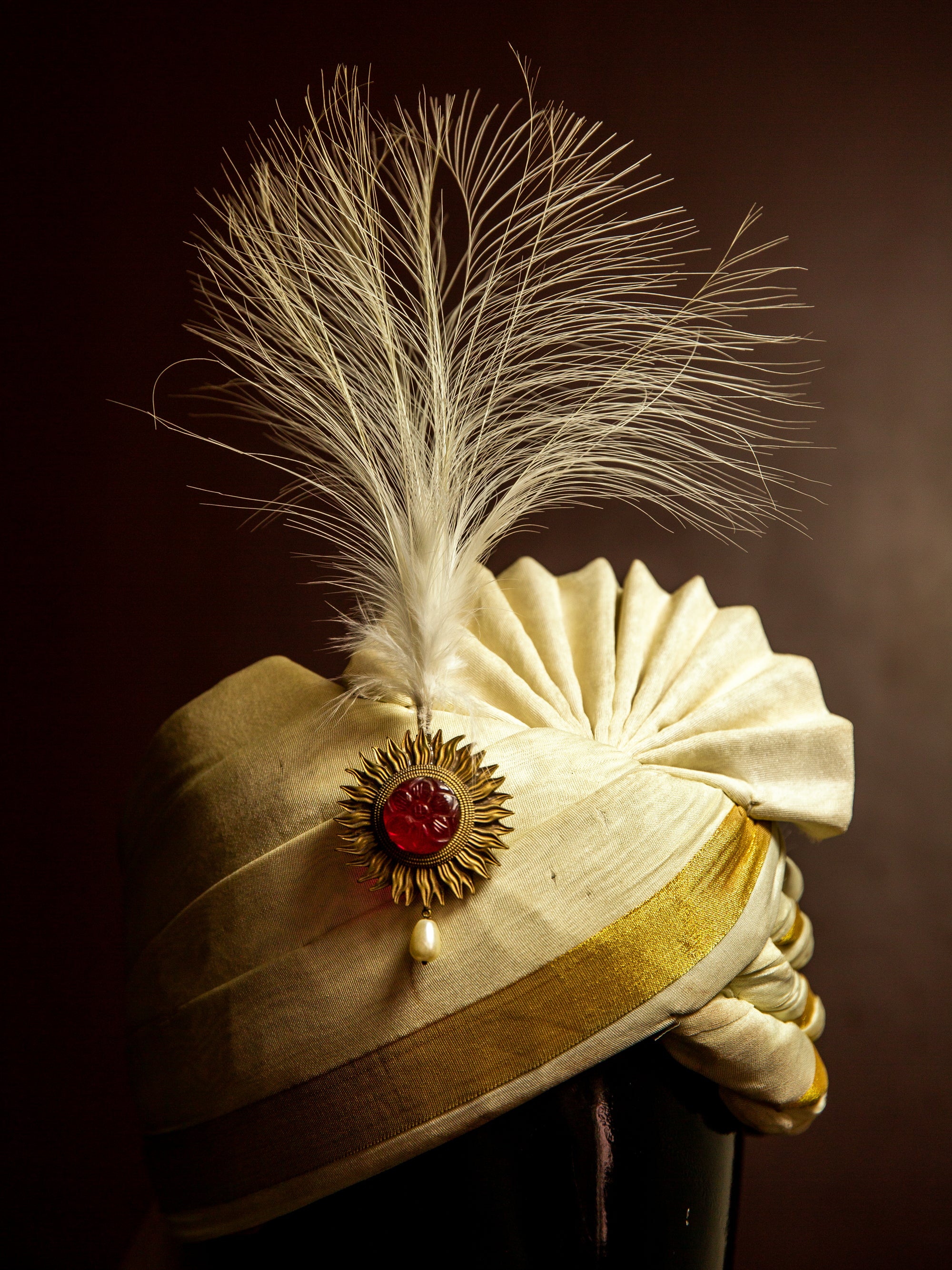 | Featuring exquisitely crafted sun kalangi in antique gold with hand crafted glass stone in the centre.This is made of brass metal. Wear this precious adornment on any Safa for wedding. |