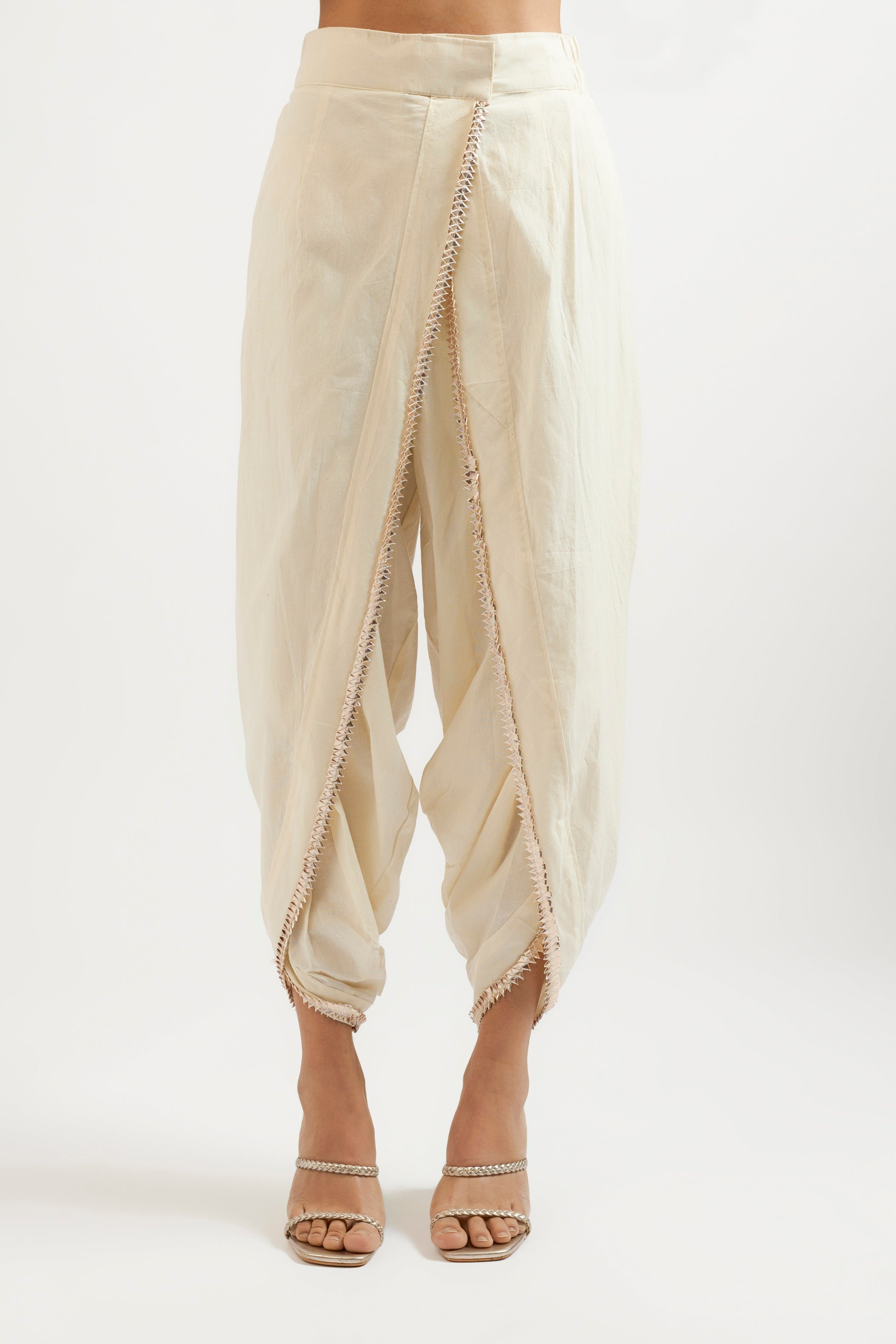 This pretty ensemble in floral jaal , combines gota and dori buttis with an intricate border embroidery. The short Kurta with a dhoti embroidered in sequins and gold thread, adds a feminine grace.