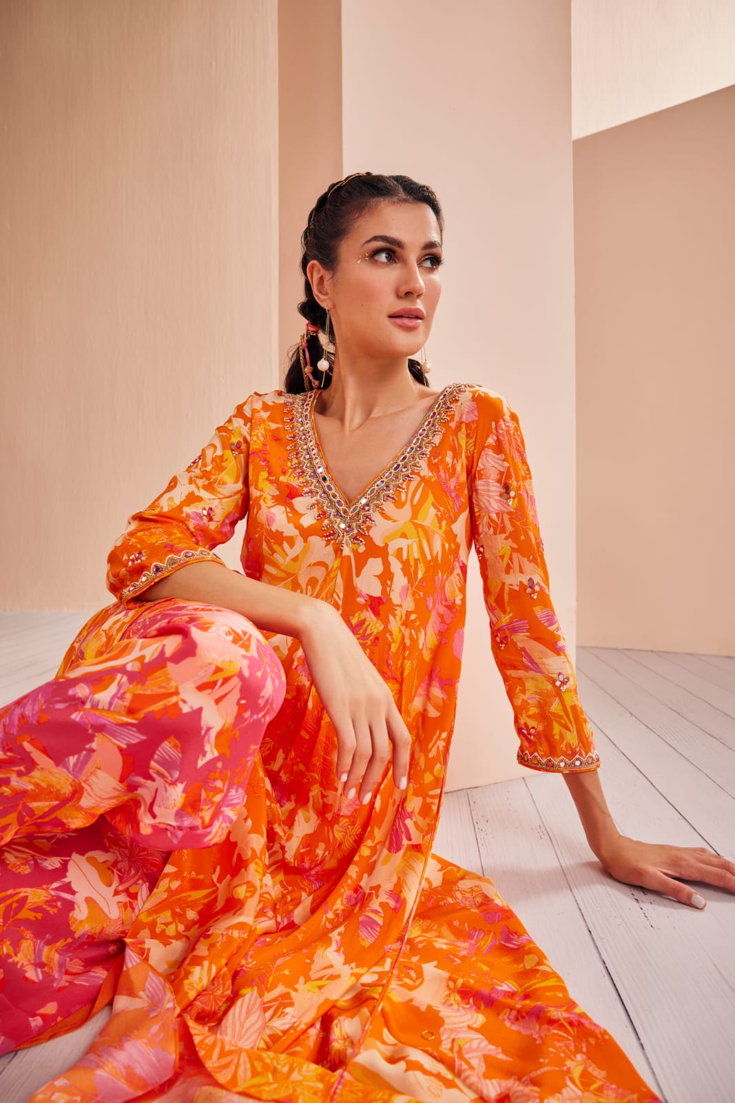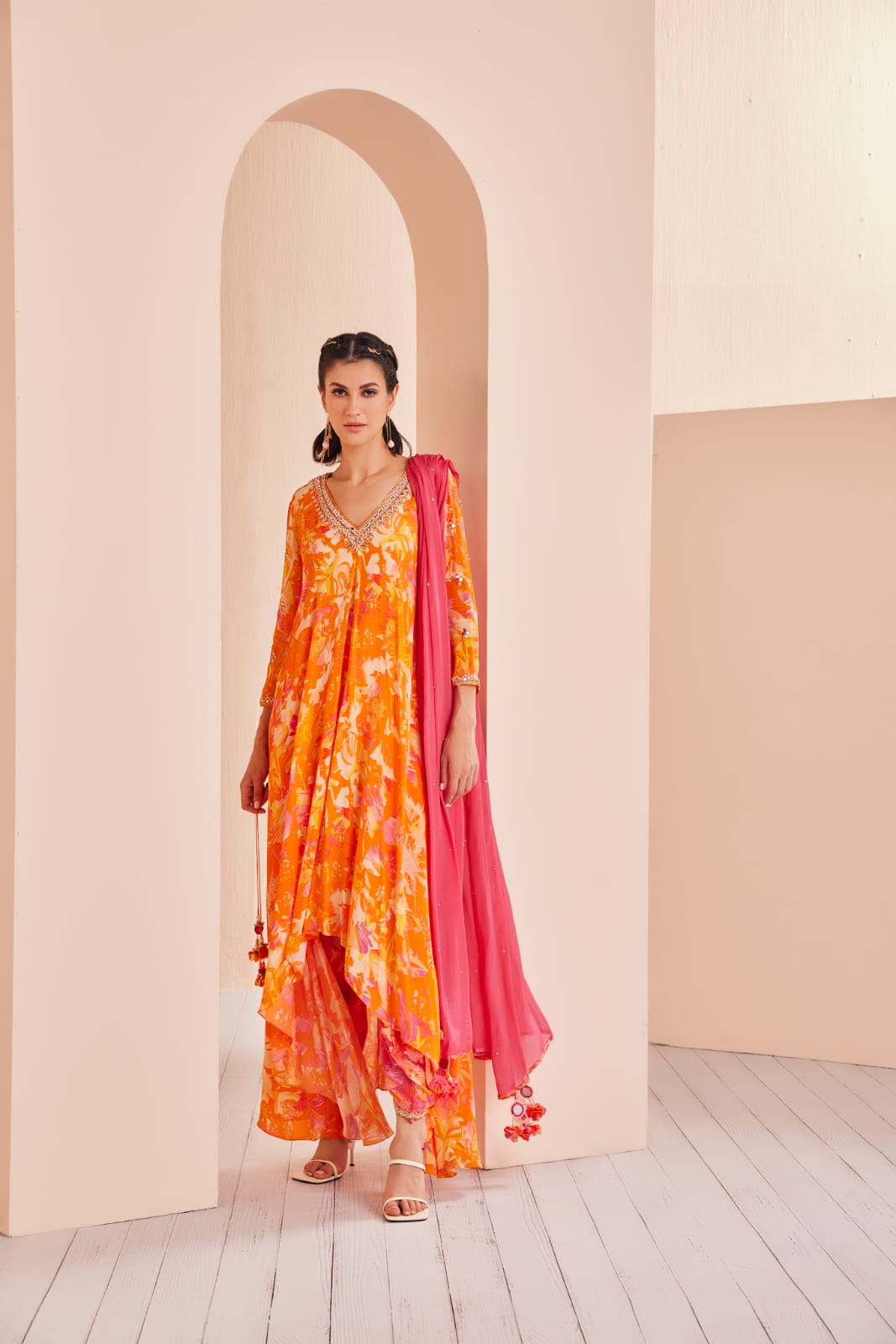 Printed crepe asymmetric embroidered tunic complimenting with dhoti and dupatta