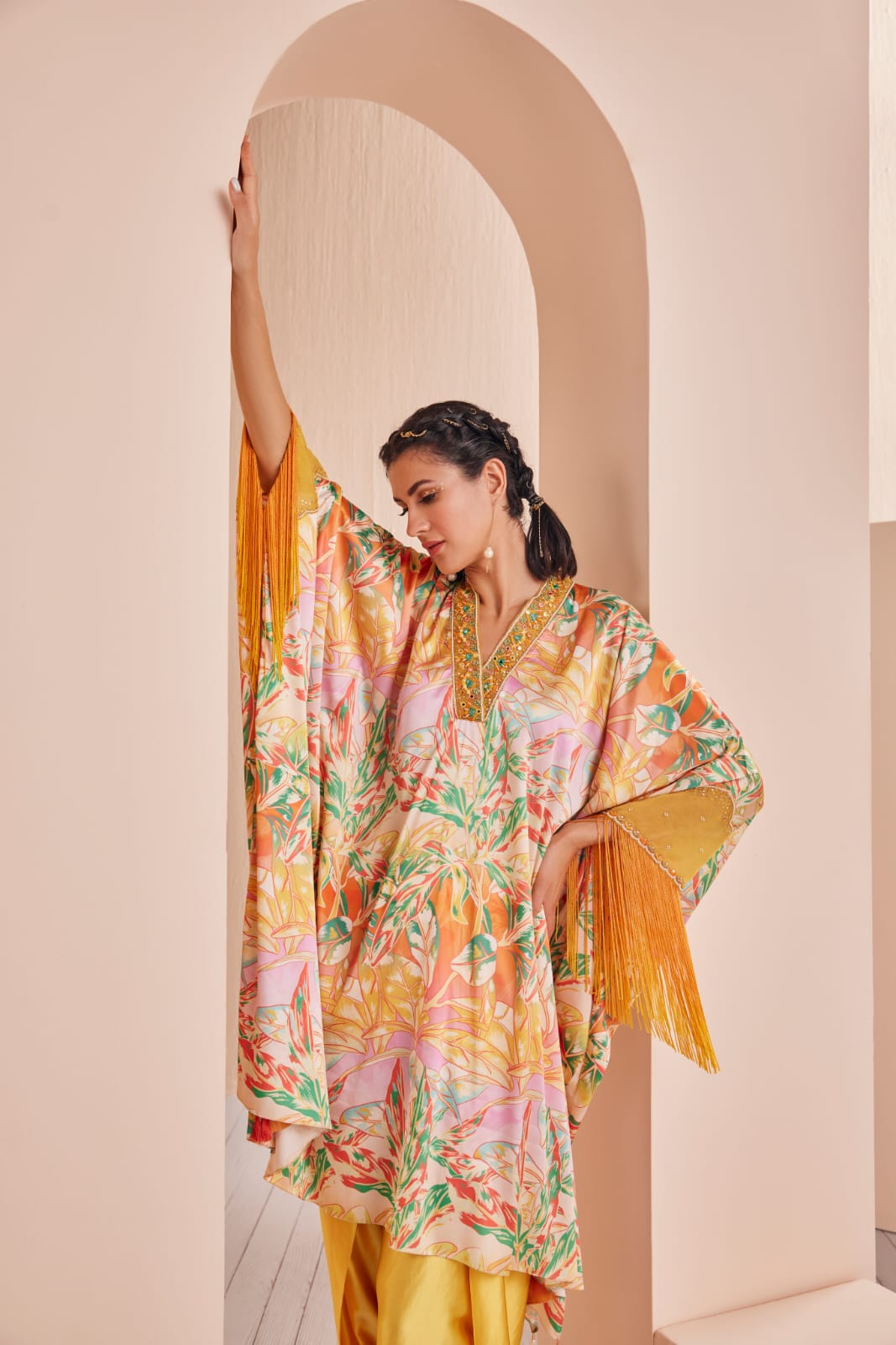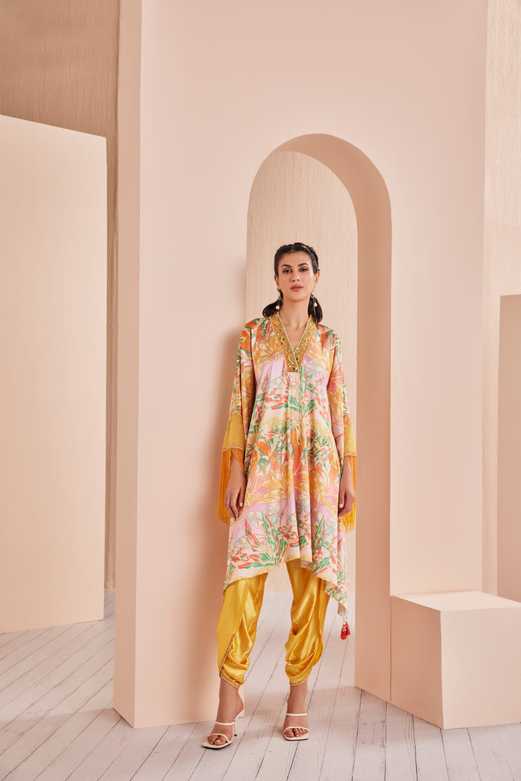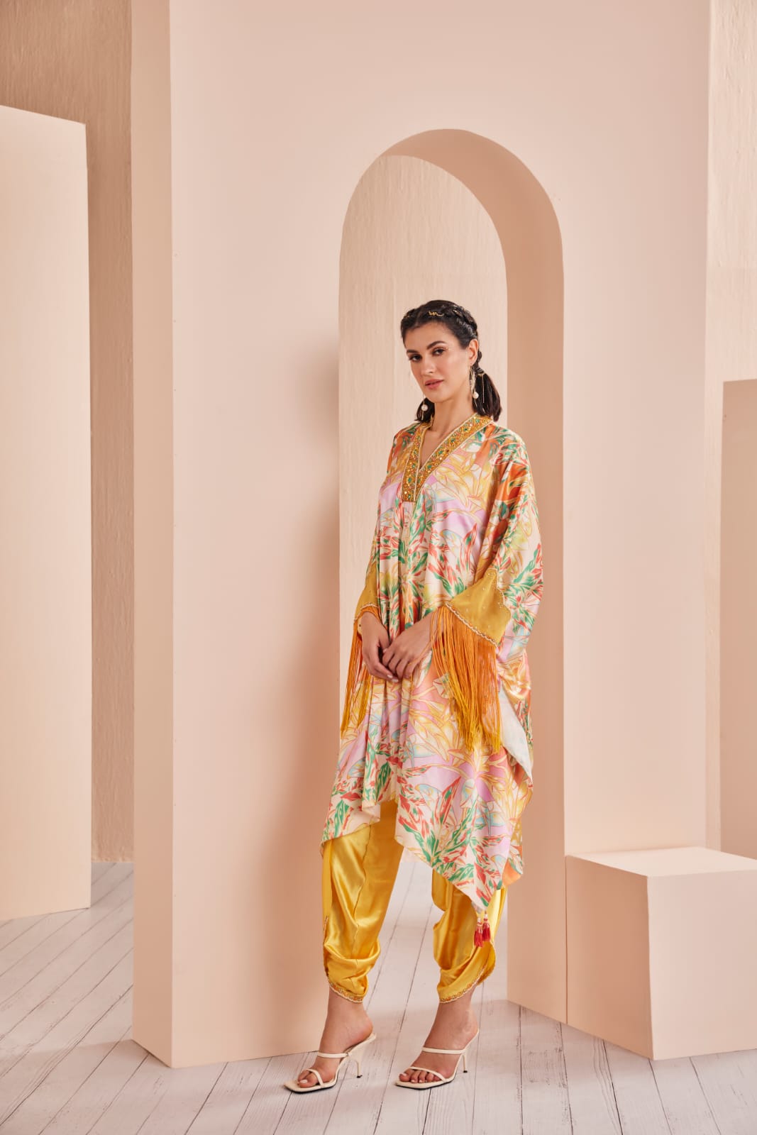 Yellow leafy ash printed satin kaftan kurta and dhoti