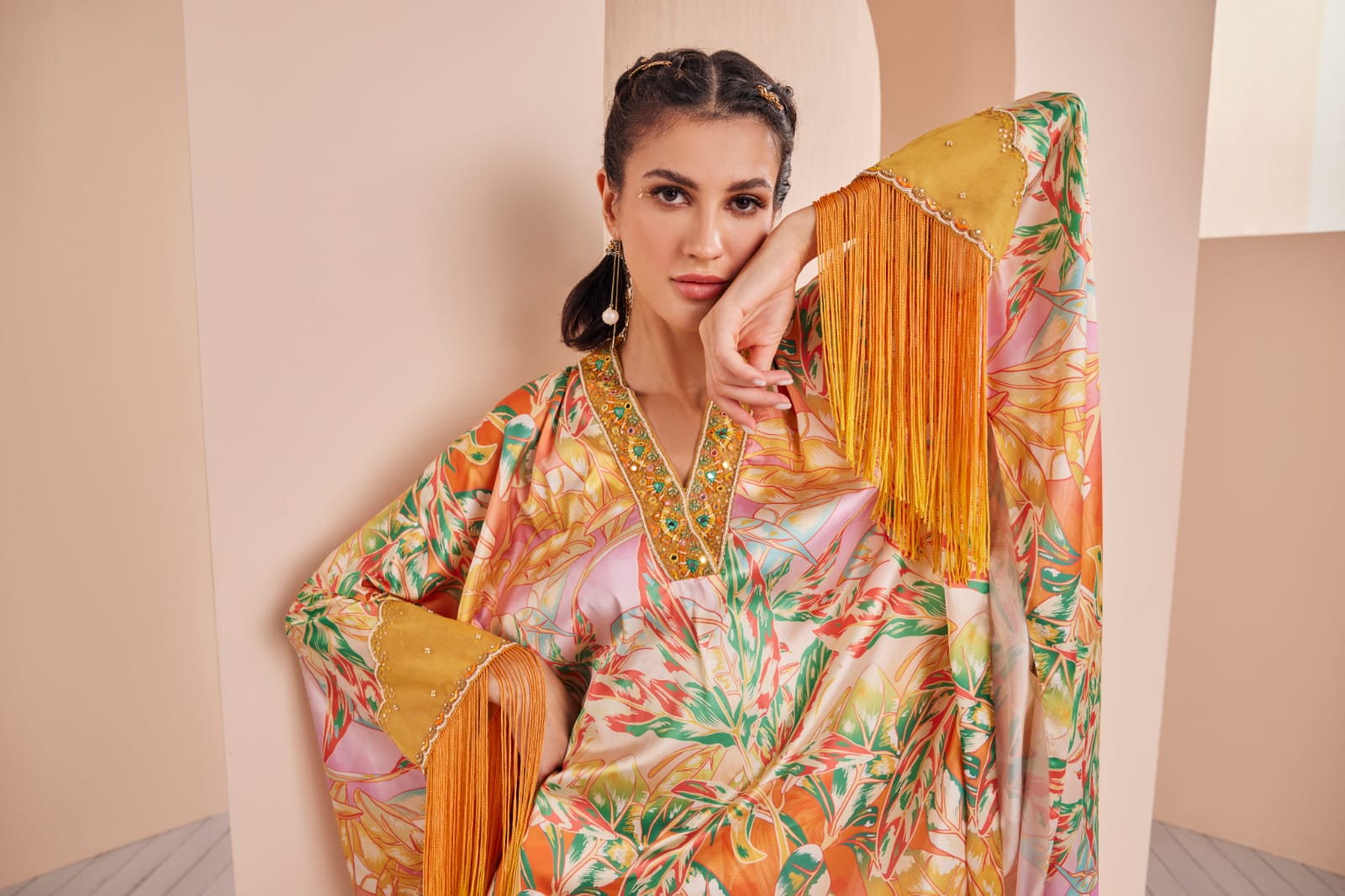 | Step into the spotlight with this printed satin kurta, a captivating piece that combines style and drama. The kurta features dyed and embroidered organza detailing at the neckline and sleeves, adding an exquisite touch of opulence. To up the ante, ombre dyed fringes dangle from the sleeves, creating a playful and eye-catching effect. The hem is adorned with heavy mirror tassels that sway with every step, adding a sense of movement and charm. Paired with a dyed satin dhoti featuring an embroidered hem and gold and white embroidery, this ensemble is a harmonious blend of modern design and traditional craftsmanship, making it a showstopper for any special occasion. |