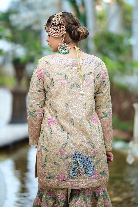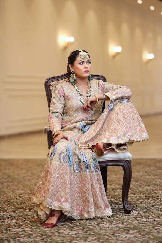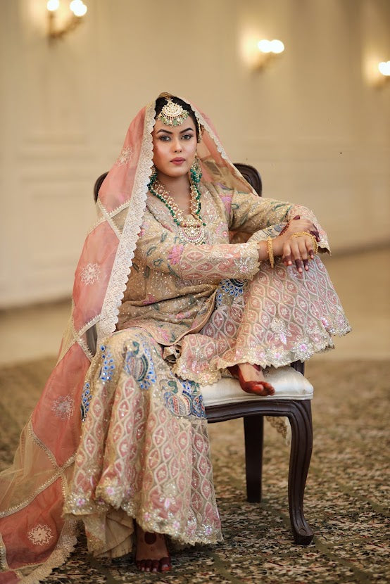 Featuring Gold Pink Tulle sharara with organza dupatta Dori embroided with chikankari and hand work.