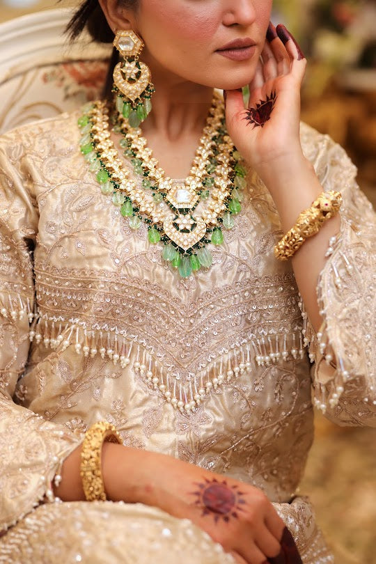 Featuring Gold Tissue Pakistani style with taffeta cigarette pants Embroided with Hand and aari work.