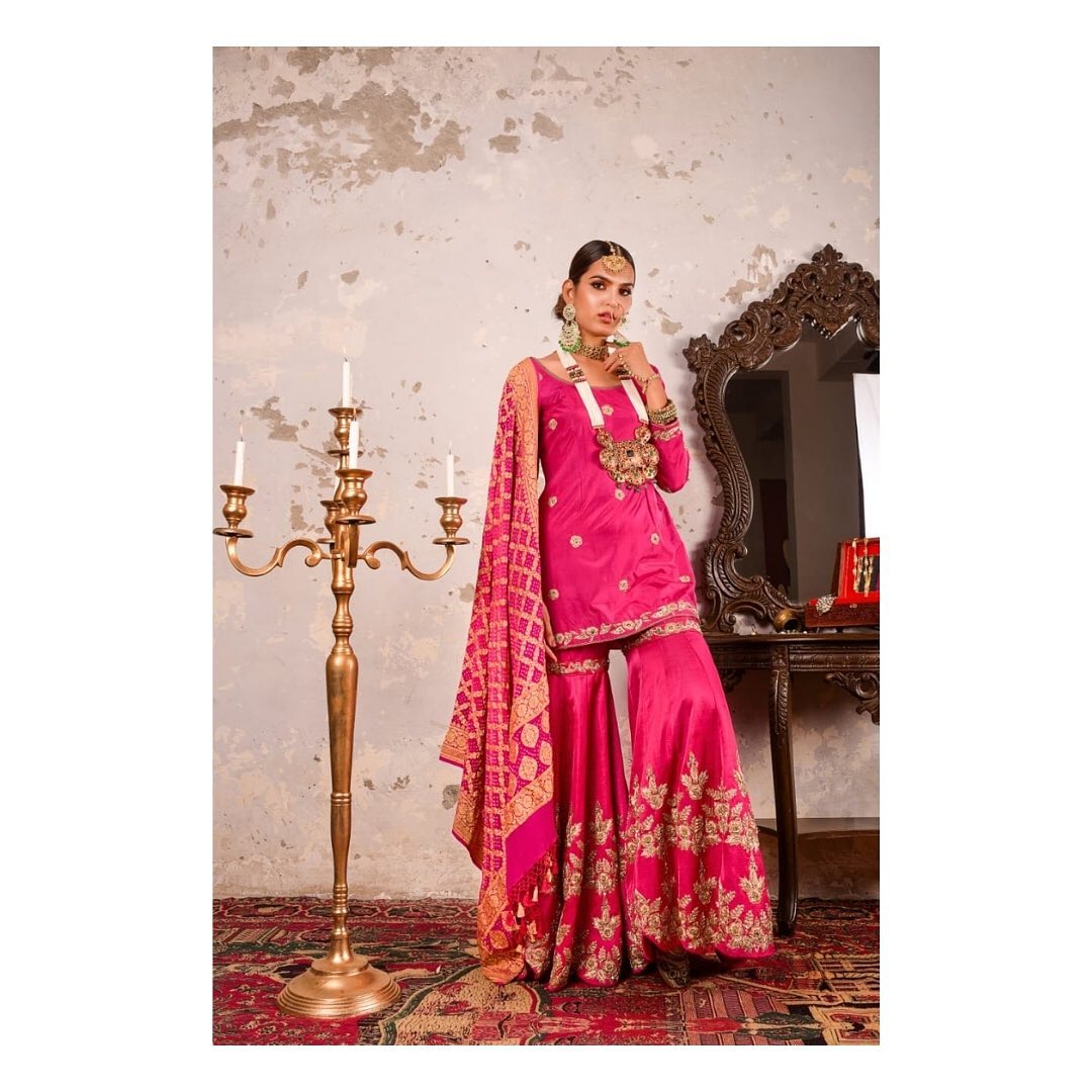 FEATURING PURE SILK PINK SHARARA SET WITH PURE BANDHEJ DUPPATTA WHICH IS FULLY HAND EMBROIDED AND IT IS 3PCS IN SET.