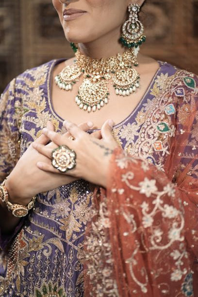 Featuring Purple Pure silk Chanderi lehenga with tulle dupatta with emb. Aari and hand work