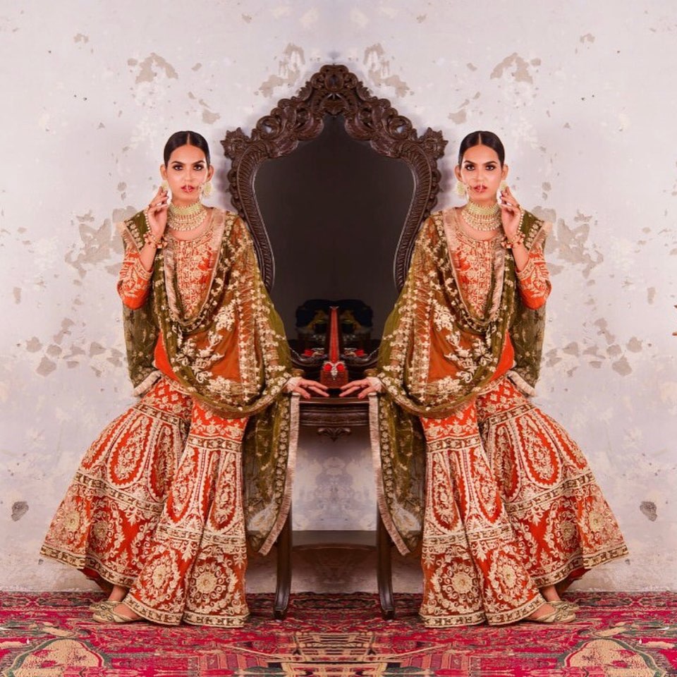 Featured Rust Colour Tulle based Sharara Hand and Aari work Rust with olive green dupatta. It is a 3 piece set.