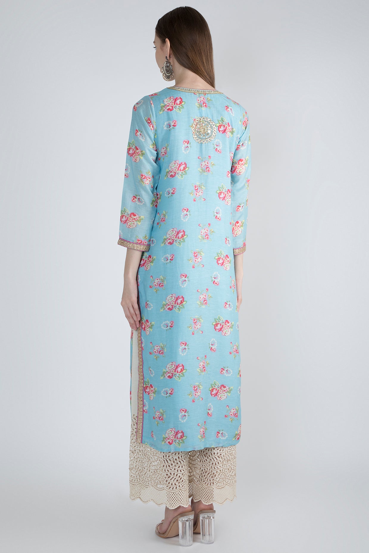 | Featuring A Blue Kurta In Linen Georgette Base With Print. It Has Hand Embroidered Gota Work Neckline And Slit Detail. |