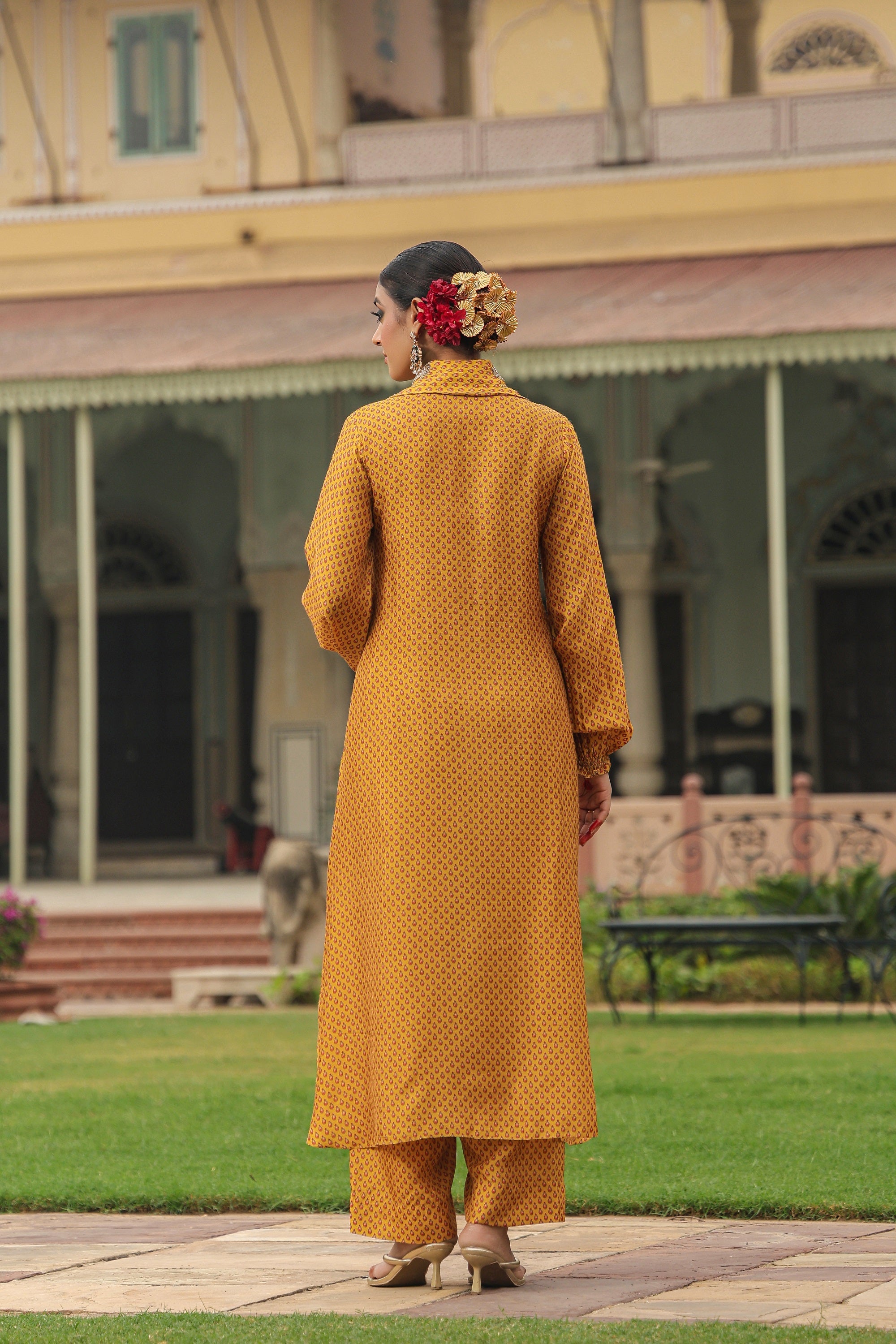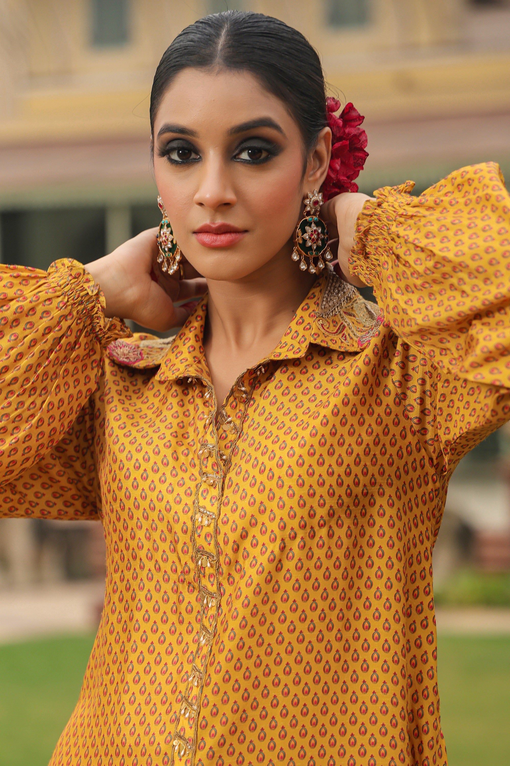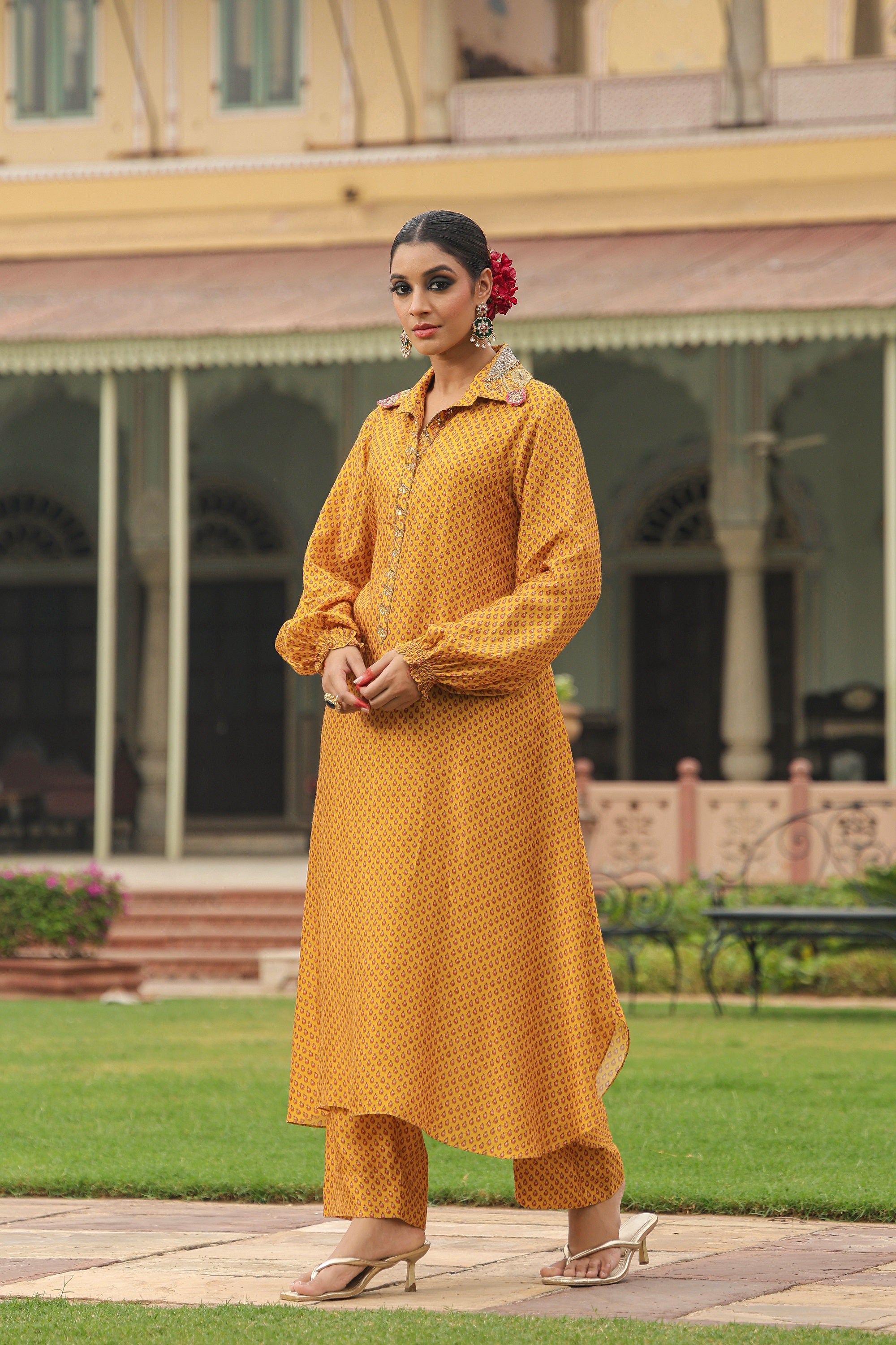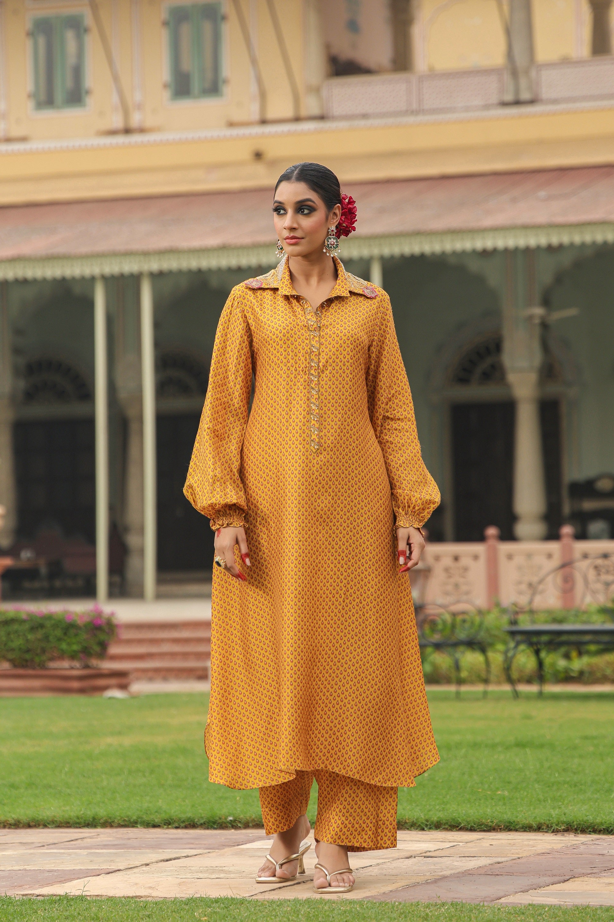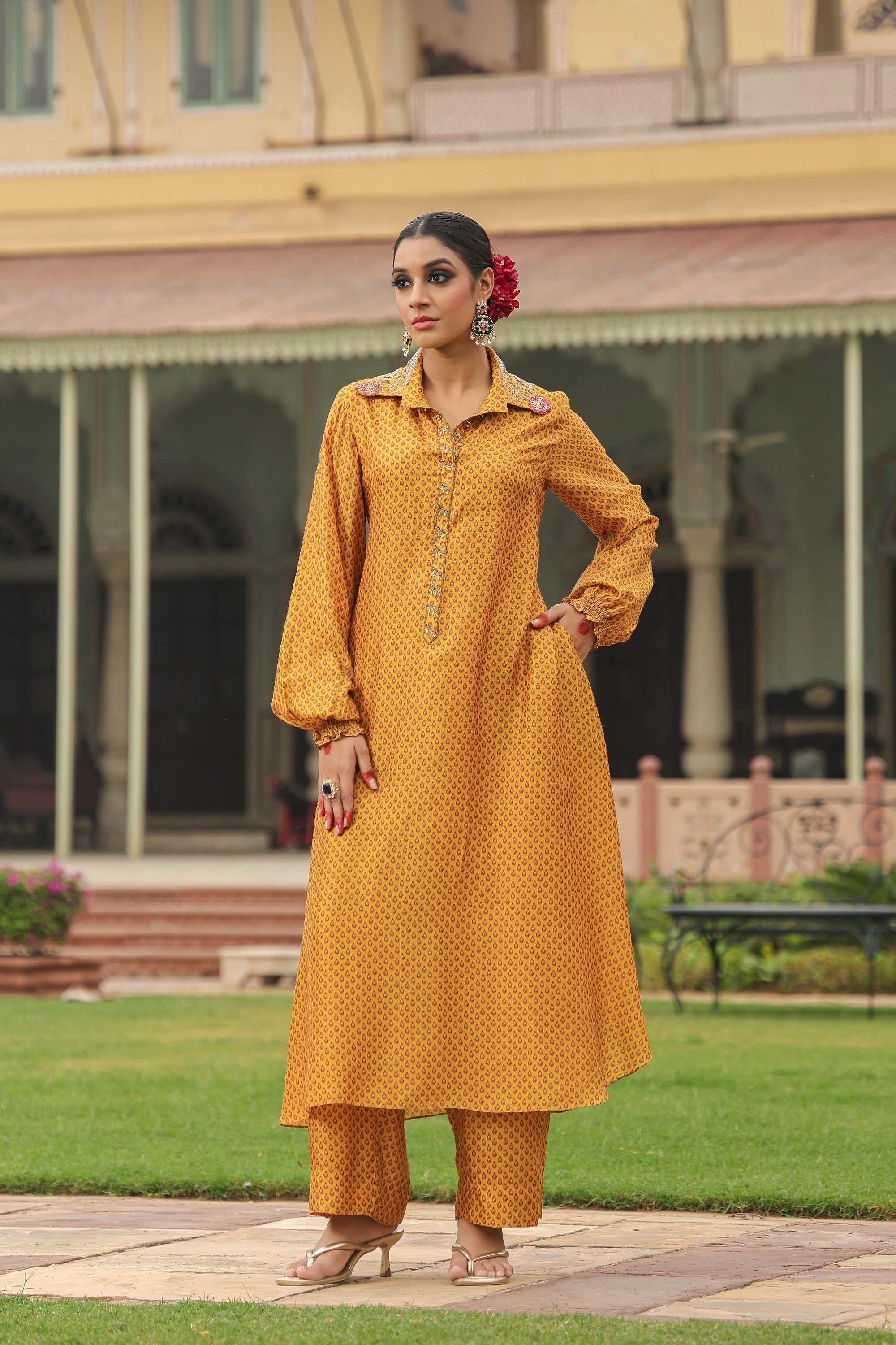 | This 2 pc Kurta Set comes with Balloon sleeve , applique motifs enhanced with pearls, zari and resham details on the collar Paired with applique motifs straight pants |