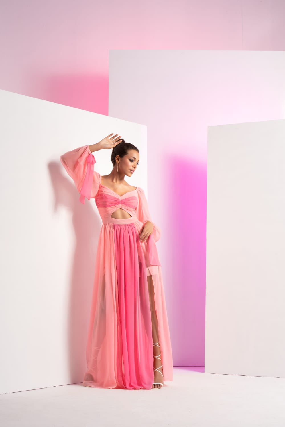 Fondant pink long dress with sleeve tie-up and front slit in skirt