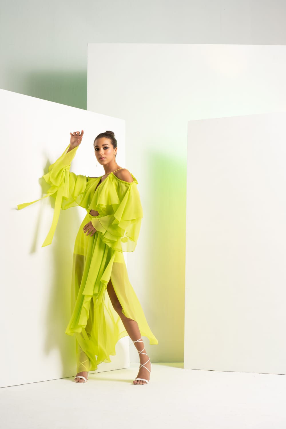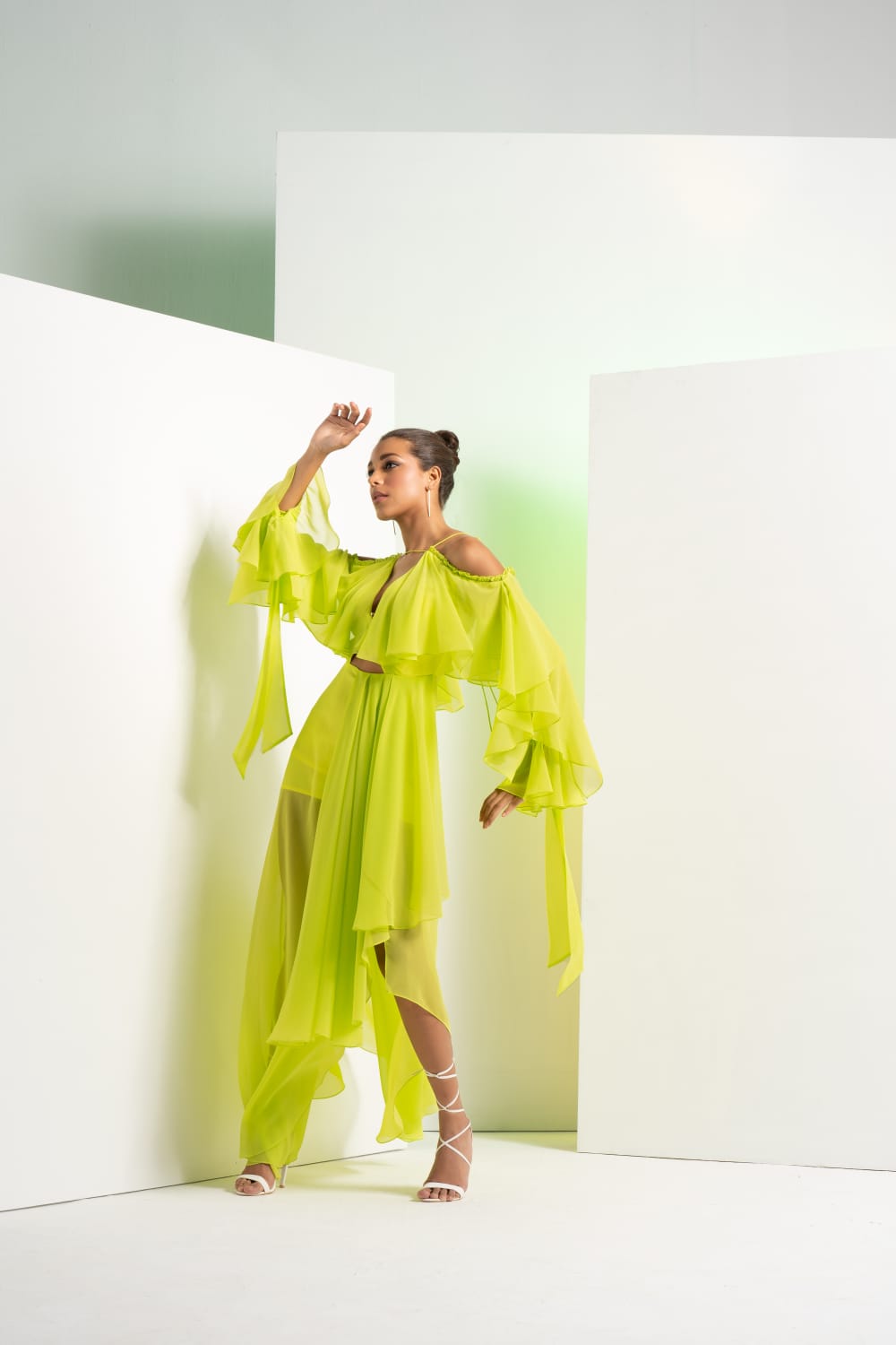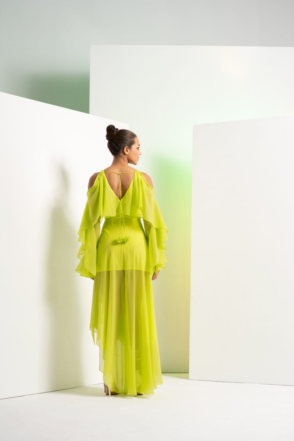 The Lime Green Asymmetric dress with cascade sleeves is a striking and contemporary garment that oozes vibrancy and style. The eye-catching lime green hue exudes energy and freshness, making it a bold choice for those who want to stand out. The asymmetric design adds a touch of modern flair and drama, while the cascade sleeves bring an element of whimsy and movement to the ensemble. This dress is a perfect choice for anyone looking to make a fashion statement at a special event, as it seamlessly blends boldness and grace, creating a look that's as unique as it is captivating.