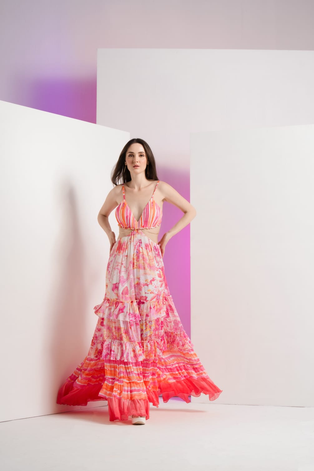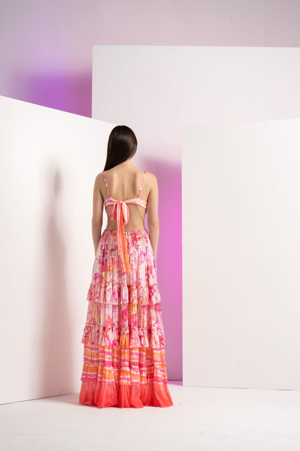 Pink fancy fusion full length dress with stylized chain at waist and tie up back