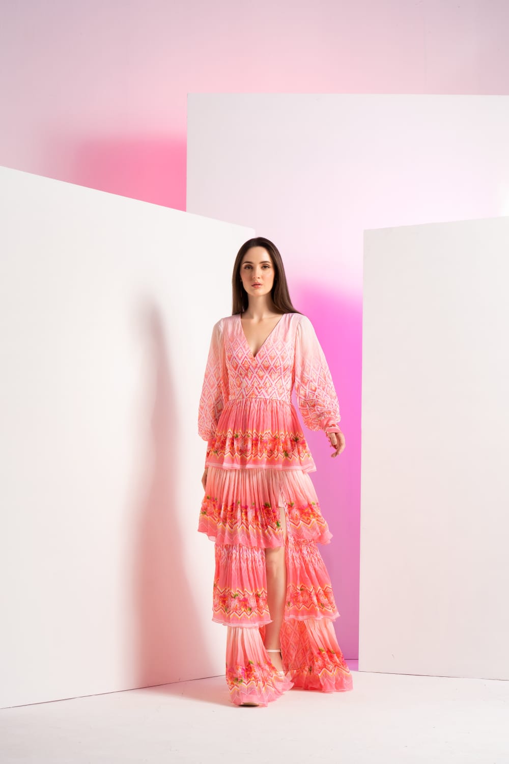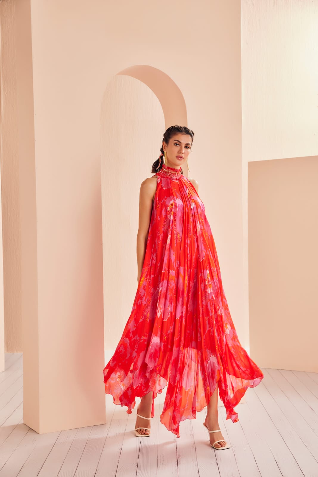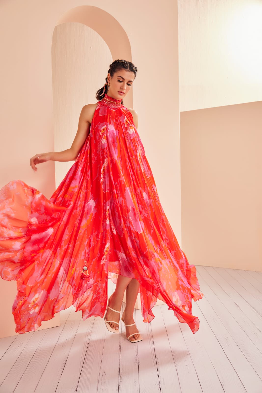 Printed chiffon high-low dress with entence hand-embroidered collar