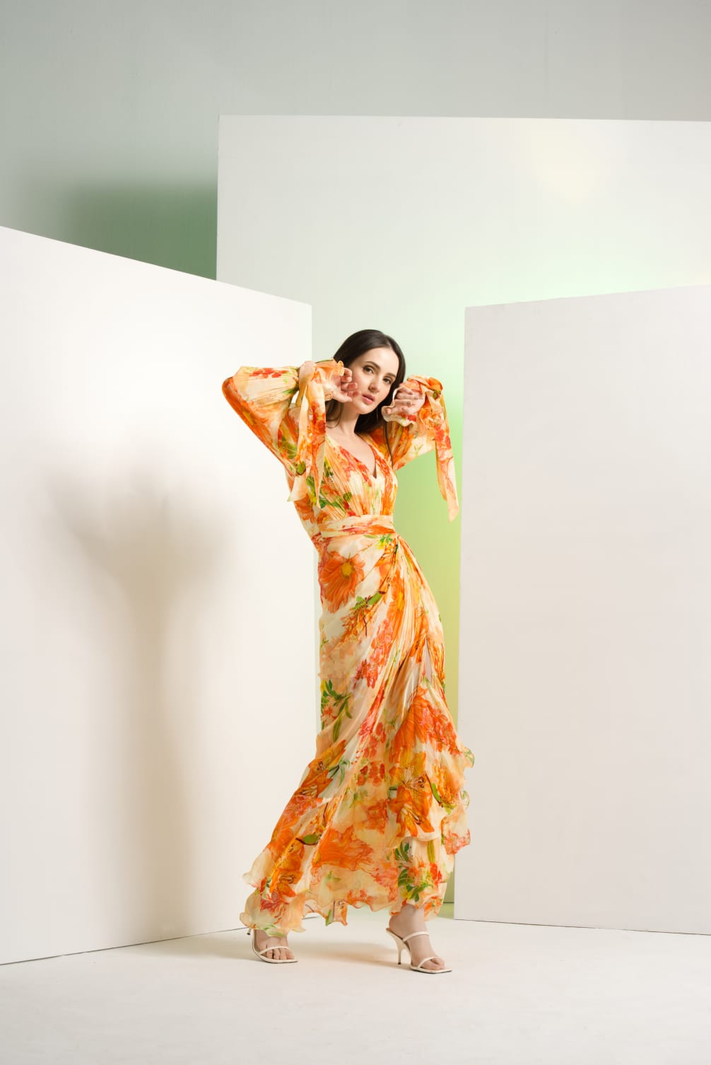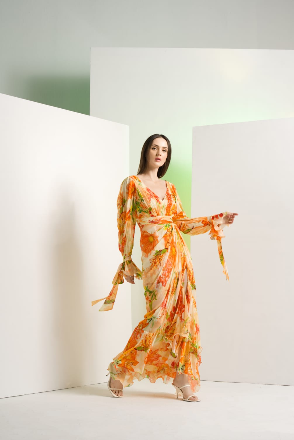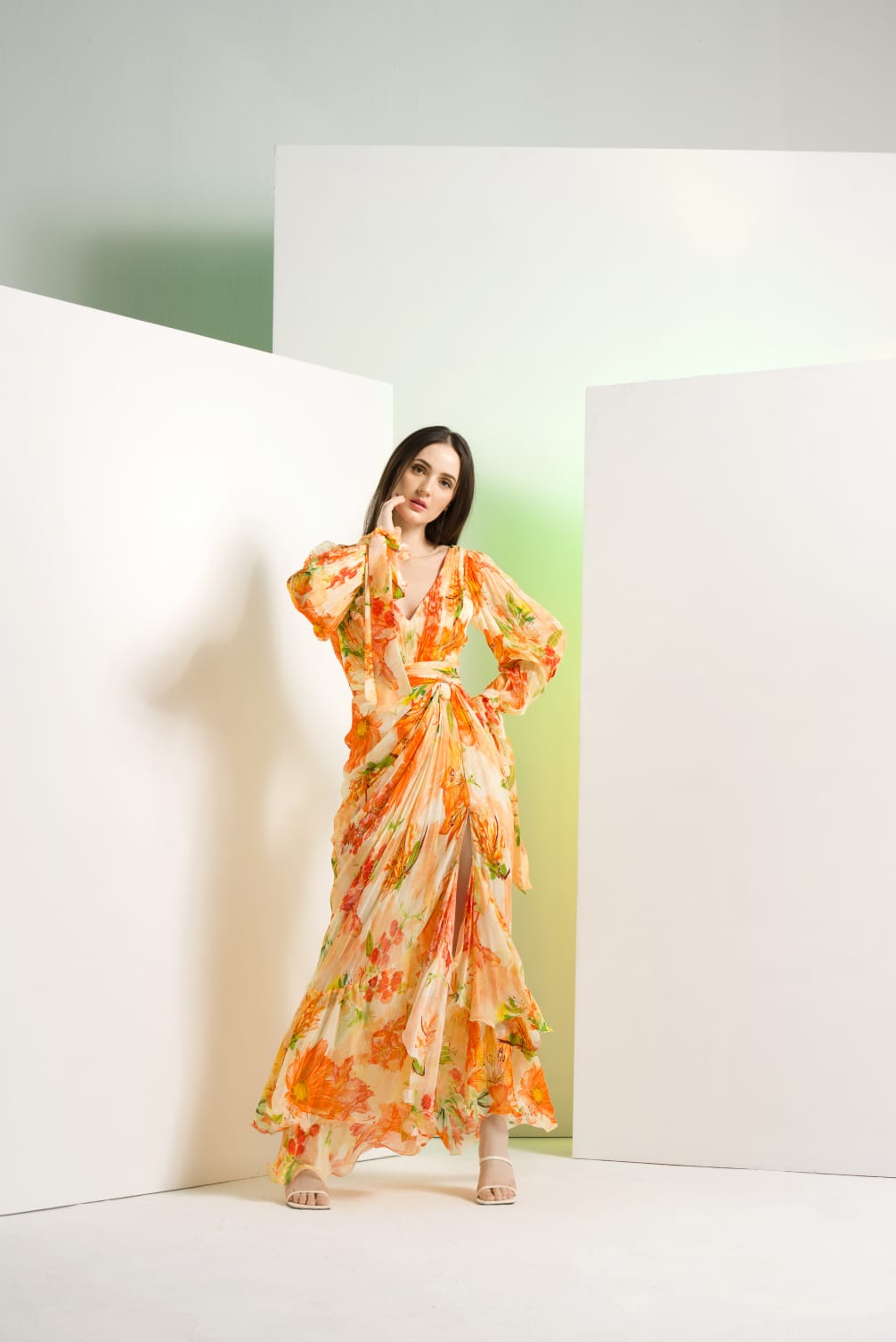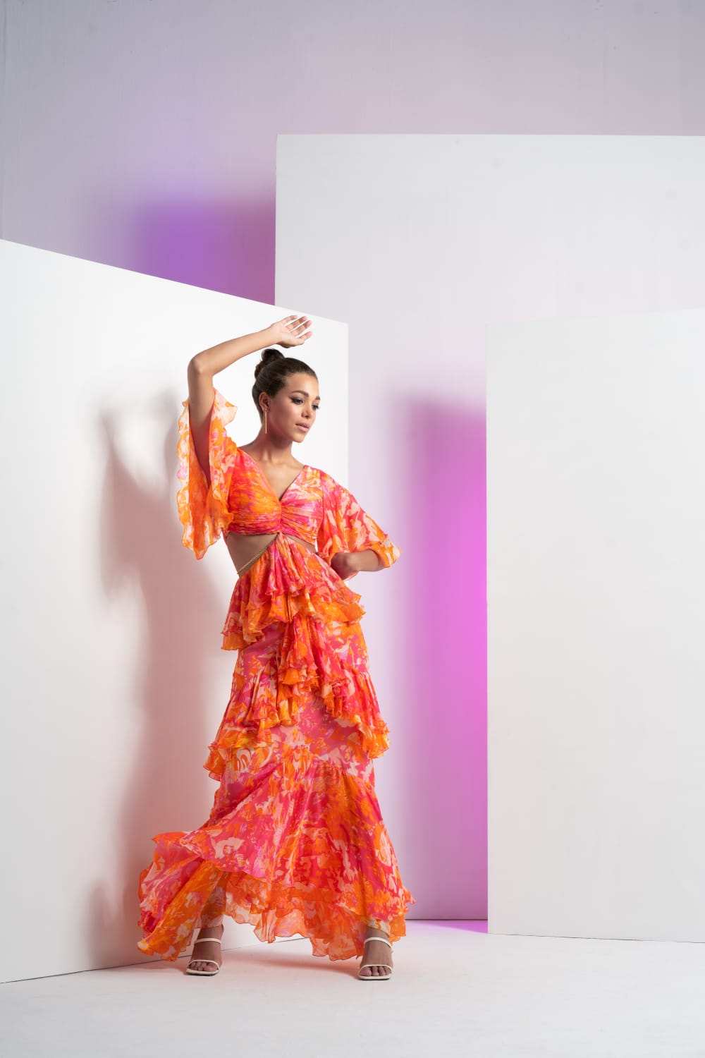 Printed chiffon high-low dress with entence hand-embroidered collar