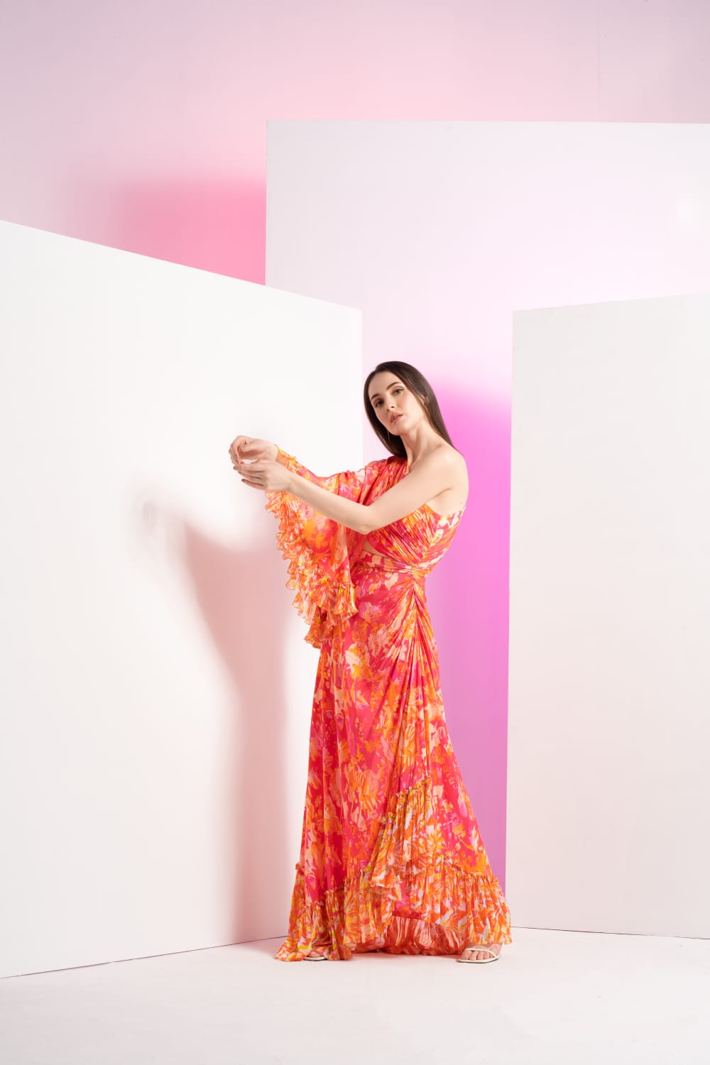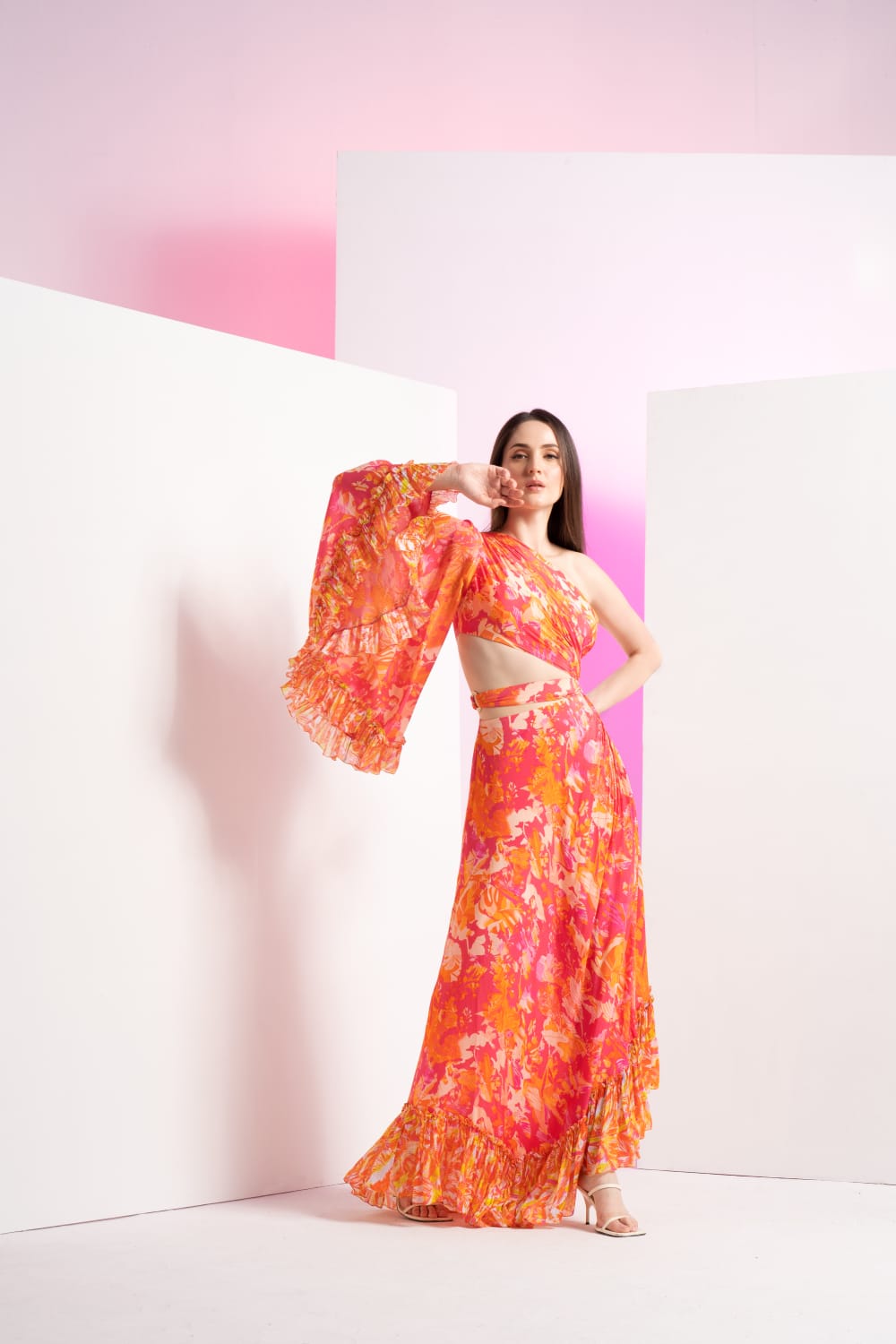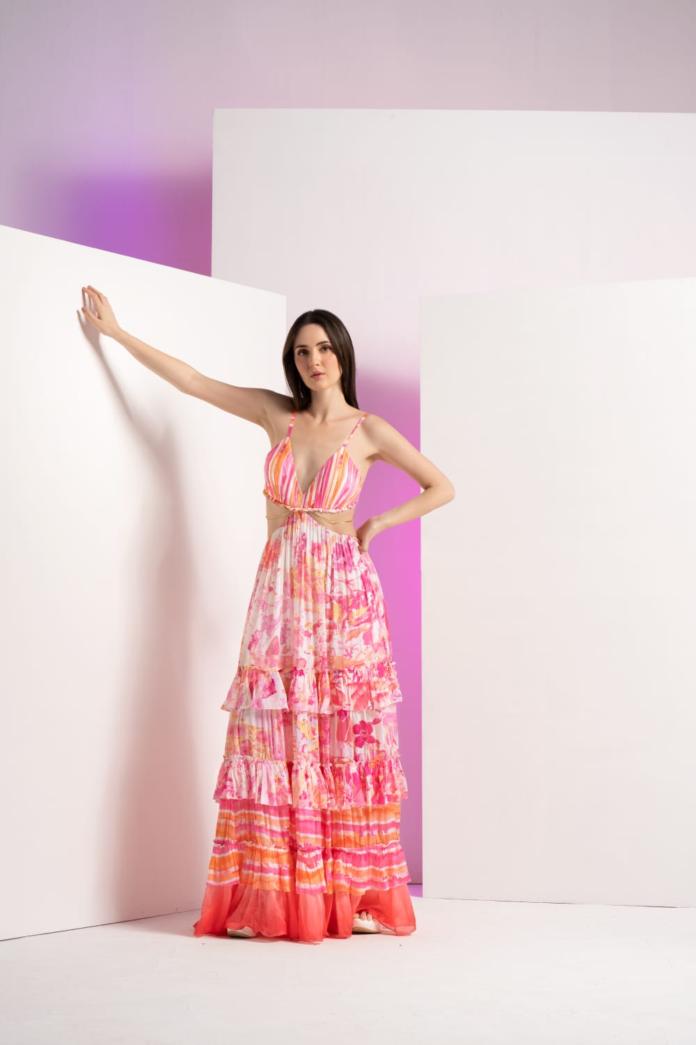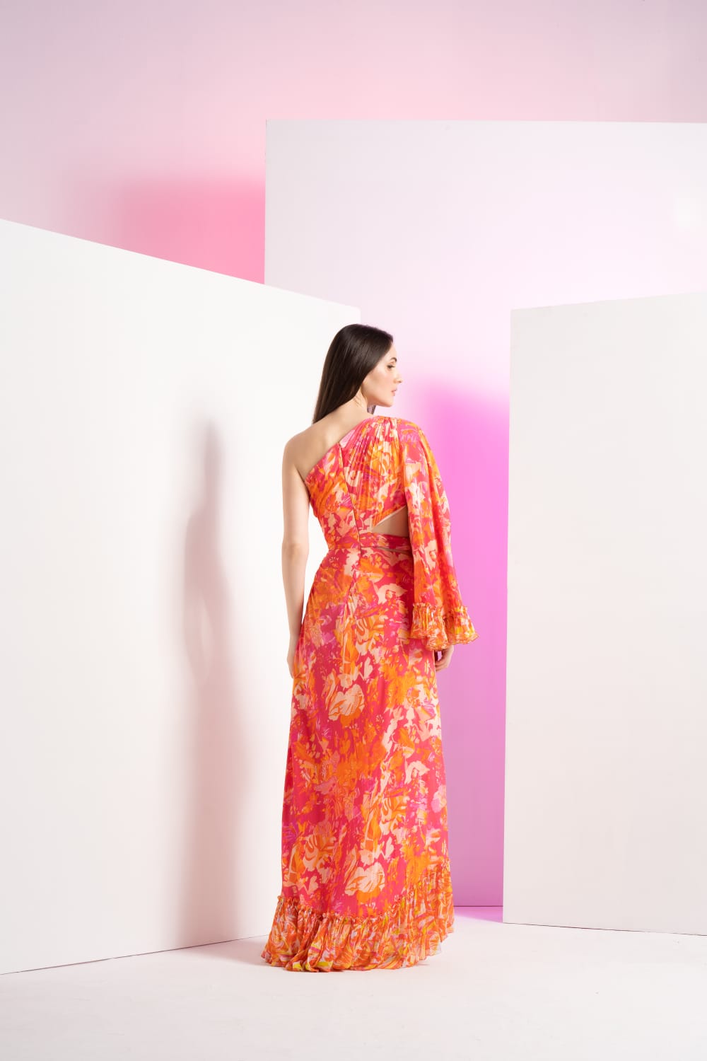 Pink twisted femme asymmetric full length dress with stylized ring at waist
