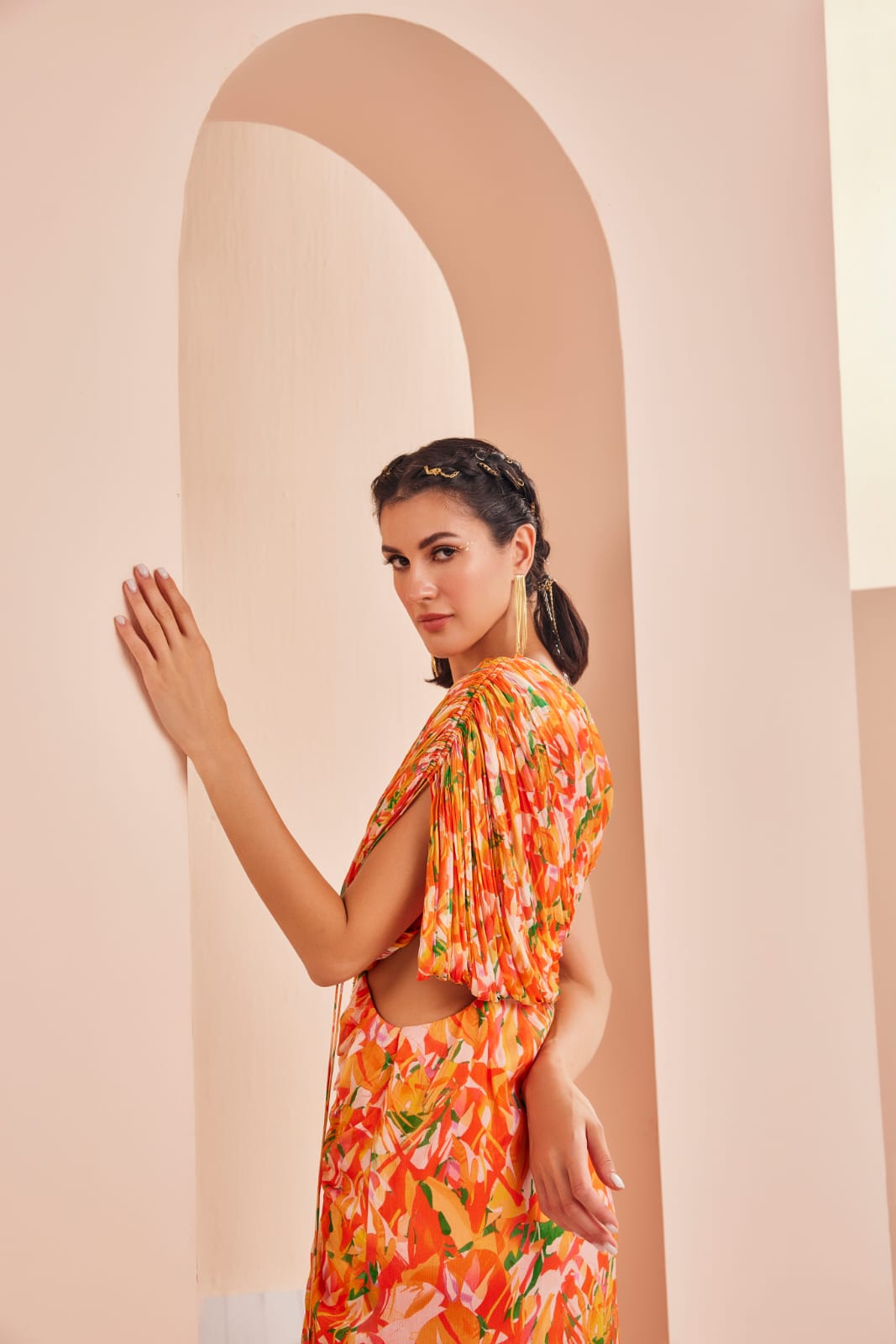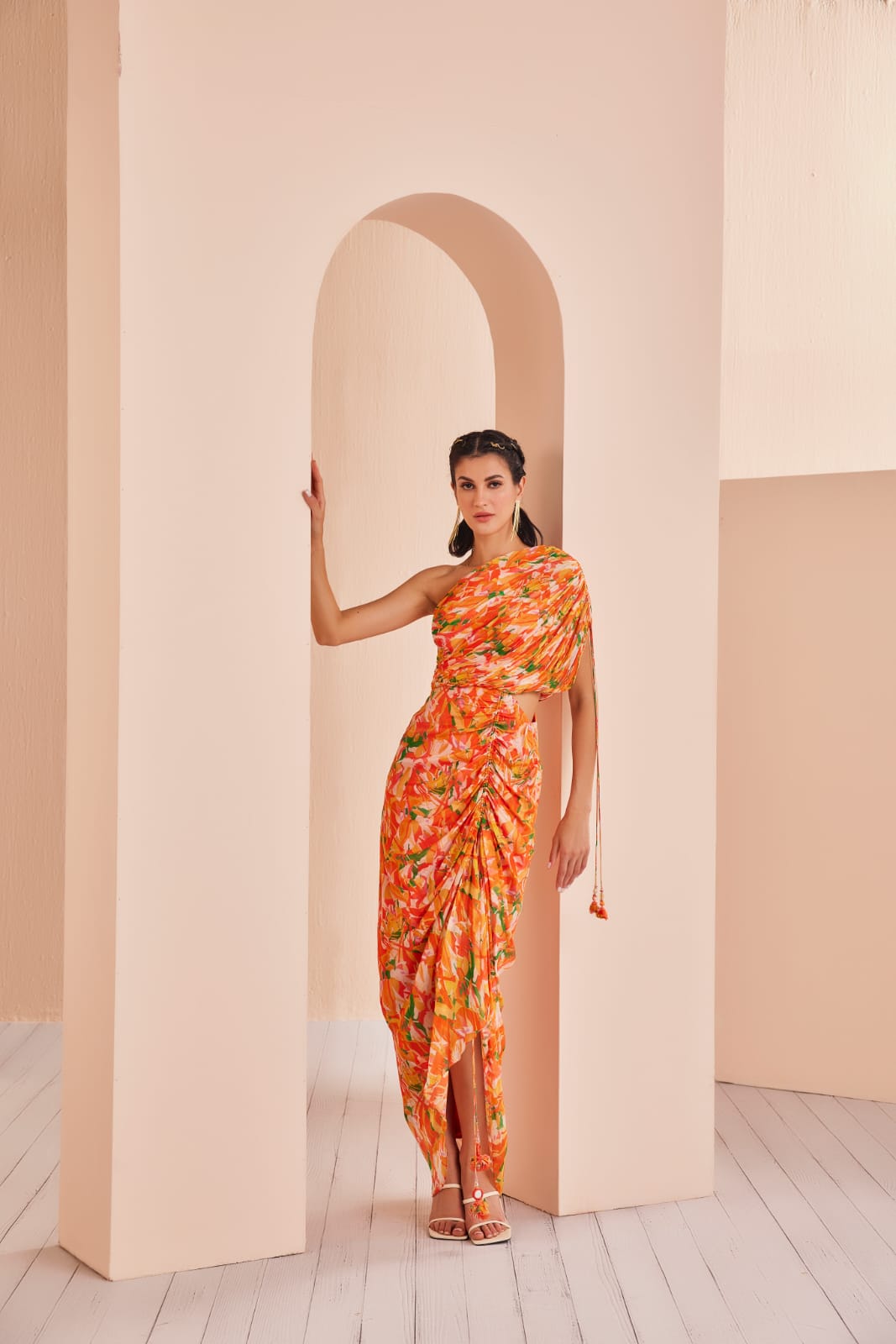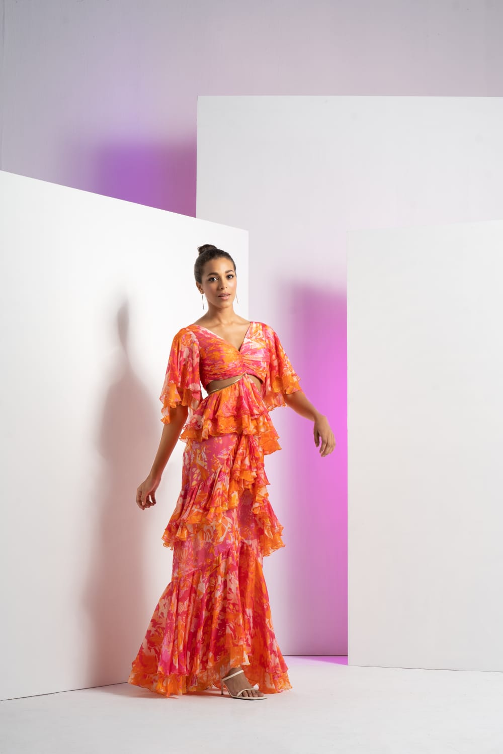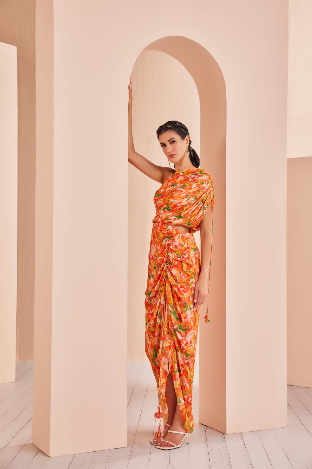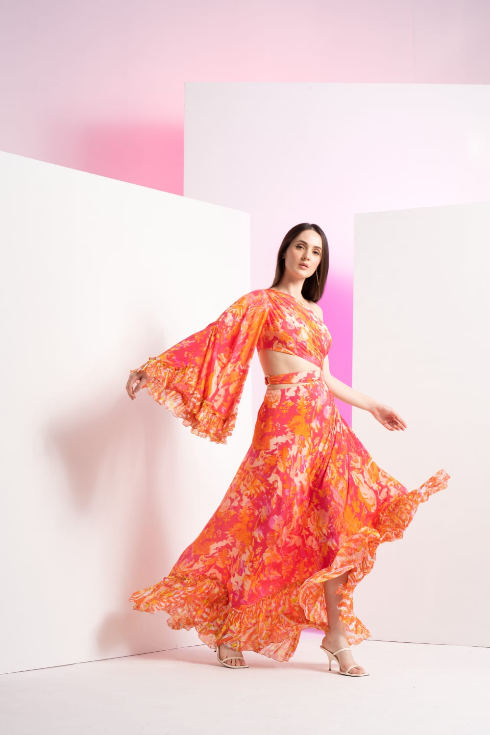 Pink twisted femme asymmetric full length dress with stylized ring at waist