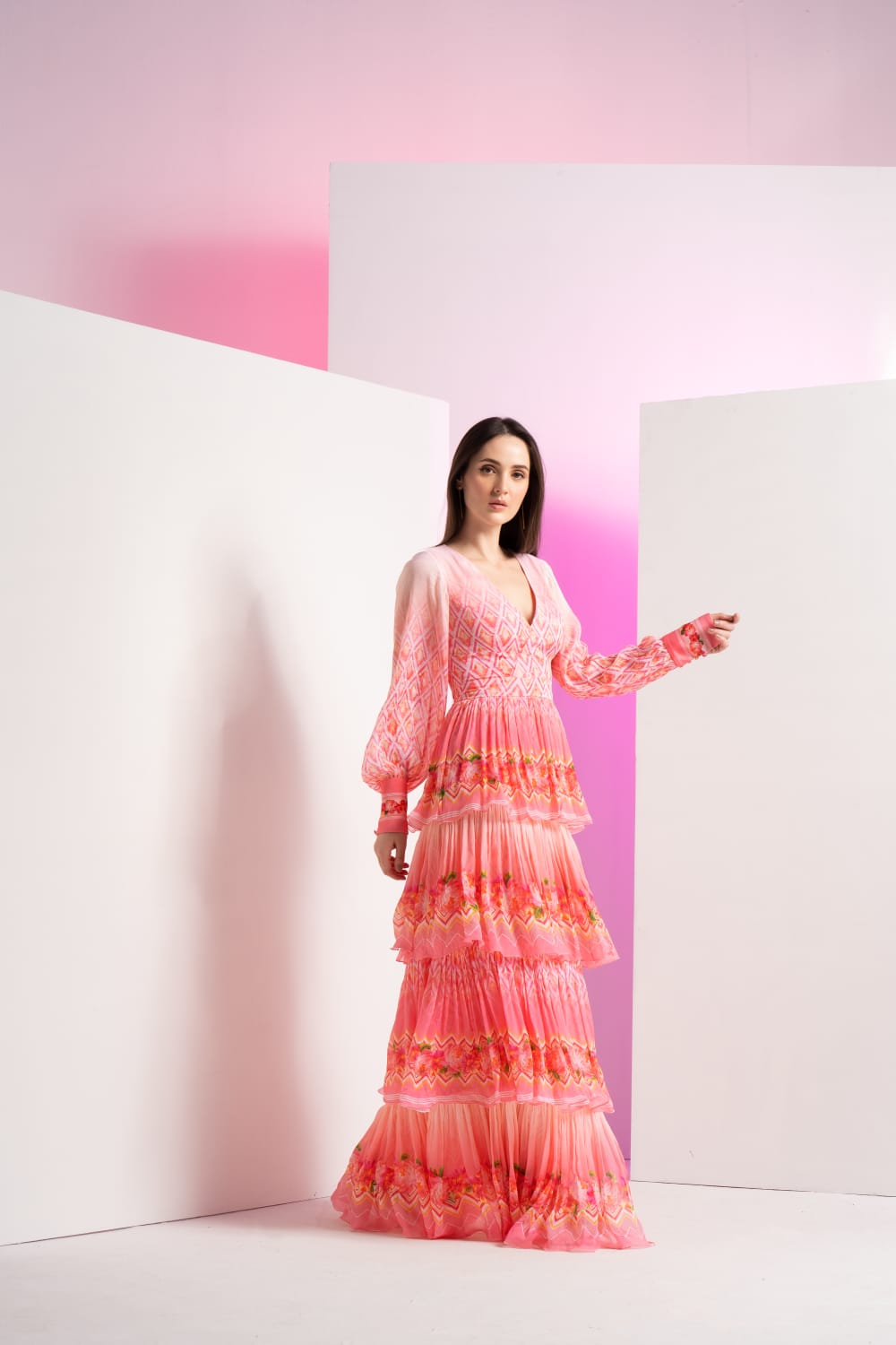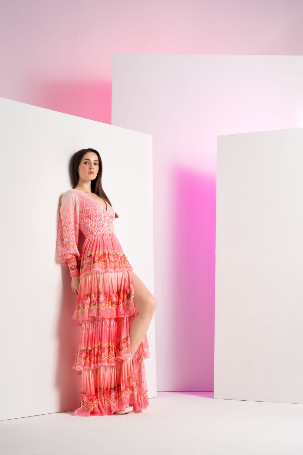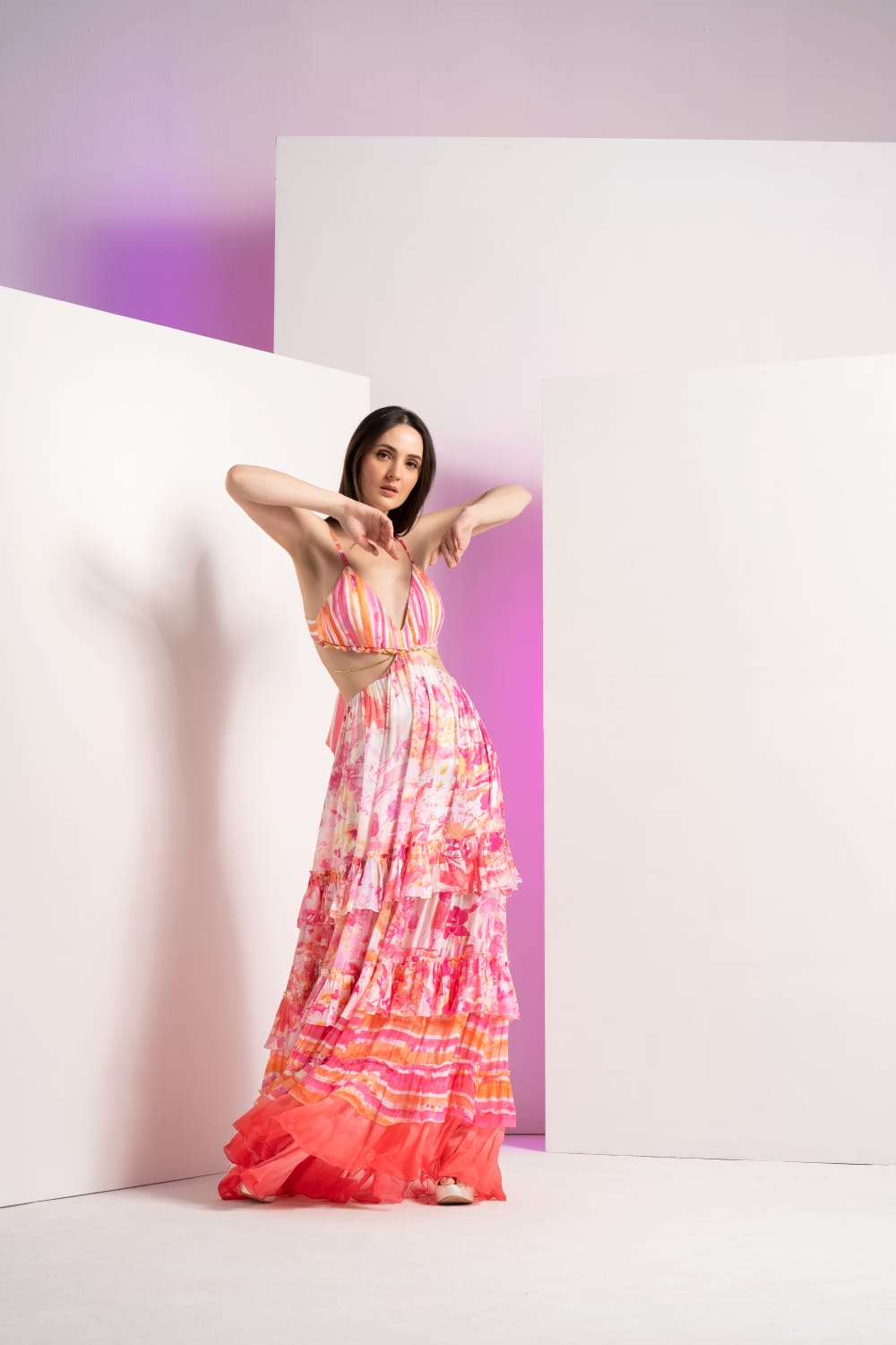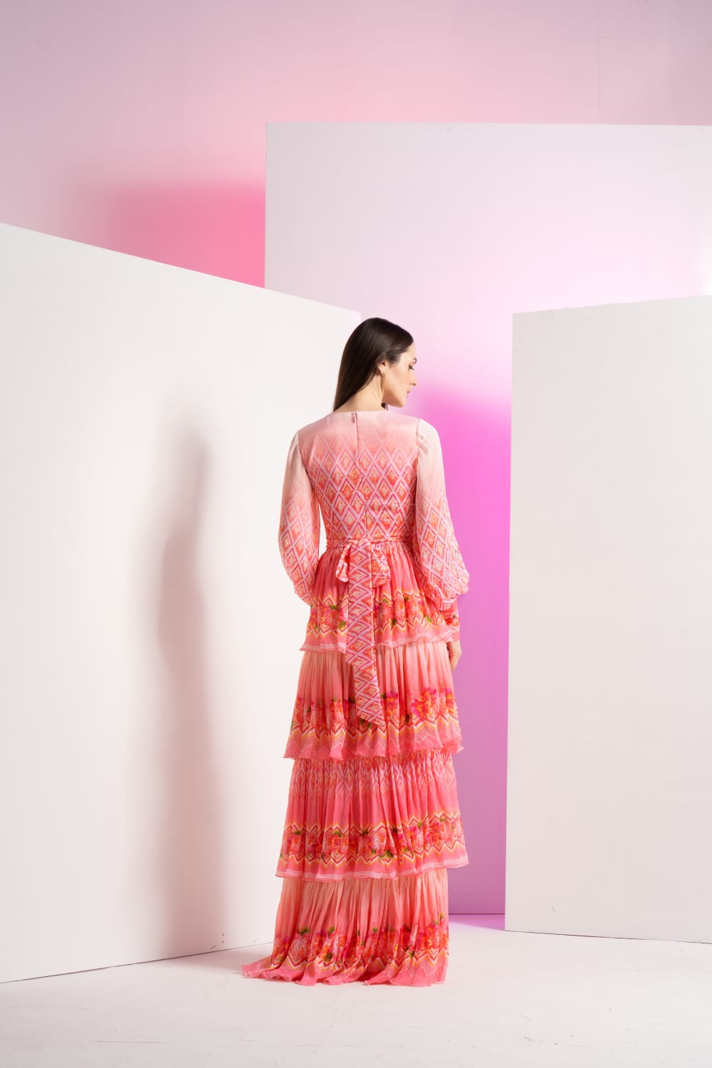 Pink fancy fusion full length dress with stylized chain at waist and tie up back