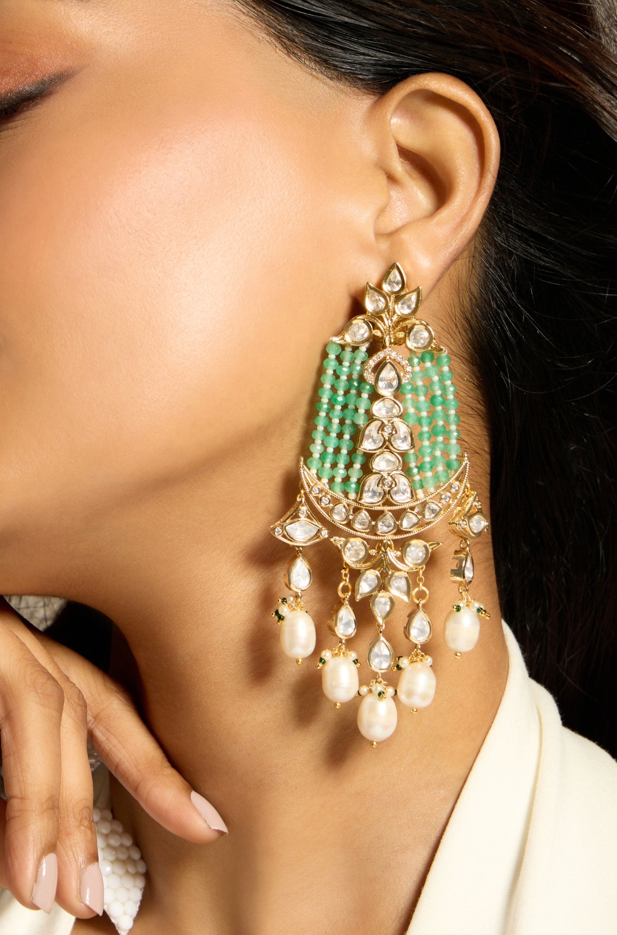 | Pearl Garden Dangles bring together the classic allure of polki and pearls with a fresh touch of green beads. These earrings offer a perfect blend of tradition and modern elegance, with pearls gently cascading from a polki-studded base and vibrant green beads adding a lively finish. Ideal for both festive celebrations and formal events, they are designed to enhance your look with grace and charm. |
