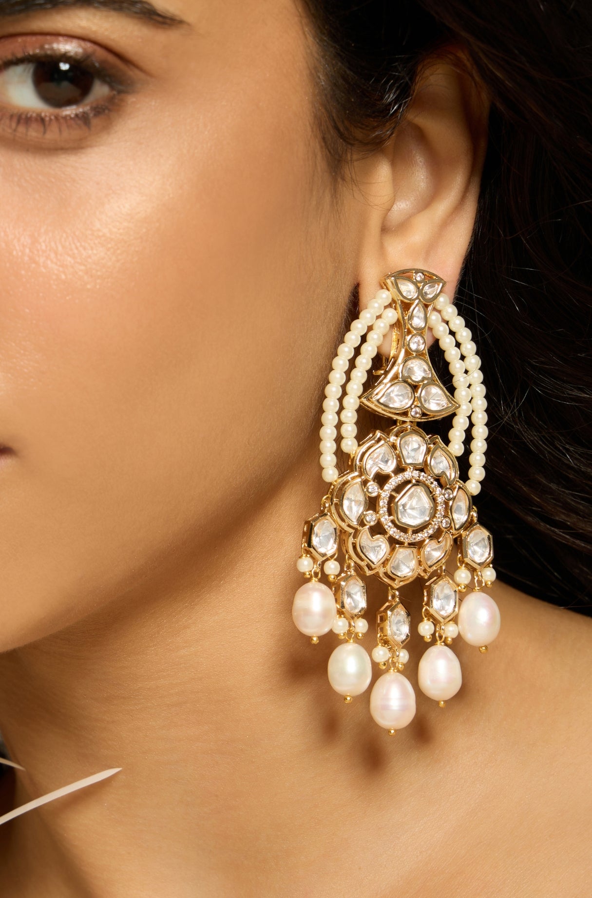 Timeless Pearl Polki Dangle Earrings Are An Exquisite Blend Of Elegance And Charm, Featuring An Oval Shape That Beautifully Frames The Face. Adorned With Shimmering Polki Stones And Delicate Pearls, These Earrings Radiate A Classic Beauty Perfect For Any Special Occasion. Their Graceful Movement And Intricate Detailing Make Them A Standout Piece, Ensuring You Shine Effortlessly, Whether At A Festive Celebration Or An Intimate Gathering.