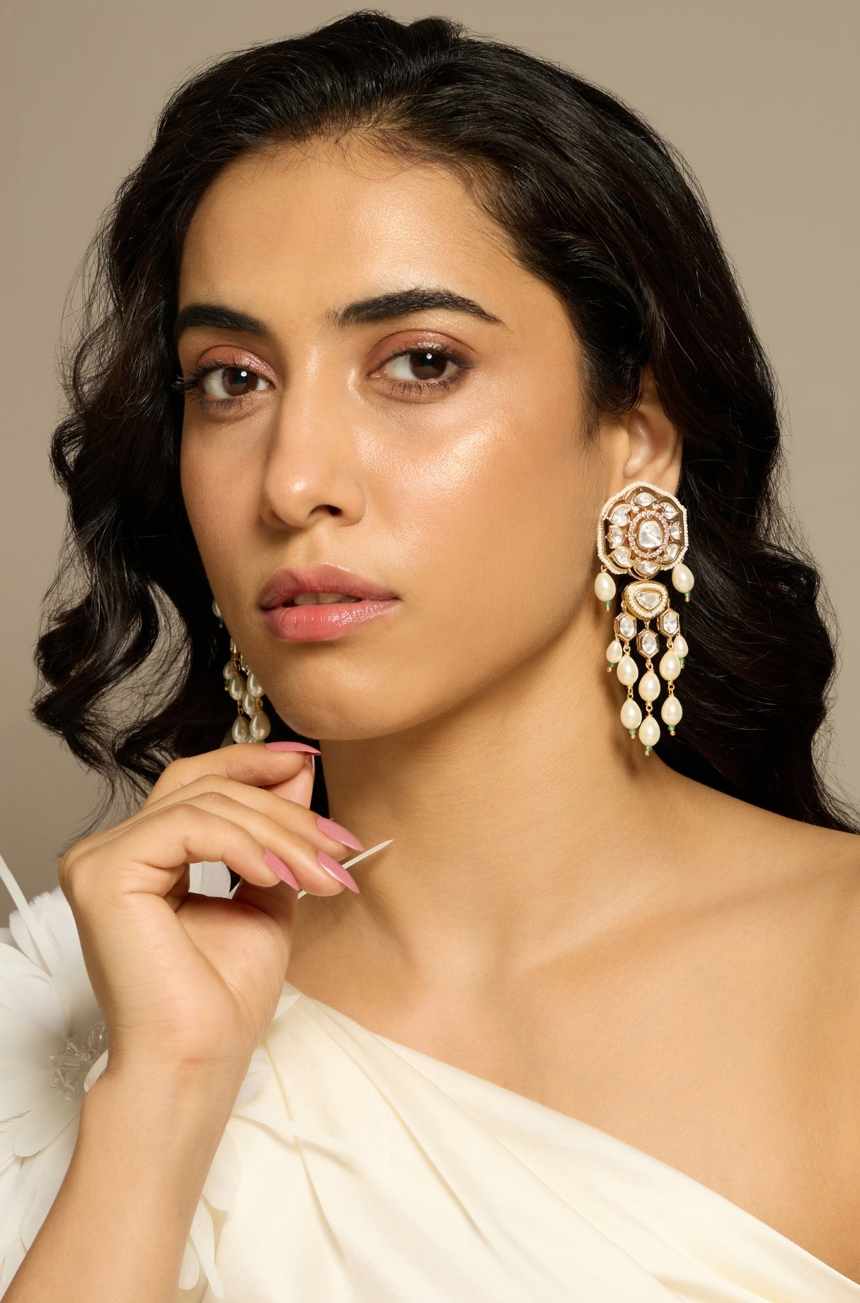Whispering Elegance Dangles Feature Delicate Polki Stones Complemented By Lustrous Pearls, Creating A Refined And Charming Accessory. These Small Earrings Effortlessly Capture Attention With Their Subtle Shimmer And Intricate Design, Making Them A Perfect Choice For Everyday Wear Or Special Occasions. Their Lightweight And Graceful Form Ensures They Enhance Your Style While Adding A Touch Of Sophistication.
